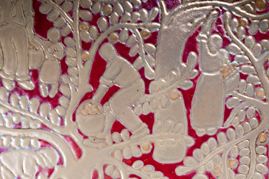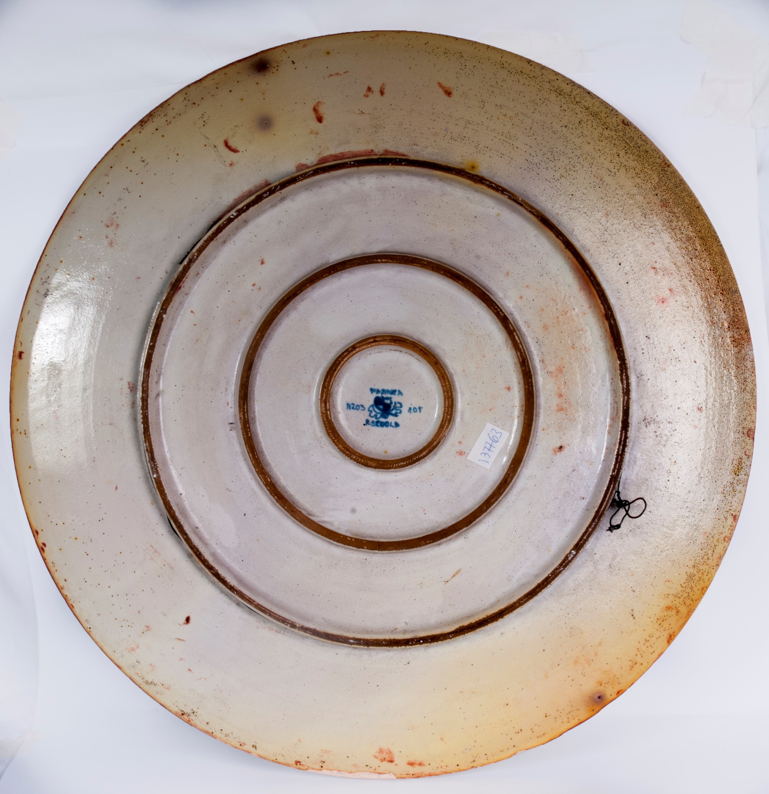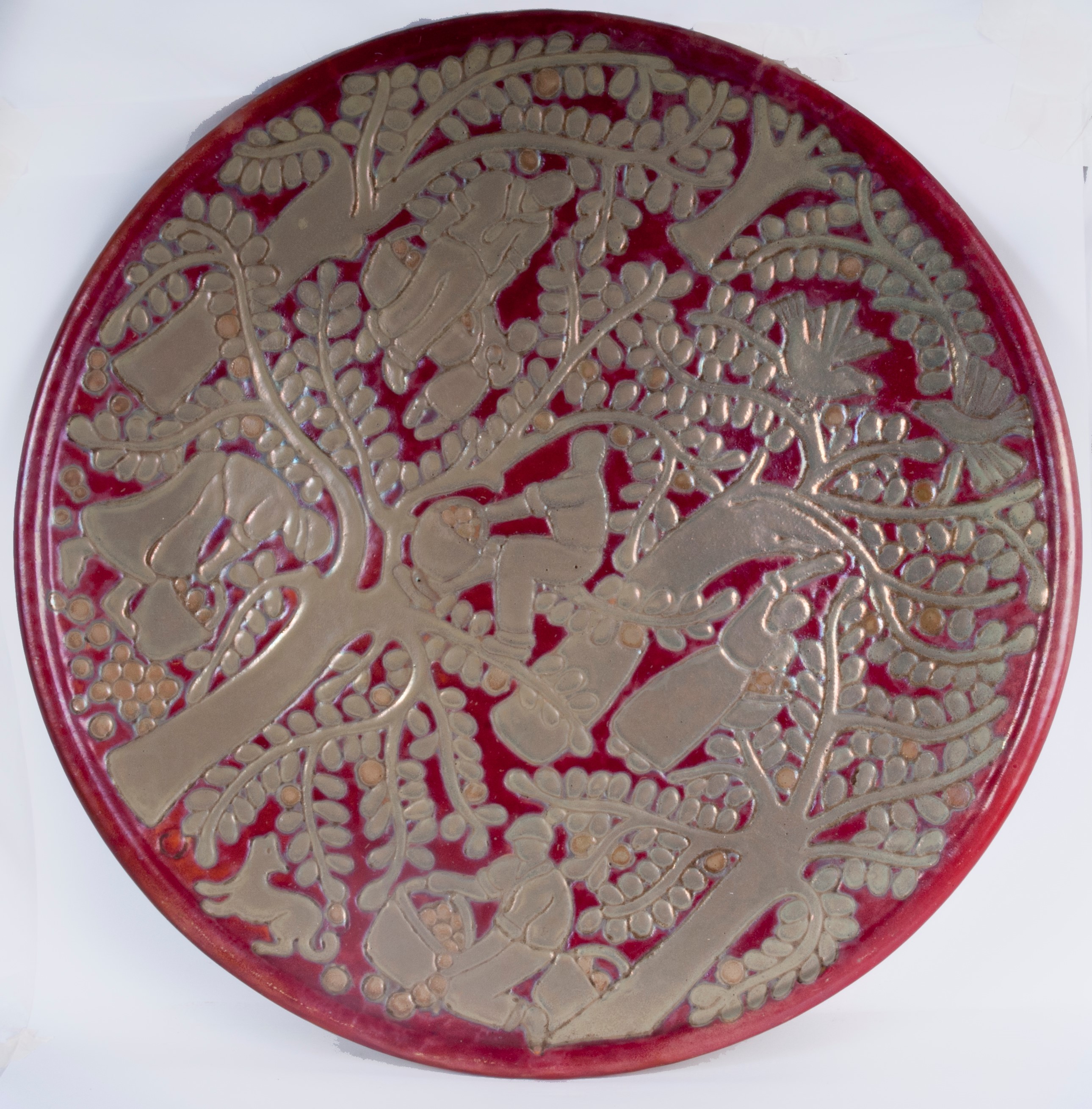 piatto da pompa in ceramica policroma a lustro metallico. Piatto liscio con cordone all'orlo e appoggio con doppio piede ad anello. Decoro con rilievo graffito su smalto  paglierino pallido ed avorio  su fondo rosso. Al retro in blu sotto smalto Faenza Reggia Scuola con la cifra numero 105 ed inventario n.  203. Eseguito con molta probabilità da   Melisenda Lama  su progetto di Domenico Rambelli. Il piatto fu esposto alla Triennale di Milano nel 1933 .