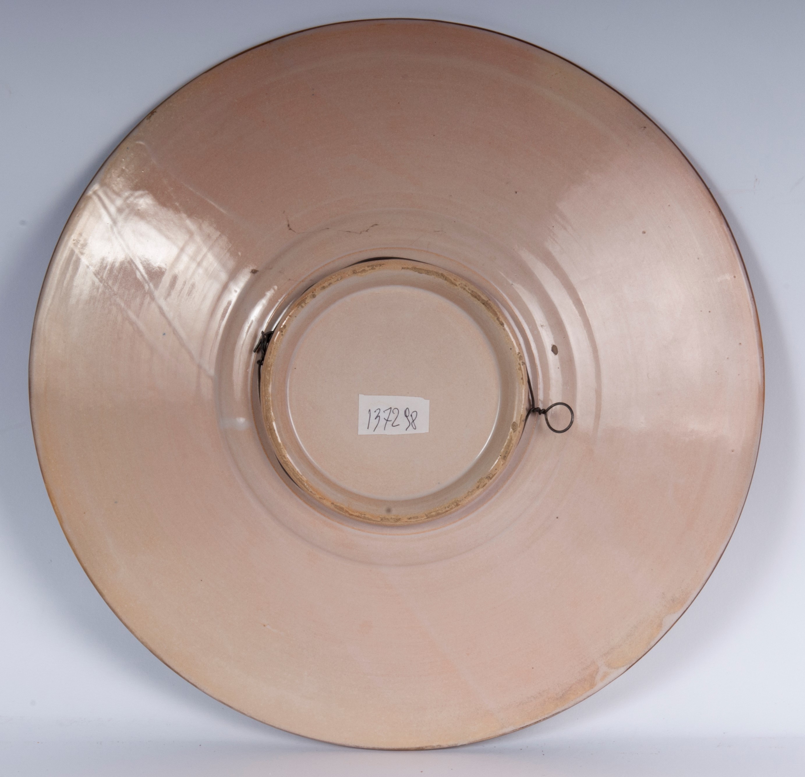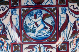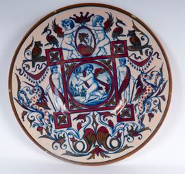 a tutto fondo con leggero incavo centrale. Decorato a putti ed animali fantastici entro riquadrature e riserve circolari in rosso rubino su fondo bianco, nelle cromie blu e giallo oro con la tecnica del lustro. Retro con appoggio ad anello a fondo ribassato. Orlo del piatto in oro a lustro. Piatto non firmato, ultimo quarto XIX secolo