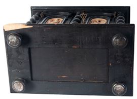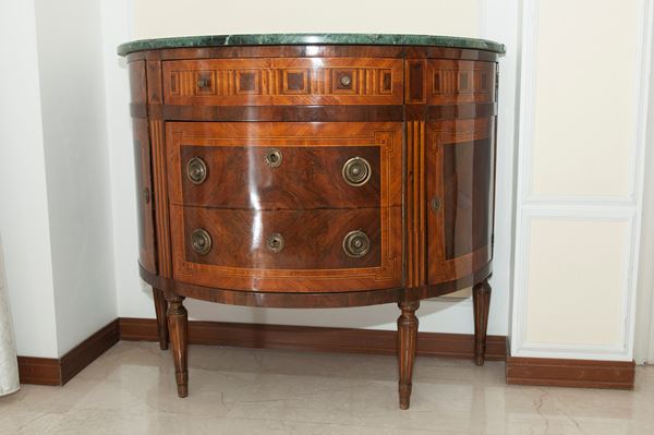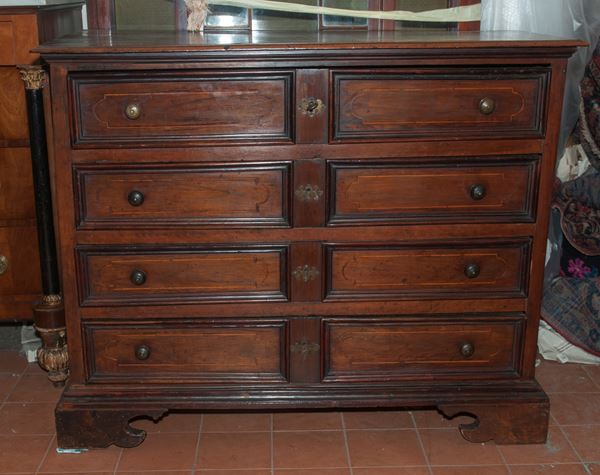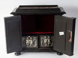 di forma rettangolare con elementi decorativi a colonne tortili, pannellature frontali , laterali e superiori con figure allegoriche ed amorini in pastiglia di gesso bianca. Due sportelli a vantaoux con all'interno due cassetti ed spazio rettangolare. Piede d'appoggio a bottone.