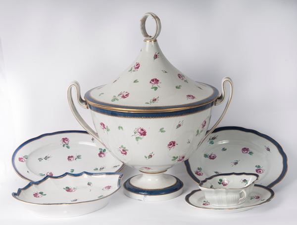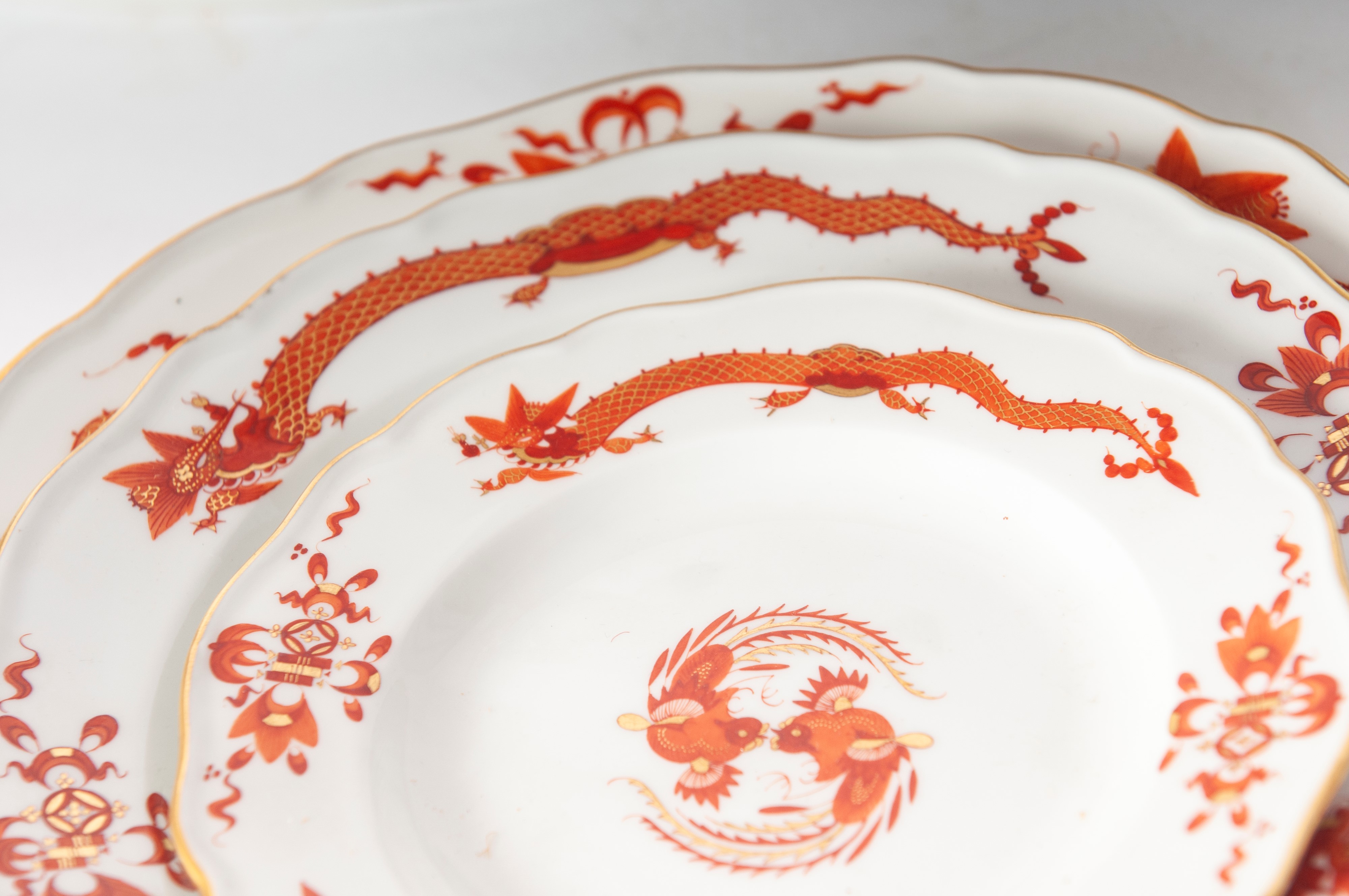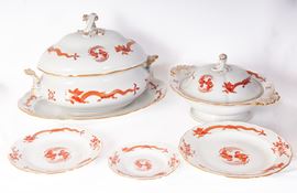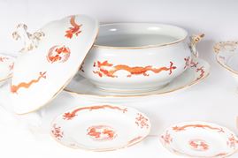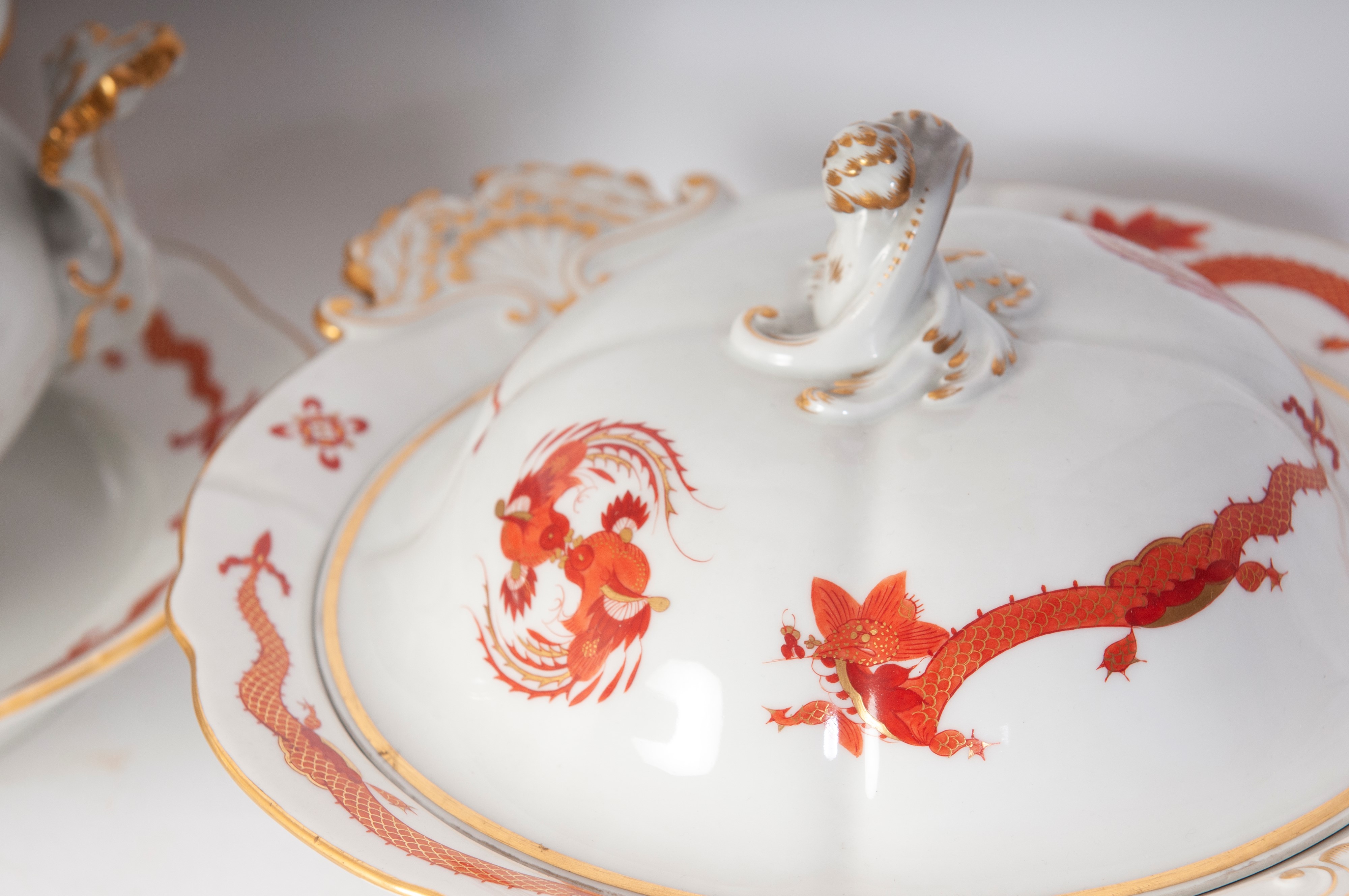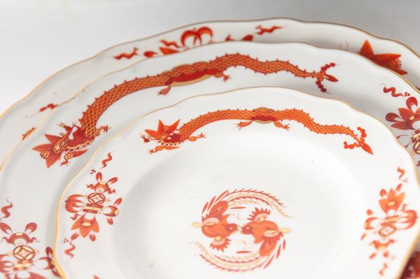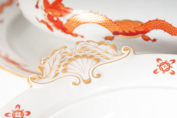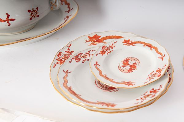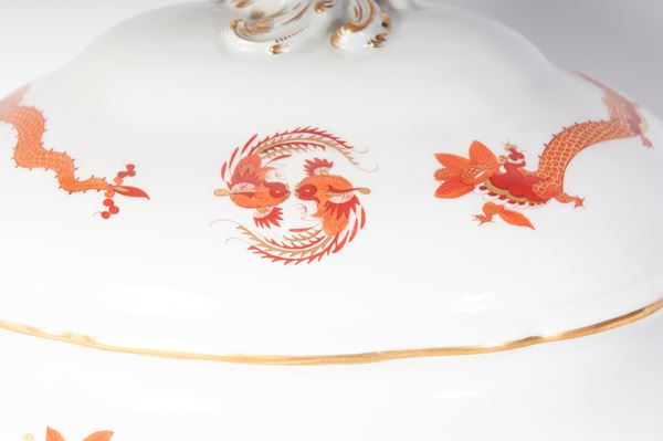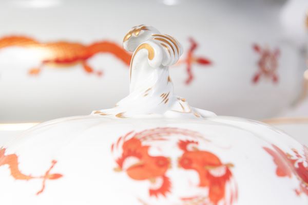 con draghi stilizzati e finiture in oro zecchino. Composto da sei scodelle 23,5 x 4,8 cm; sei piatti da coltello 25 x 3 cm; sei piatti da pane 15,8 x 2 cm; sei piatti da dessert 21,5 x 2,7 cm un piatto ovale di servizio 41,5 x 13,5 x 5,5 cm; un piatto tondo da portata 31,2 x 4,8 cm: una salsiera 26 x 9 x 20 cm; un vassoio ovale piccolo 26,5 x 18,5 x 4,5 cm; una zuppiera 26 x 37 x 22 cm; portavivande con coperchio 17 x 33 x 16,6 cm. pz. tot. 30 Manifattura di Meissen gestione Pfeiffer