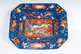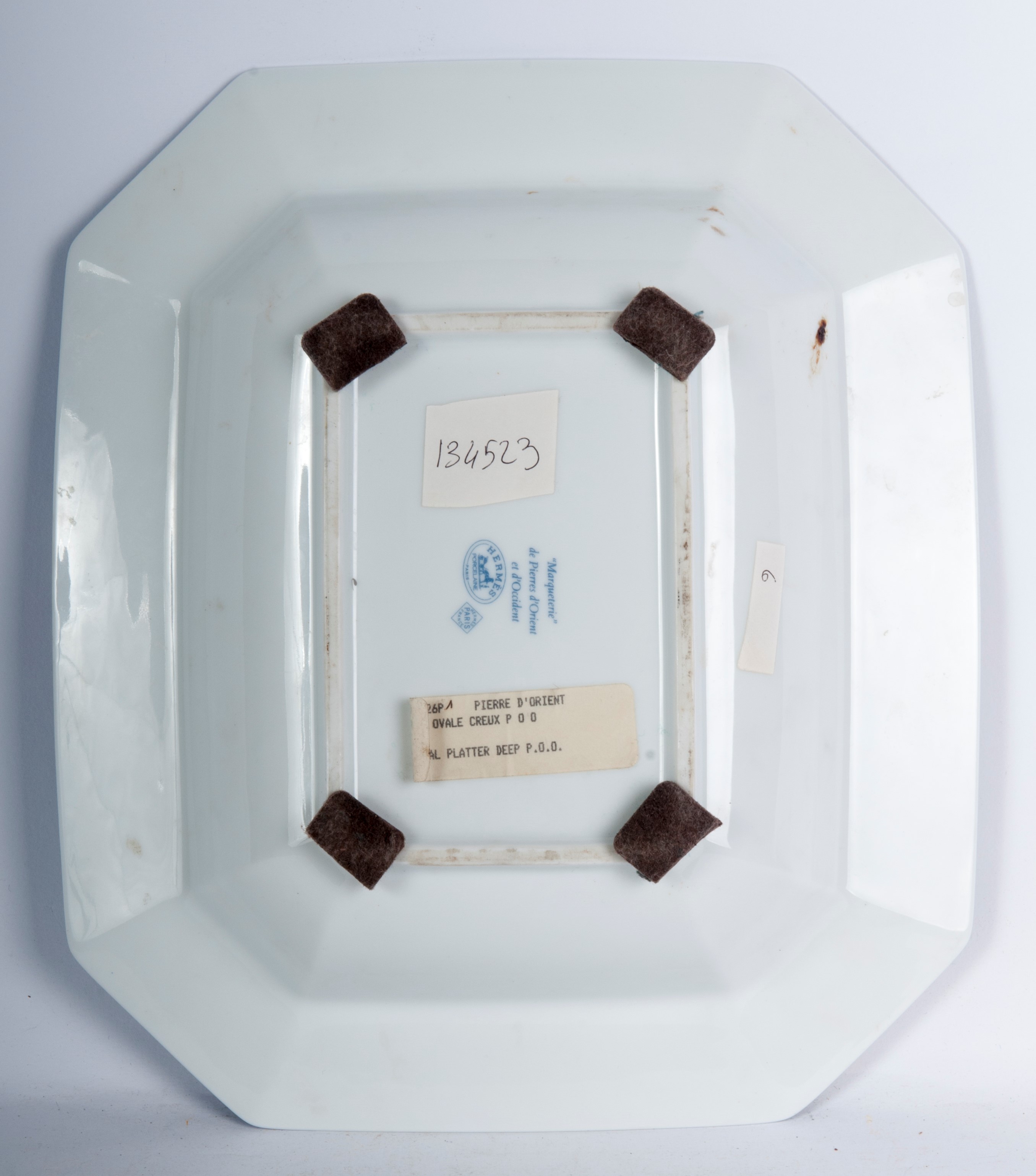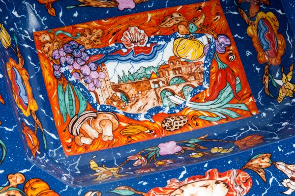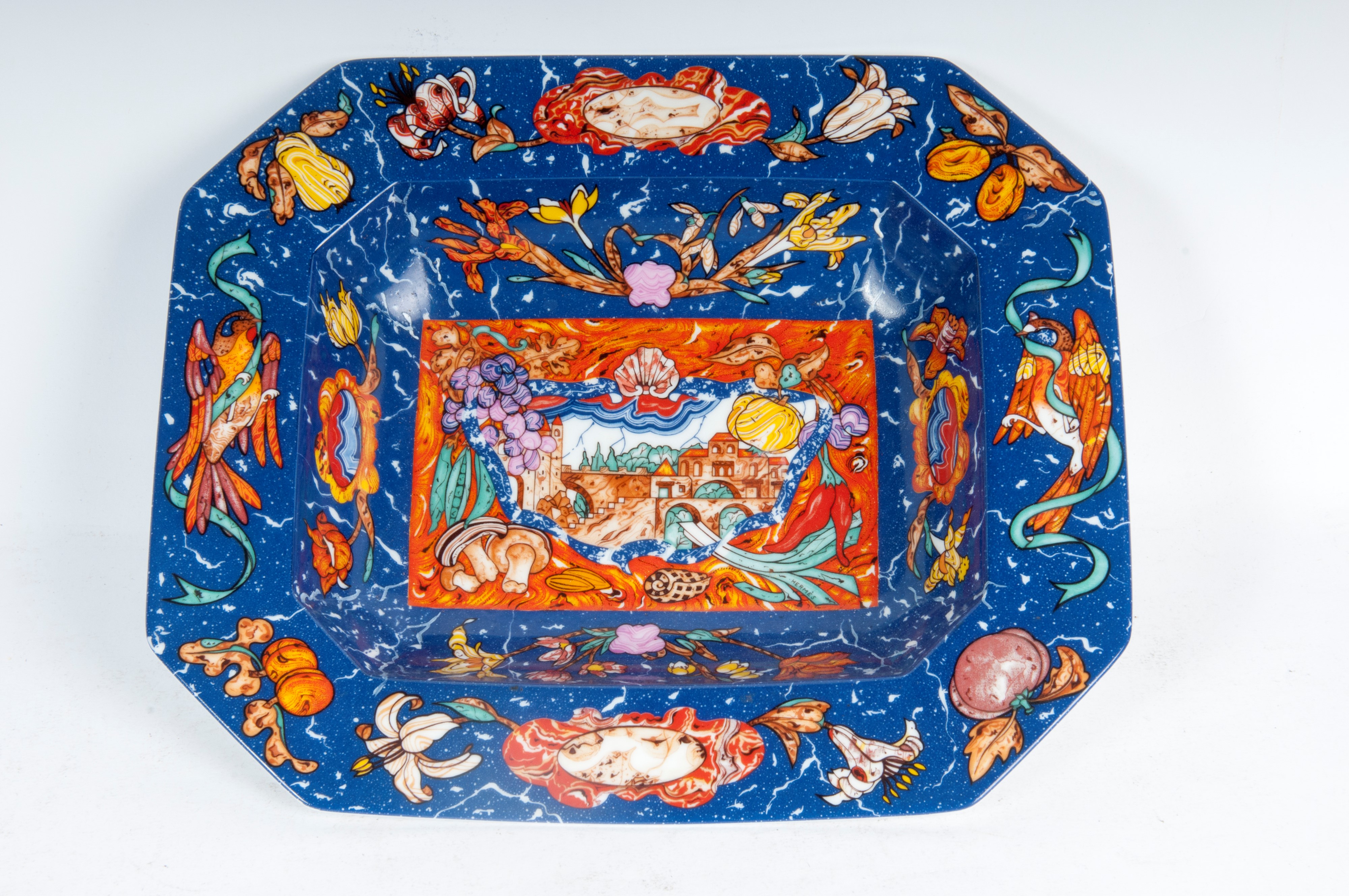con profilo ottagonale. Decoro a frutta e fiori su fondo marmorizzato blu ed arancione. Manifattura Hermes