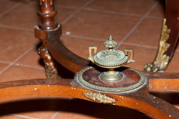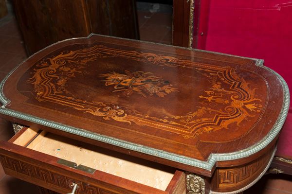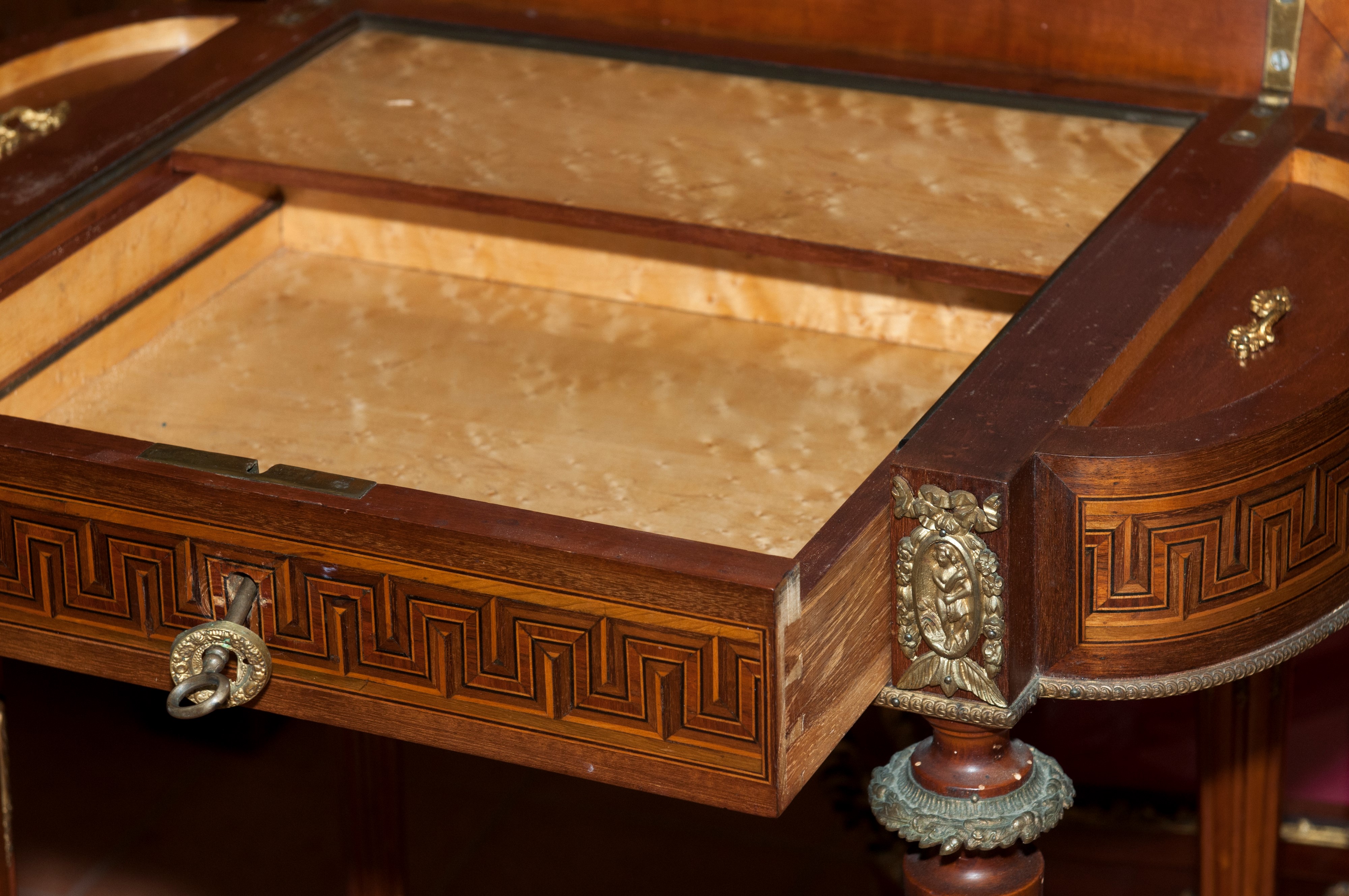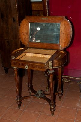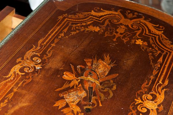 in legno di mogano e tuja con quattro gambe scanalate raccordate alla base che sorreggono un corpo centinato ad un cassetto ed un piano a ribalta. All'interno scompartimento con due cassetti laterali ed uno specchio centrale. Finitura del piano in legno di frutto con strumenti musicali e fogliacei.