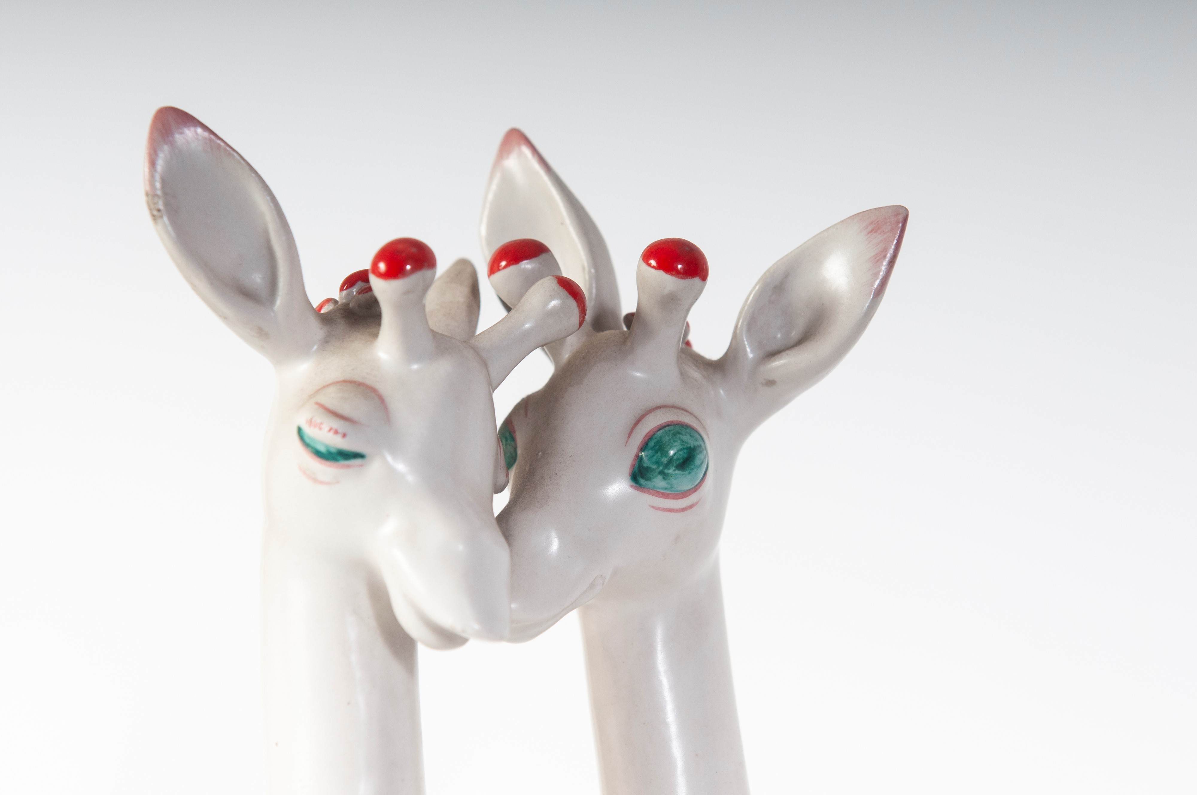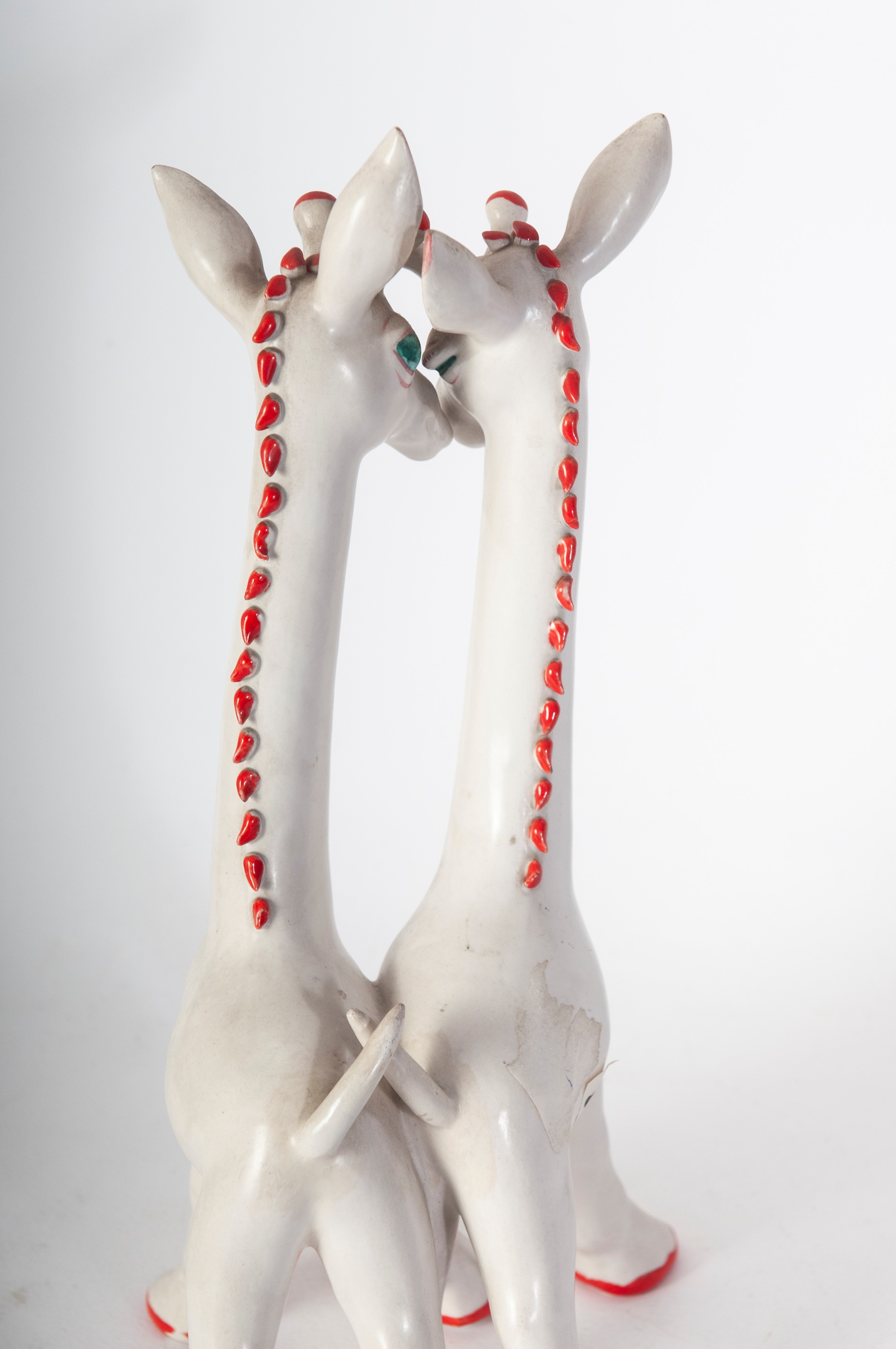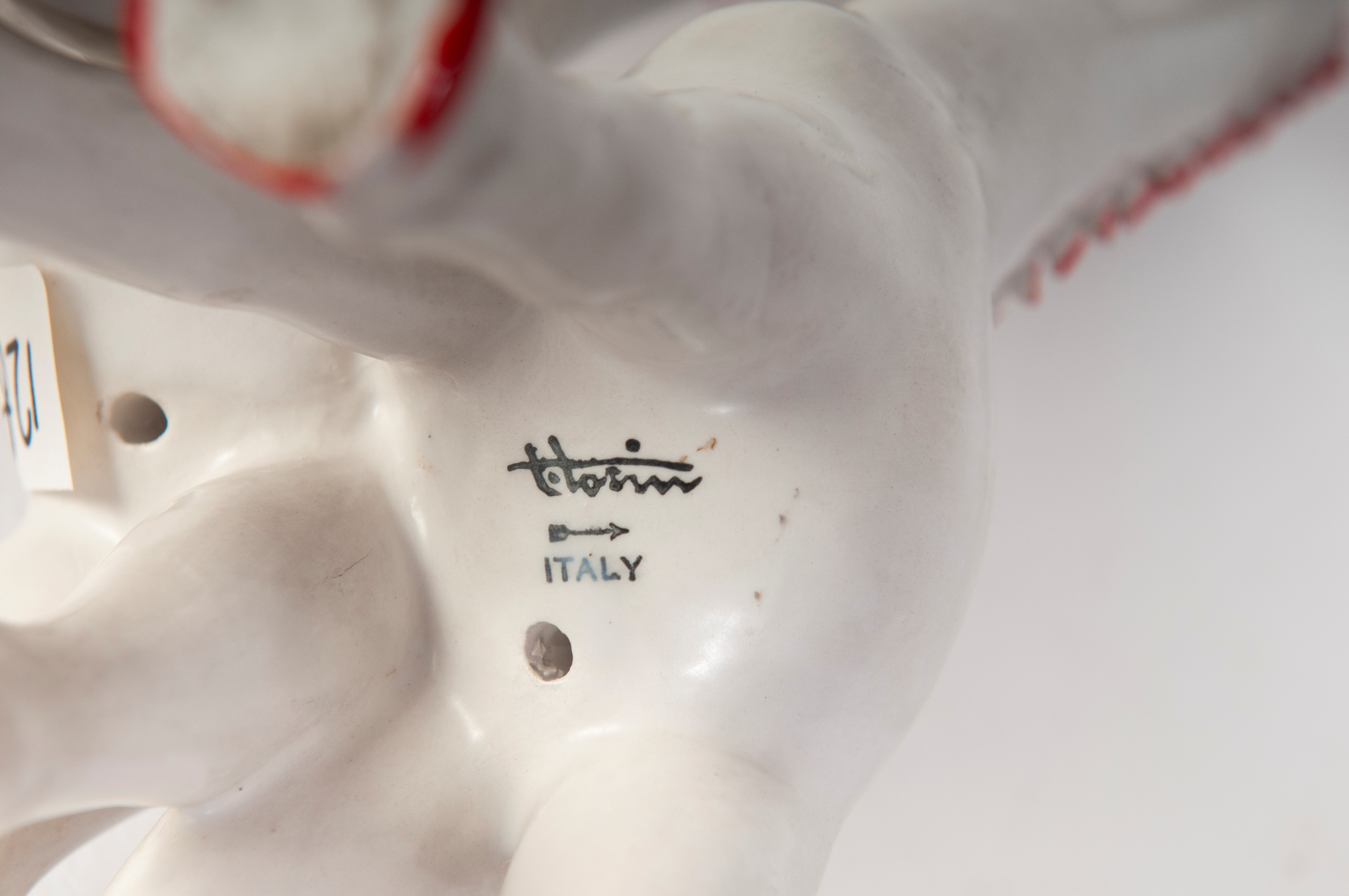 in ceramica bianca con rifiniture rosso e verde, formatura a colaggio. Manifattura Tosin con firma in nero sotto smalto alla base in uso nella manifattura dal 1950/1980 ca.