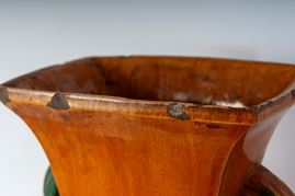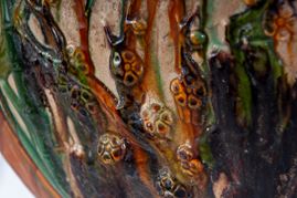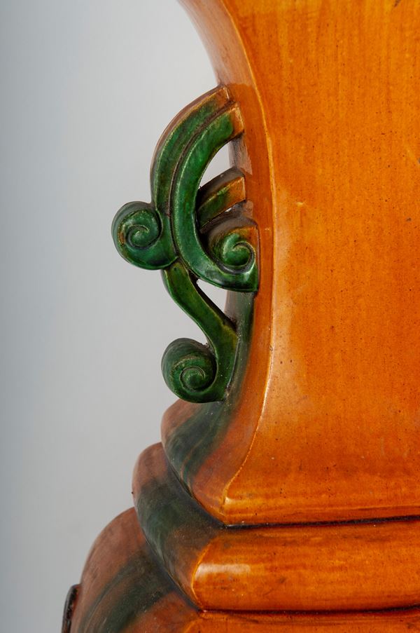 a tre colori, anse stilizzate a motivi vegetali con rilievi a testa di pipistrelli ed elementi floreali nel corpo.