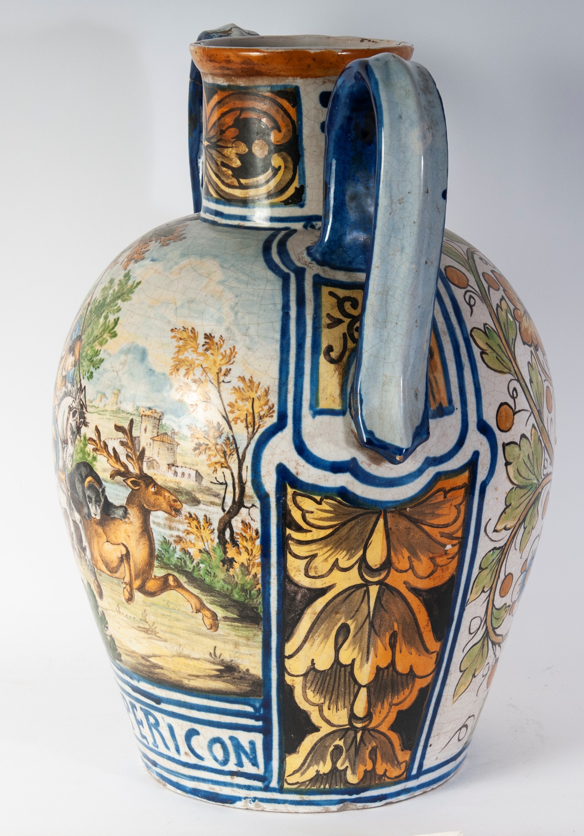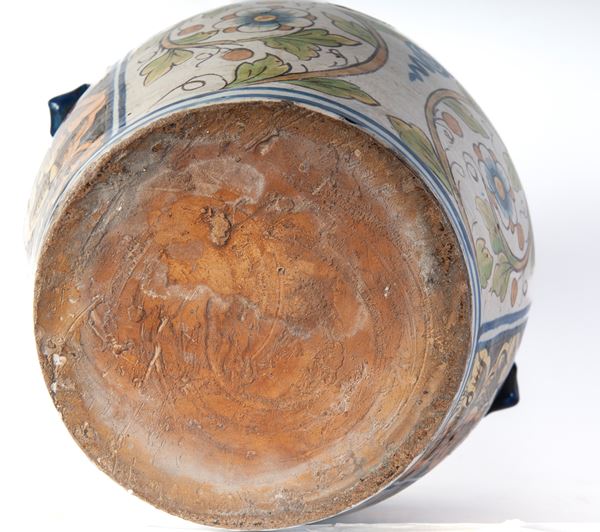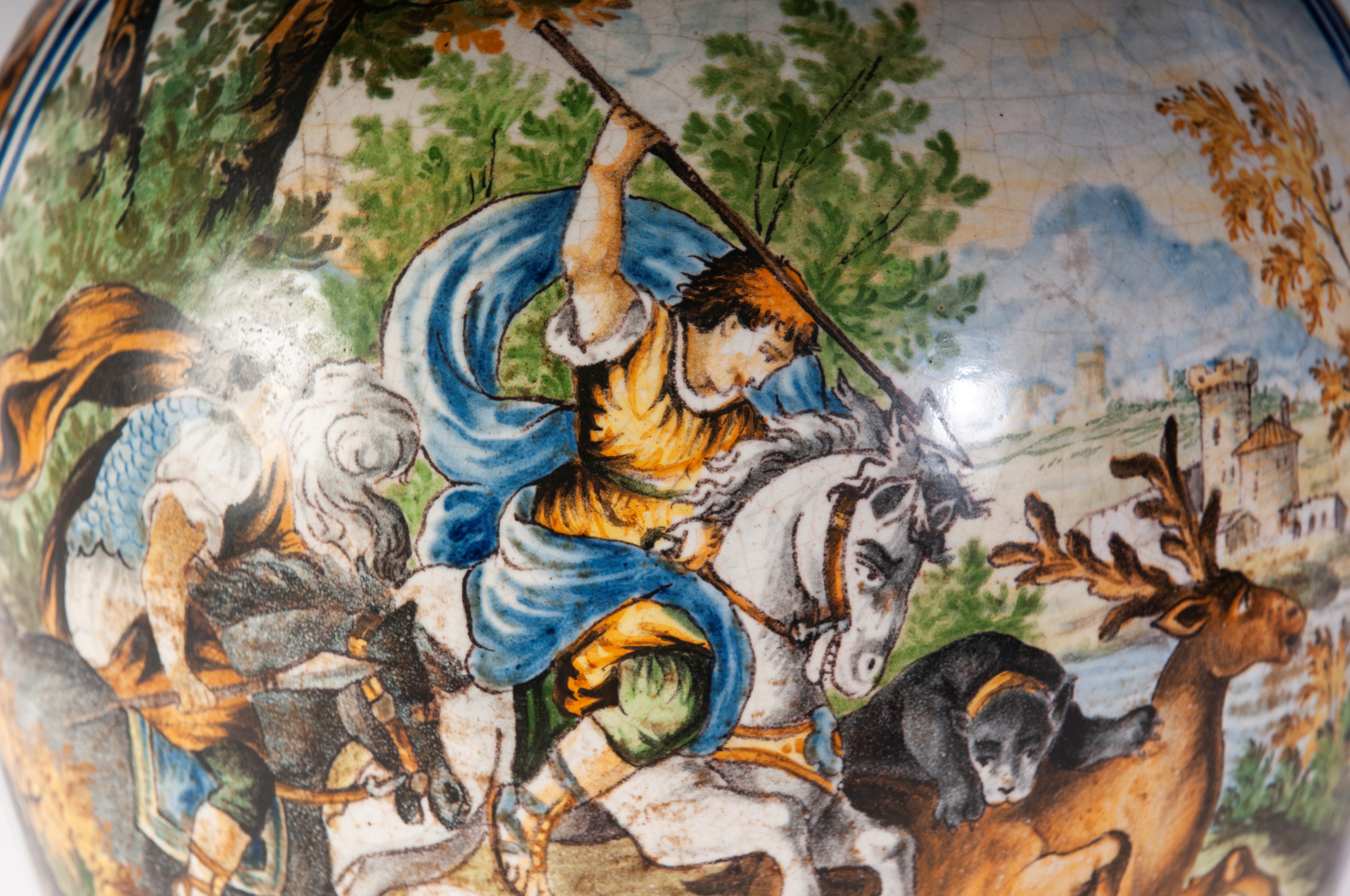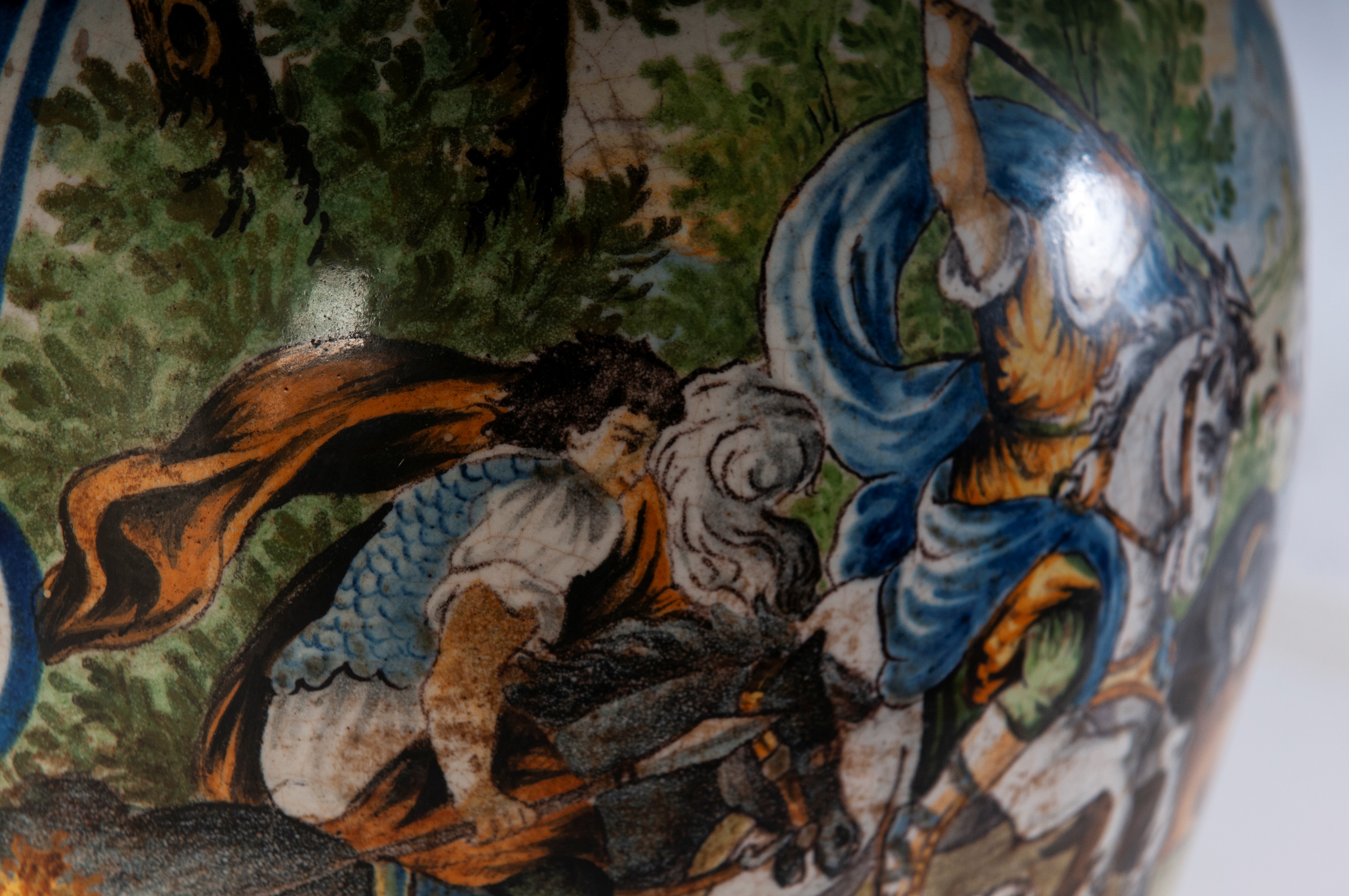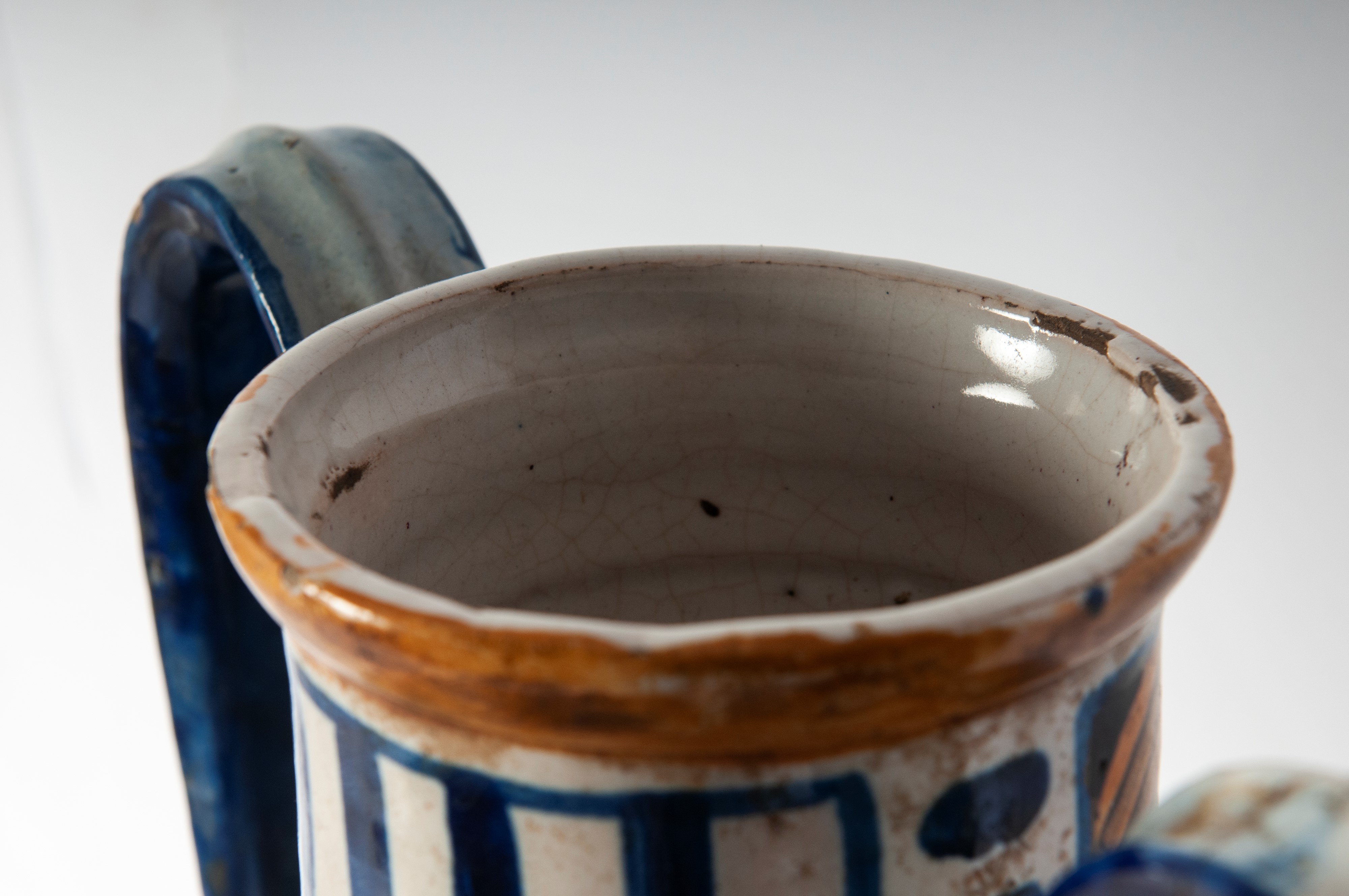 bordo superiore leggermente estroflesso. Corpo dalla spalla bombata e rastremata verso il basso. Decoro su fondo bianco con scena di cacciagione al fronte al retro girali fogliacei. Scrittura farmaceutica su fondo bianco entro cartiglio blu. Manifattura campana