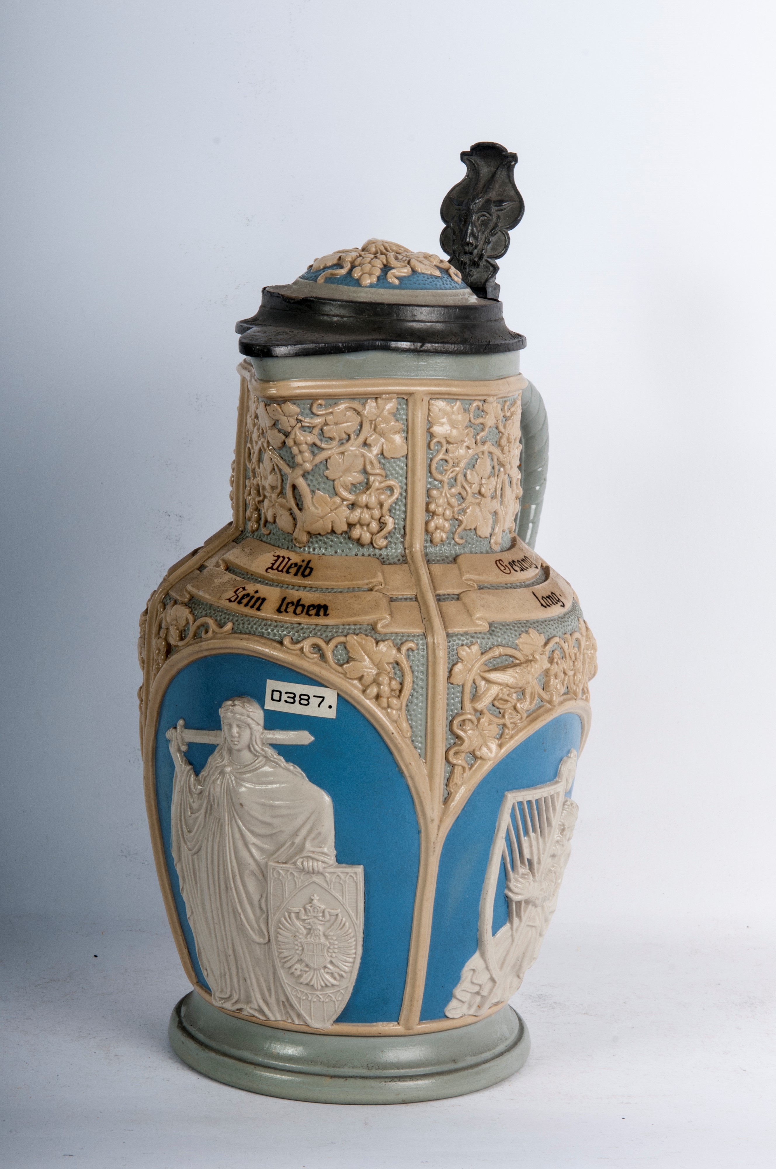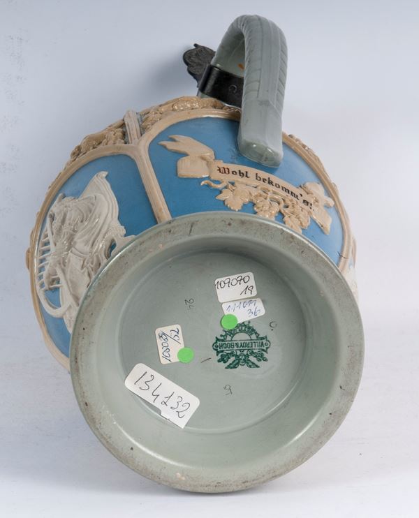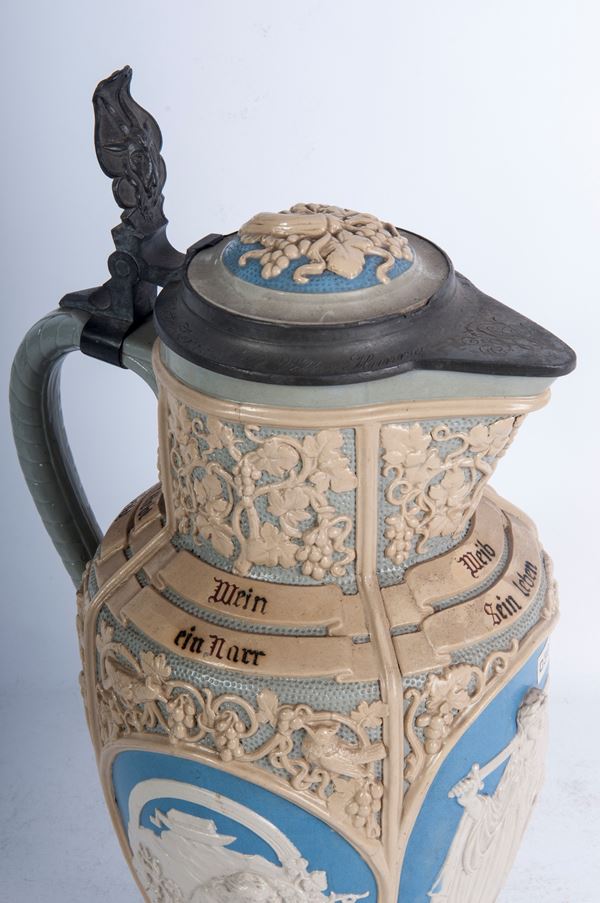 in ceramica policroma con coperchio in peltro e ceramica. Decoro a rilievo con personaggi e tralci d'uva. . Manifattura Villeroy e Boch