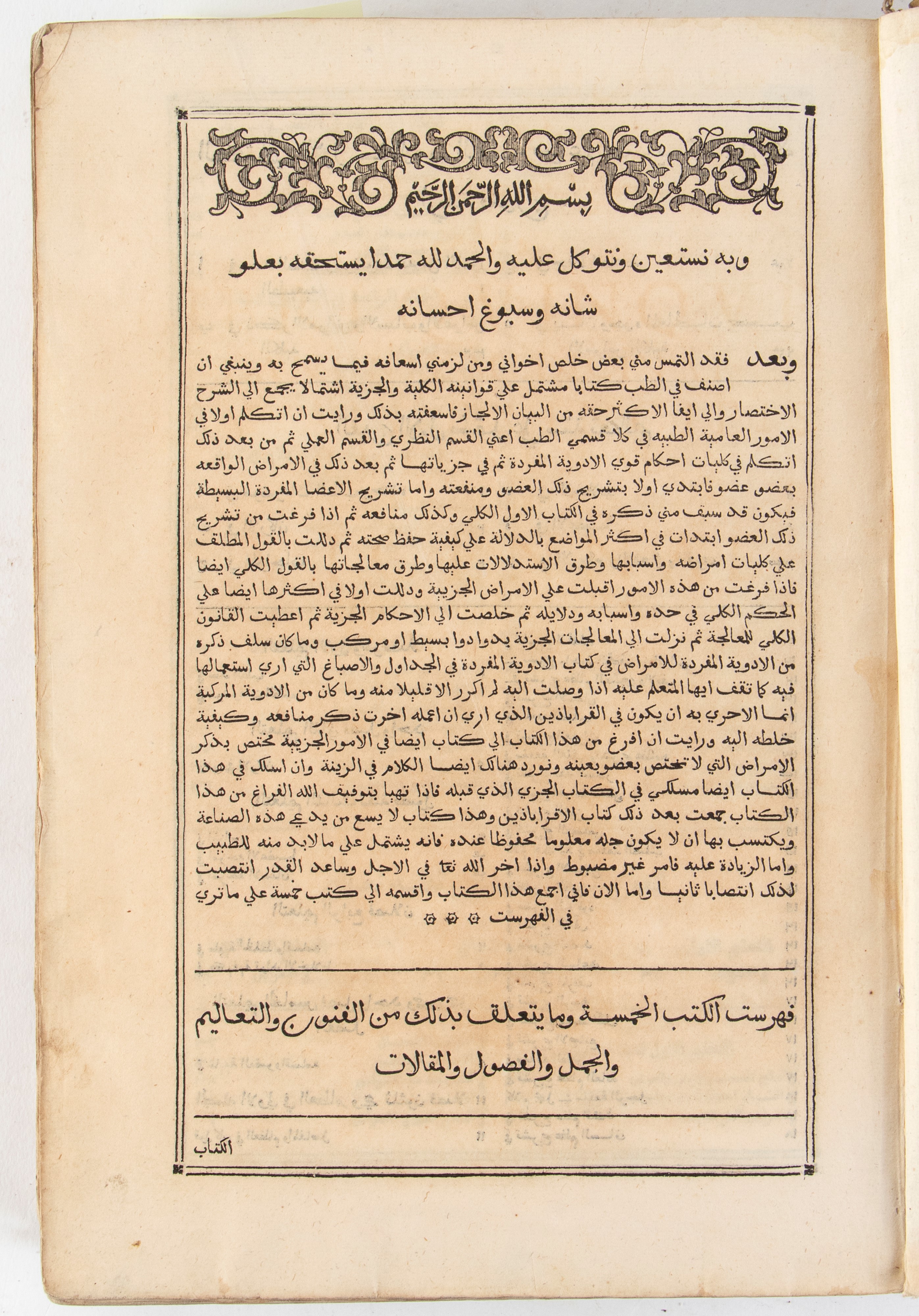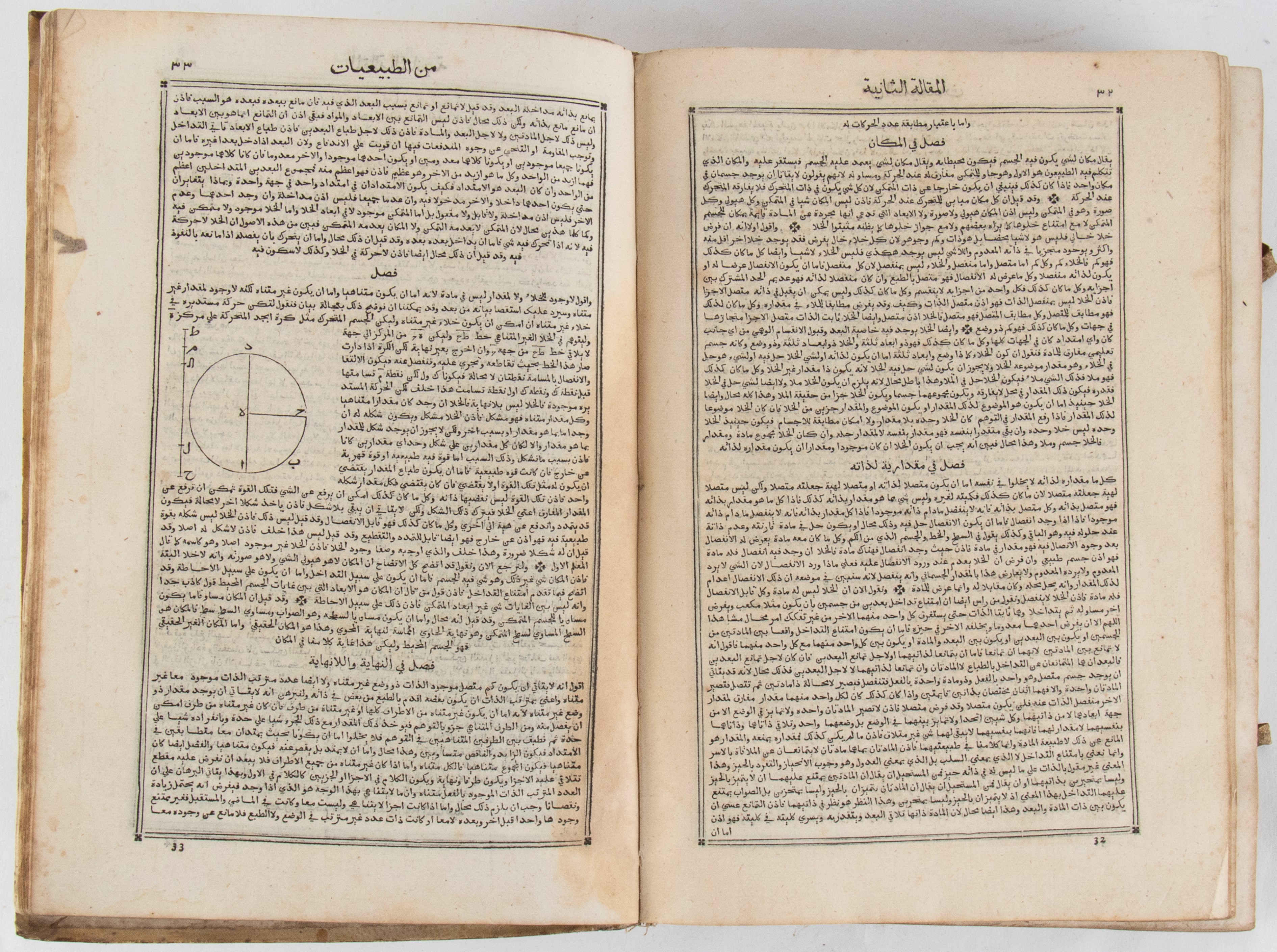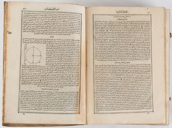 In folio, 3 parti in un volume, pp. 12+610+2+268+64+85. Pergamena coeva . Editio princeps. Trattato in lingua araba commissionato da Ferdinando de’ Medici dalla stamperia Medicea su richiesta di papa Gregorio XIII per stampare in arabo e in altre lingue orientali, i caratteri furono disegnati da Robert Granjon. Pergamena coeva. Rarissimo esemplare mancante di alcune pagine p. 269-270, 119-120, 197-198, 199-200, 243-244 e p. 43-44 dell’ultima parte. Esemplare allentato con parti parzialmente staccate. Nel mondo arabo Avicenna fu considerato fino al ventesimo secolo forse l’autorità più importante nel campo medico e il suo testo rimase l’opera di riferimento per il mondo islamico.