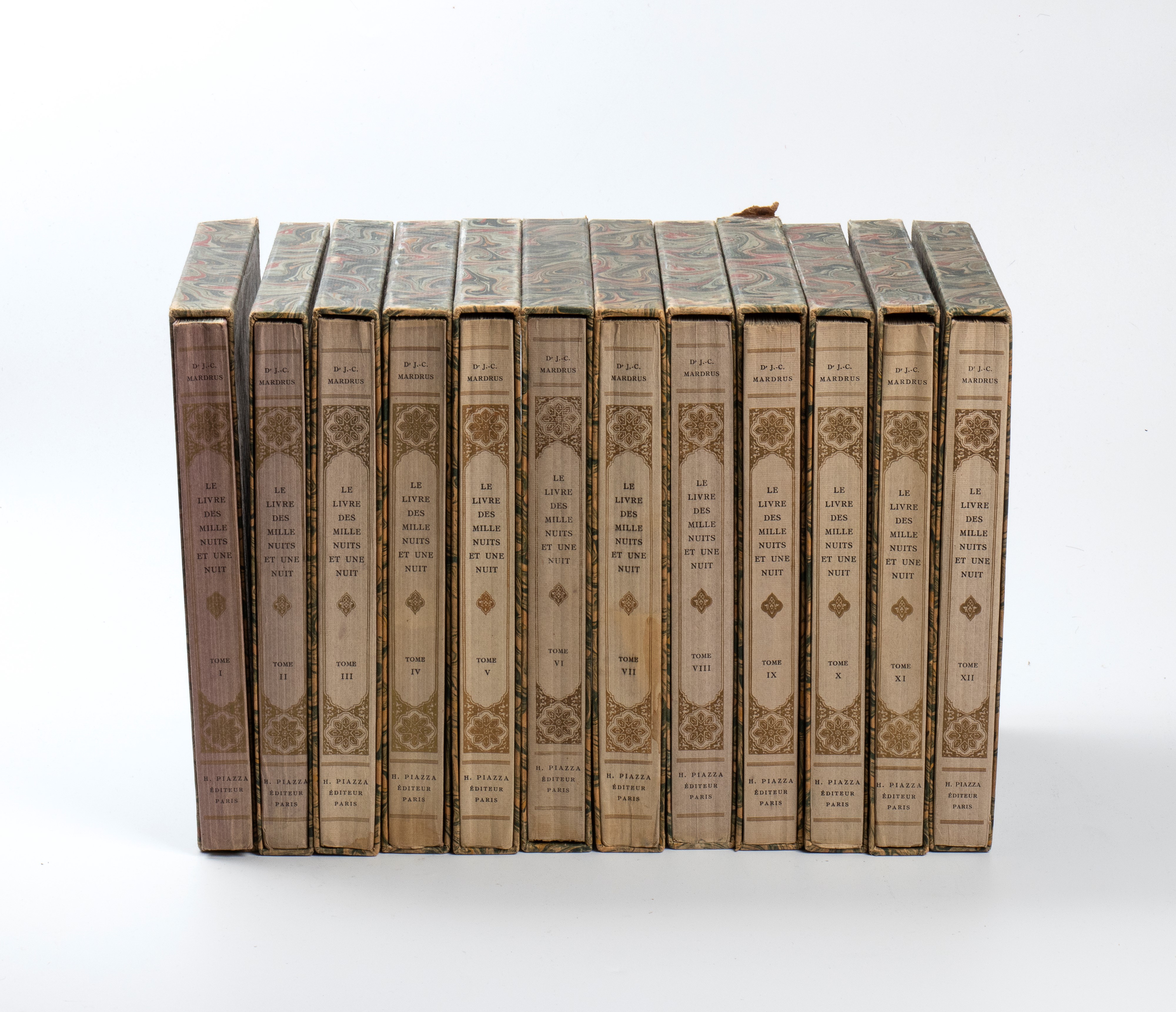 Raccolta di 12 volumi in-4° (mm 304x230). Pagine [6], 199, [3]; [4], 181, [3]; [4], 269, [3]; [4], 251, [3]; [4], 263, [3]; [4], 269, [3]; [4], 293, [3]; [4], 295, [3]; [4], 239, [3]; [4], 227, [3]; [4], 211, [3]; [4], 243, [3] con nel complesso 144 tavole a colori fuori testo, 12 per ciascun volume (il nono ne ha 10, il dodicesimo 14), protette da velina. Ciascun volume con occhietto e frontespizio generale, 85 titoli illustrati con motivi arabeggianti a colori nel testo, testatine, capilettera e cornice tipografica al testo. Esemplare 987 su una tiratura complessiva a 2500, uno dei 2200 su vélin chiffon. Sovraccoperta editoriale color vinaccia illustrata in oro e verde, entro custodia editoriale. Qualche difetto alle custodie ma ottimo esemplare, completo di testo e di tavole.