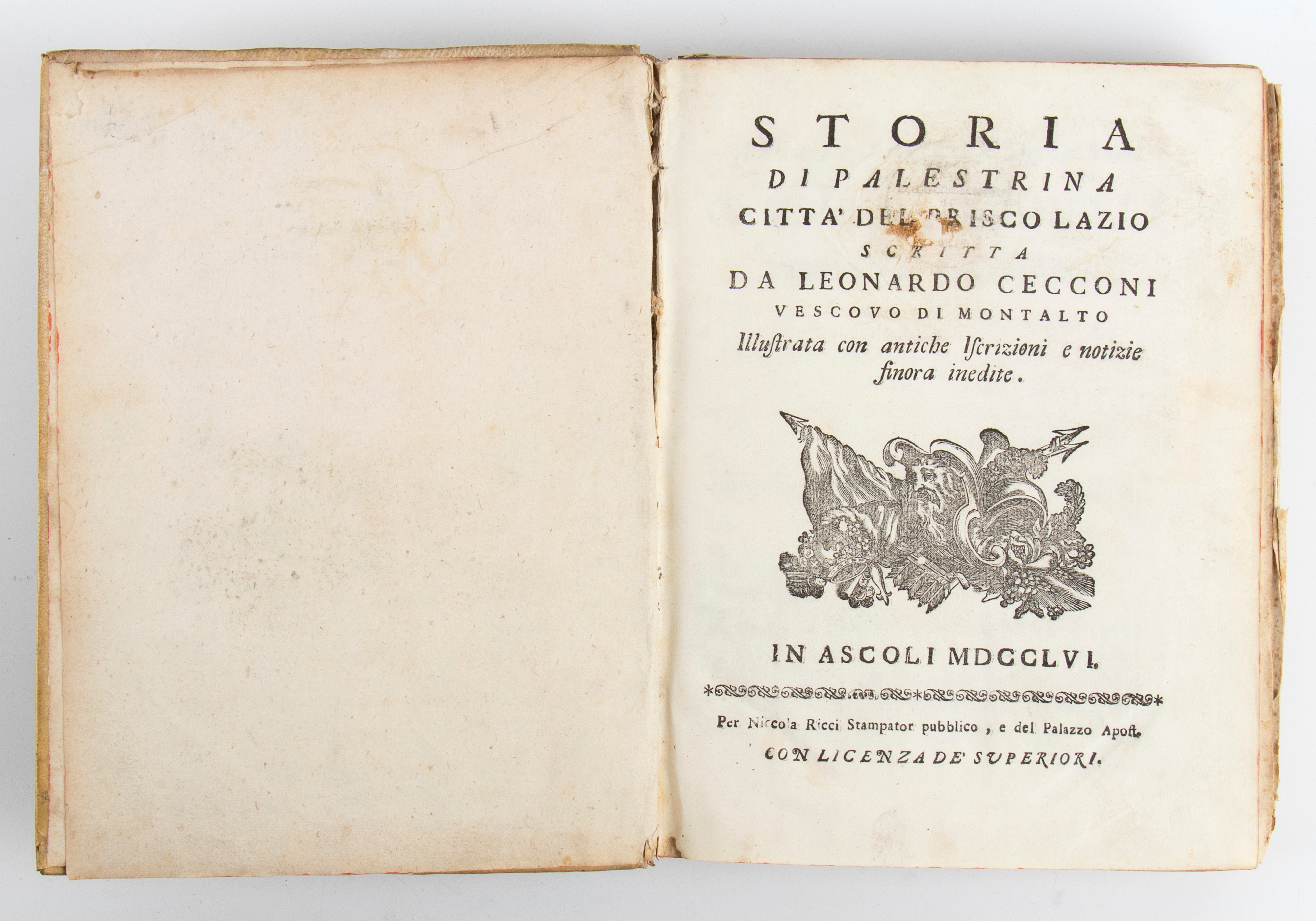 CECCONI Leonardo Storia di Palestrina città del prisco Lazio illustrata con antiche iscrizioni e notizia finora inedite, Ascoli: per Nicola Ricci, 1756
