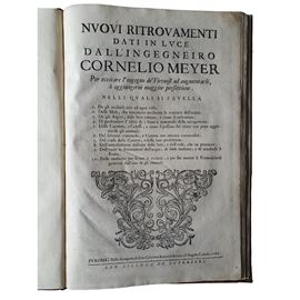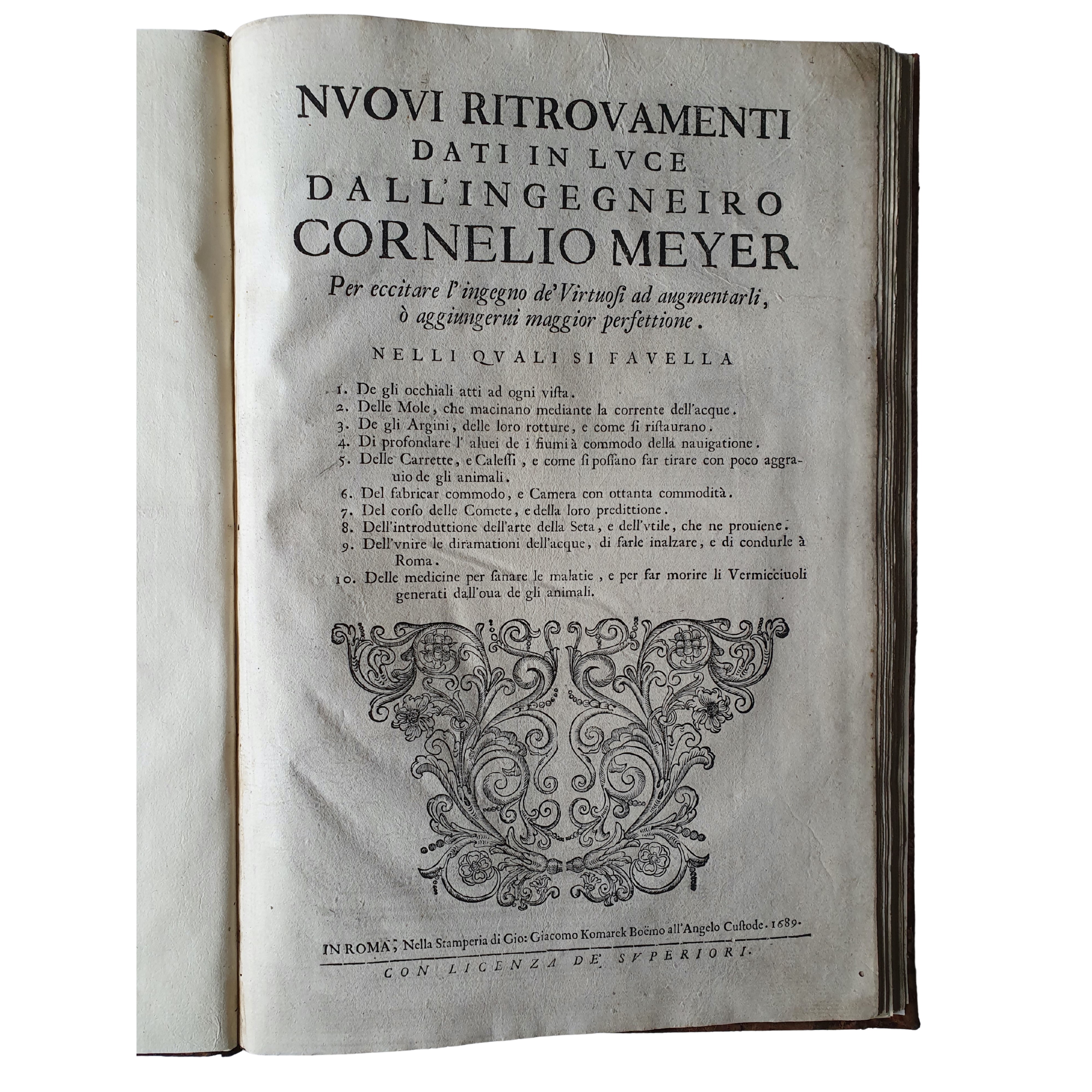 Nuovi ritrovamenti dati in luce dall’ingegniero Cornelio Meyer per eccitare l’ingegno de’ virtuosi ad augmentarli, o aggiungervi maggior perfettione. Nelli quali si favella 1. De gli occhiali atti ad ogni vista, 2. Delle mole, che macinano mediante la corrente dell'acque, 3. De gli argini, delle loro rotture, e come si ristaurano, 4. Di profondare l'alvei de i fiumi a commodo della navigatione, 5. Delle carrette, e calessi, e come si possano far tirare con poco aggravio de gli animali, 6. Del fabricar commodo, e camera con ottanta commodità, 7. Del corso delle comete, e della loro predittione, 8. Dell'introduttione dell'arte della seta, e dell'utile, che ne proviene, 9. Dell'unire le diramationi dell'acque, di farle inalzare, e di condurle a Roma, 10. Delle medicine per sanare le malatie, e per far morire li vermicciuoli generati dall'ova de gli animali. Roma, nella Stamperia di Gio: Giacomo Komarek Boëmo all’Angelo Custode, 1689. Rilegato con: Idem Nuovi ritrovamenti divisi in due parti con tre tavole in lingua latina, francese & olandese. Parte prima. Delli ordegni per cavar pali. Armature della calamita. Del modo di levare i sassi sott'acqua e trovar la lega dell'oro e dell'argento. Modo di condurre l'acque sorgenti nella città di Livorno. Modo di voltar un fiume. Passonate rotte nel porto & il modo di rimediare. Mistolini o cavafanghi e fortezze per il porto di Livorno. Modo di far venirle il terreno sopra le fortezze. Modo di adoprar gl'occhiali. Un vecchio può imparare da un ragazzo. Modo di rompere un bichiero con la voce. Della simpatia dell'instromenti. D'un'osservazione fatta sopra un eclisse del primo satellite di Giove. Finalmente delle varie passonate fatte alla memoria di papa Urbano Ottavo. Date al pubblico dall'ingegniero Cornelio Meyer dell’Accademia Fisicomatematica Romana. Roma, nella Stamperia di Gio: Giacomo Komarek Boëmo all Fontana di Trevi, 1696.