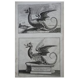 2 parti in 1 volume, folio (402x270); I: [20] carte, compresi gli indici in latino, francese e olandese; 20 illustrazioni incise nel testo (16 a mezza pagina e 3 a pagina doppia); xilografia decorativa al frontespizio, II: [20] carte, 20 illustrazioni incise nel testo (16 a mezza pagina, 2 a doppia pagina e due a piena pagina); vignetta incisa amezza pagina al frontespizio, rappresentante un drago. Pelle d’epoca. Ottima copia ad ampi margini. Le quattro carte di indici, annunciate nel titolo della seconda parte (la vera prima parte) si trovano alla fine della prima parte (la vera seconda parte)