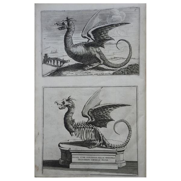 Entrambi in prima edizione. La seconda parte, Nuovi ritrovamenti dati in luce, venne pubblicata nel 1689, mentre Nuovi ritrovamenti divisi in due parti, che rappresenta la prima parte dell’opera secondo il progetto editoriale dell’autore, venne dato alle stampe solo sette anni più tardi. Bell’esemplare della variante definitiva dell’opera, riccamente e magnificamente illustrata oltre ad essere la più rara e ricercata. Tra le molte tavole, al verso di quella rappresentante le velli di Comacchio, si trovano due incisioni rappresentanti il cosiddetto Drago del Tevere. Questa curiosa collezione è completata da un dettagliato indice trilingue, nel quale l’ultimo argomento della seconda parte (in questa copia rilegata per prima) indica erroneamente “Fig [ura]. 16”, mentre si tratta in realtà di un capitolo di due pagine privo di illustrazioni..