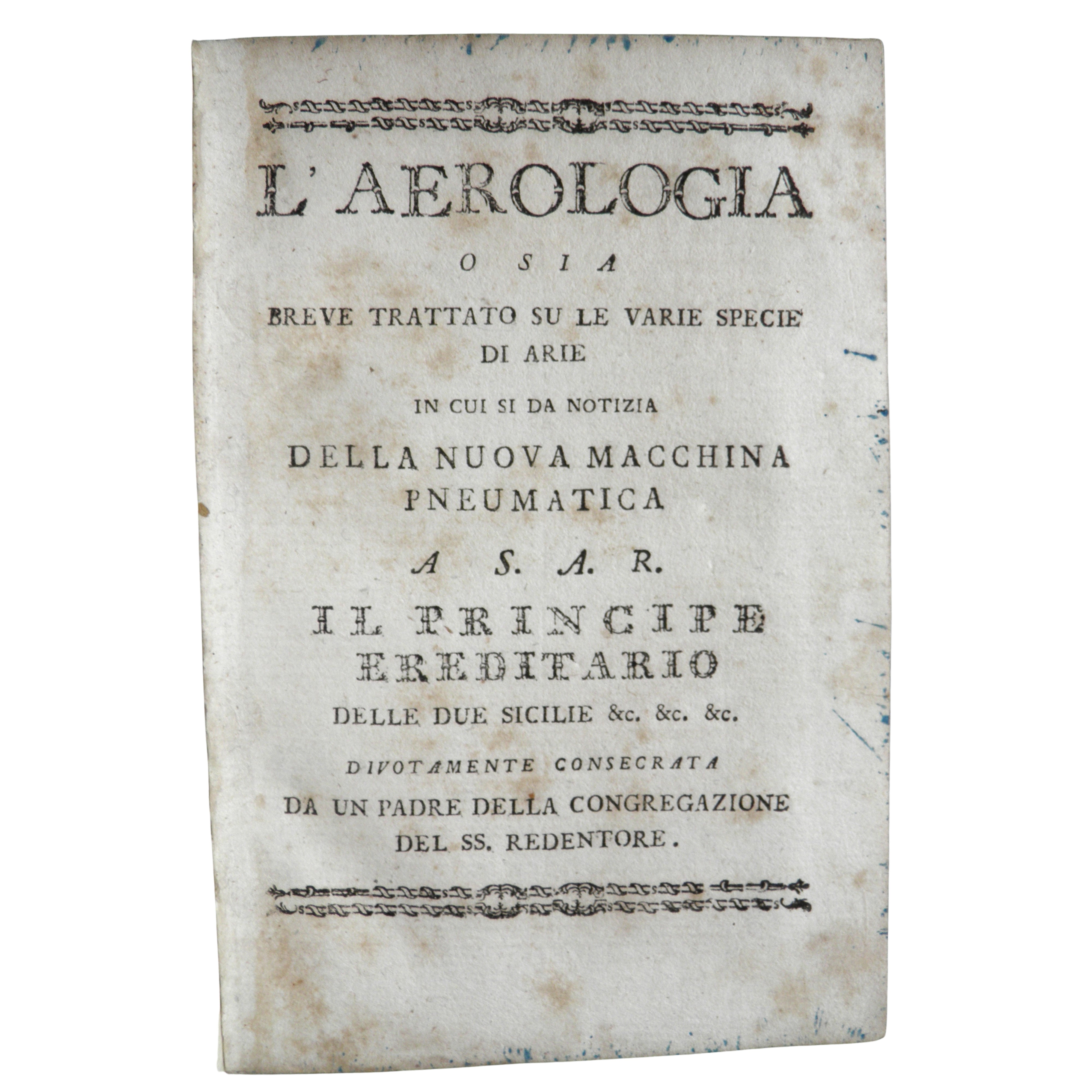 Prima edizione, estremamente rara. Il primo lavoro avrebbe dovuto essere pubblicato a Napoli l’anno precedente (l’imprimatur è datato 30 gennaio 1794), ma venne ritardato dall’improvviso spostamento dello stampatore da Napoli a Salerno. Quando finalmente pronto per la stampa, un non meglio identificato Maestro consiglio l’autore di aspettare il completamente della seconda parte, allo scopo di pubblicare un lavoro completo ed esauriente. Pandullo fu d’accordo e il lavoro venne pubblicato nel 1795 nella forma presente, con l’inclusione dell’appendice in cui viene descritto il ventilatore. L’autore descrive diversi tipi di aria, la loro composizione e le loro proprietà e discute i lavori di autori precedenti aull’argomento.Nulla si sa dell’autore oltre quanto riportato nel frontespizio, che era un padre Redentorista, membrodella Congregazione del SS. Redentore, fondata da S. Alfonso Maria de’ Liguori.