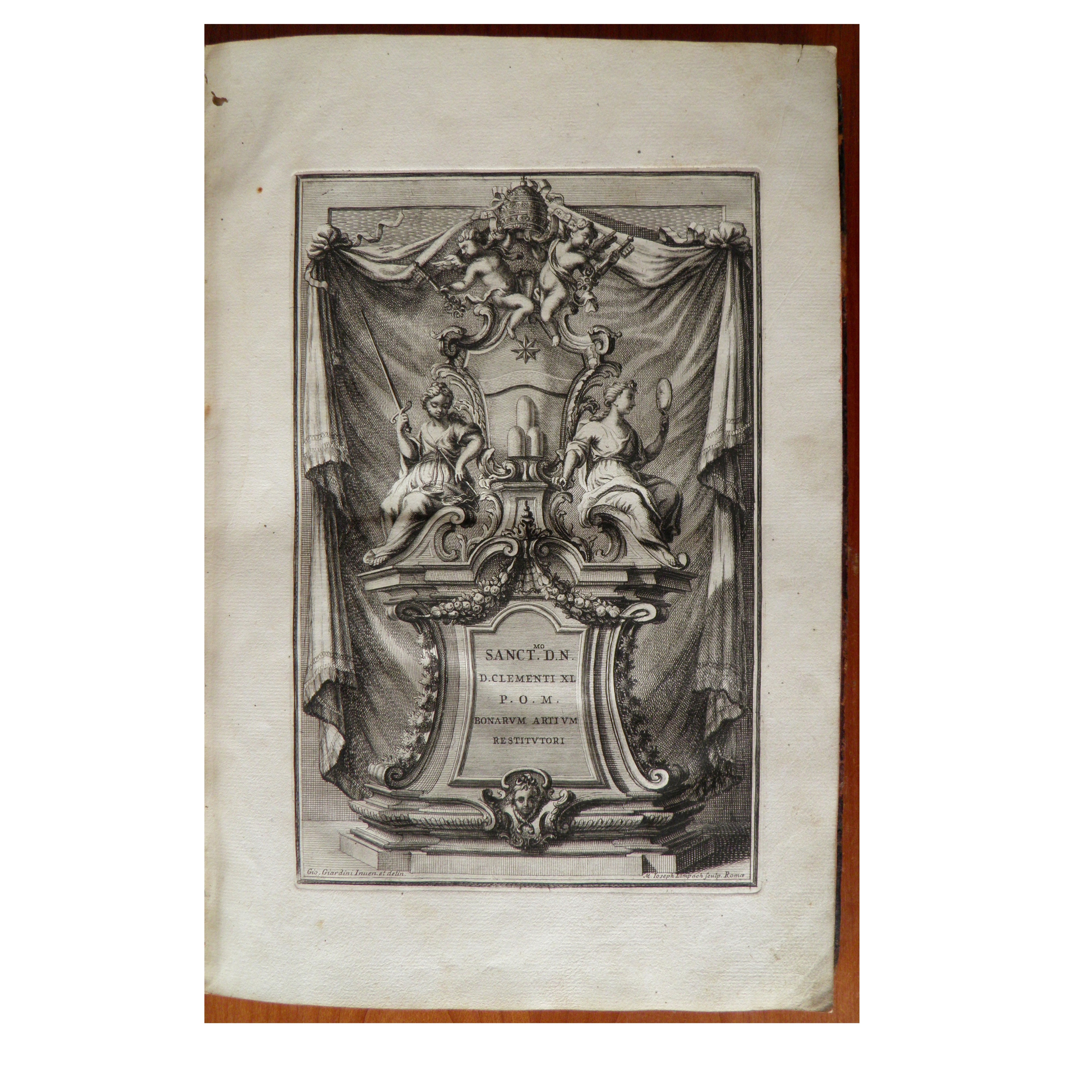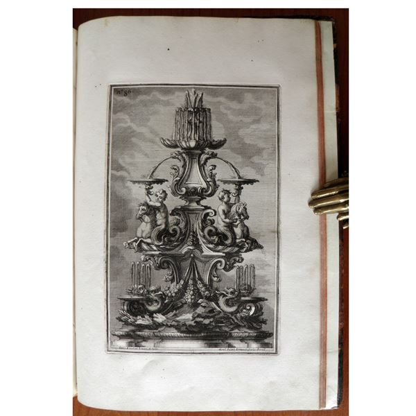2 parti in 1 volume, in folio (410x270); 2 frontespizi, 101 tavole incise, di cui 98 raffiguranti diversi in argento riccamente decorati; le altre 3 tavole sono un'antiporta allegorica con stemma papale e cartiglio “Sanct.mo D.N. D. Clementi XI P.O.M. Bonarum artium restitutori” e una dedica al papa nella prima parte e la dedica all’Accademia nella seconda parte, entrambe dediche firmate da Giovanni Giardini. La tavola n. 48 è presente in 2 varianti (con e senza stemma papale), la seconda delle quali è rilegata alla fine del secondo volume. Grande vignetta incisa su entrambi i frontespizi (ripetuta). Incisioni di Maximilian Joseph Limpack su disegni dell'autore. Vitello marmorizzato coevo, dorso con decorazioni in oro e titolo dorato. Dorso e parte di entrambe le copertine restaurati. Foro di tarlo non invasivo nell'angolo superiore interno delle prime pagine, che non compromette mai le incisioni, piccola macchia sul margine interno di circa 6 pagine della seconda parte, che non tocca mai l'incisione. Una bella copia, su carta pesante della cartiera “Rev. Cartiera Apostolica”.
