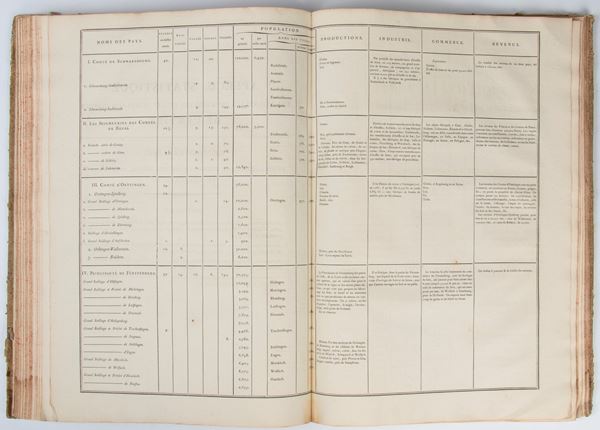 In folio, pp. IV+31 tavole di cui una doppia di tavole statistiche. Cartonato editoriale coevo.Traduzione francese di Griffet de la Beaume pubblicata da Adrien Cyprien Duquesnoy, de la Statistiche Uebersicht der deutschen Staaten. L’autore pubblica alla fine del XVIII secolo una serie di opere di economia ricche di statistiche. Il testo proposto risulta molto ricco di informazioni sui diversi stati dell’Impero Germanico in età Napoleonica.