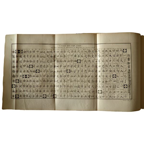 4°; xxxii, 214, [2] pagine, [2] carte di tavole ripiegate. Segnatura a-b8, A-N8, O4. VrianteA (la variante B presenta un foglio di carta velina gialla con il titolo stampato in cinese, generalmente inserito tra l’occhietto e il frontespizio); caratteri cinesi e tondo. Mezza pelle marmorizzata d’epoca. Esemplare eccellente ad ampi margini.