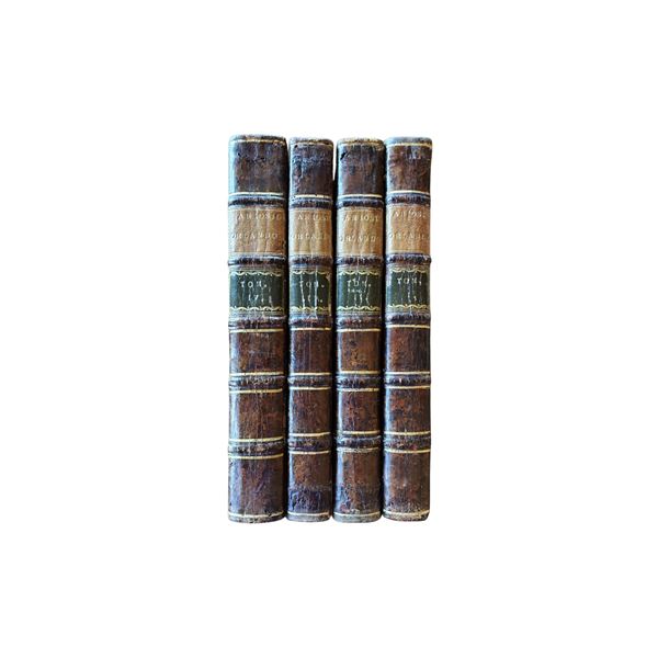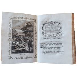 4 volumi, in 4° (285x205); I: [9] carte, LX pp., [150] carte. Segnatura: *-**2, a-g4, h2, A-Z4, Aa-Oo4, Pp2. Un foglio extra, con registro *3 (Stanze del Furioso) è inserito tra *4 and **1 II: [214] ll, signature A-z4,Aa-Zz4, Aaa-Fff4, Ggg6. III: [206] carte, segnatura A-z4,Aa-Zz4, Aaa-Ddd4, Eee6 IV: [268] carte, segnatura A-Z4 (quinterno D rilegato tra E e F), Aa-Zz4, Aaa-Xxx4. 58 tavole incise (compresi antiporta e ritratto), 40 grandi incisioni (3 testatine e 37 finalini), 51 incisioni a mezza pagina (“argomento”, all’inizio di ciascun canto), numerosi capilettera incisi. Pelle d’epoca, etichetta in marocchino con titolo al dorso. Unica e magnifica copia a pieni margini, incisioni in chiaroscuro in ottima impressione, esemplare di una variante sconosciuta.