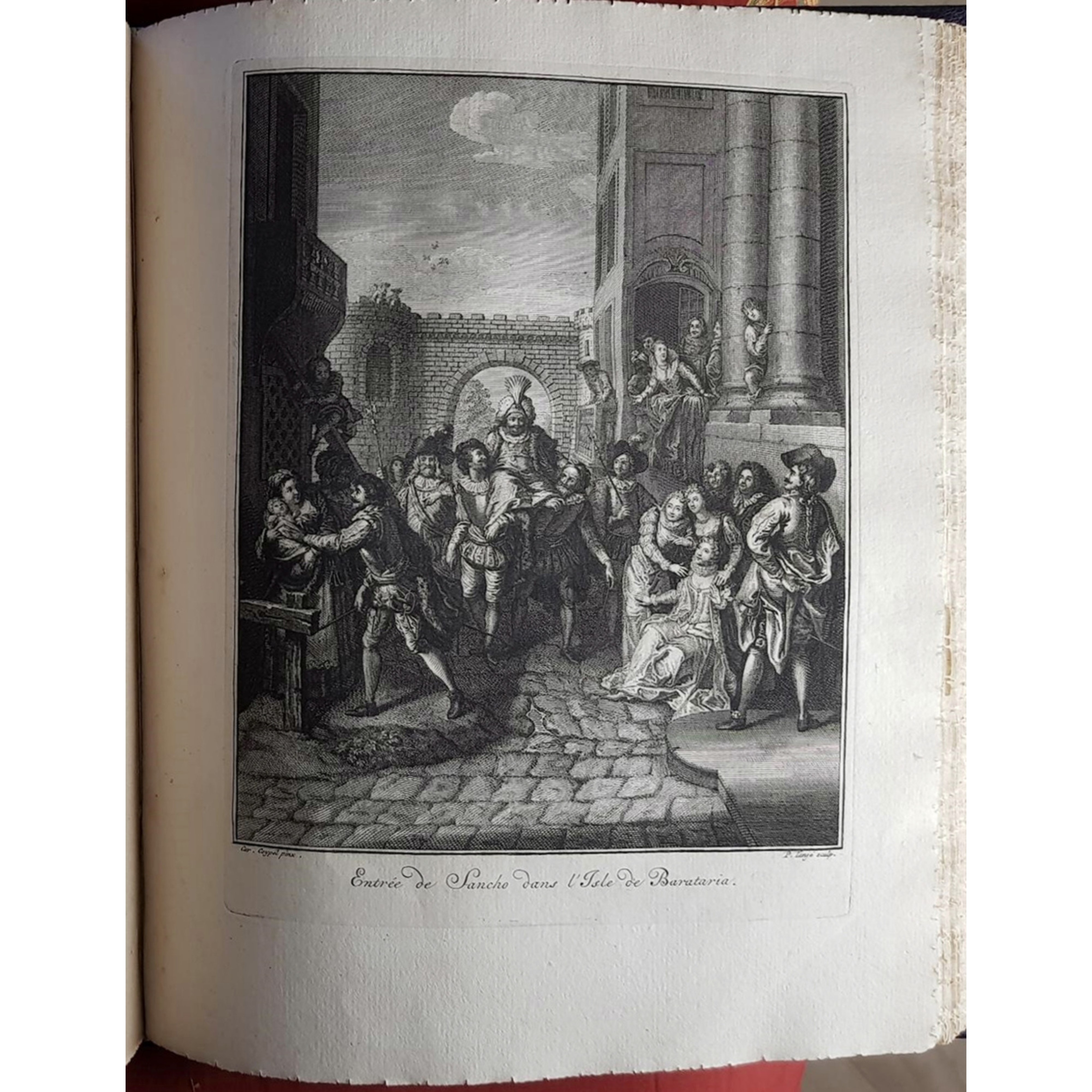 Prima edizione, prima tiratura, di quest’opera magnificamente illustrata, con le incisioni in prima tiratura, di Charles-Antoine Coypel. Coypel, pittore e drammaturgo, fu pittore principale di Filippo II, duca d’Orléans e direttore dell’Accademia Reale. Un eccellente disegnatore di tappezzerie, lavorò per le manifatture Gobelins; da una serie di illustrazioni per il Don Chisciotte creò la serie di tappezzerie considerate il suo capolavoro, i cui disegni vennero successivamente incise (per la maggior parte dall’incisore e illustratore Bernard Picart) per illustrare questa edizione.