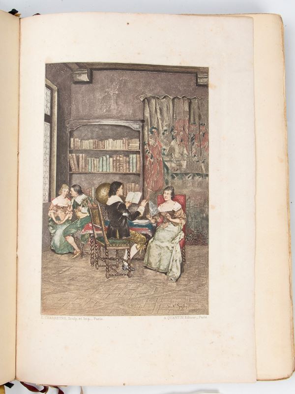 In 8° grande, pp. XII+314. Brossura originale figurata. Con tavole incise a colori di Gervex, Lynch, Kratké, Moreau, Gonzalès, di cui tre particolarmente ricercate di Félicien Rops, numerose illustrazioni nel testo, brossura editoriale illustrata a colori conservata entro legatura coeva in pergamena rigida, autore.
