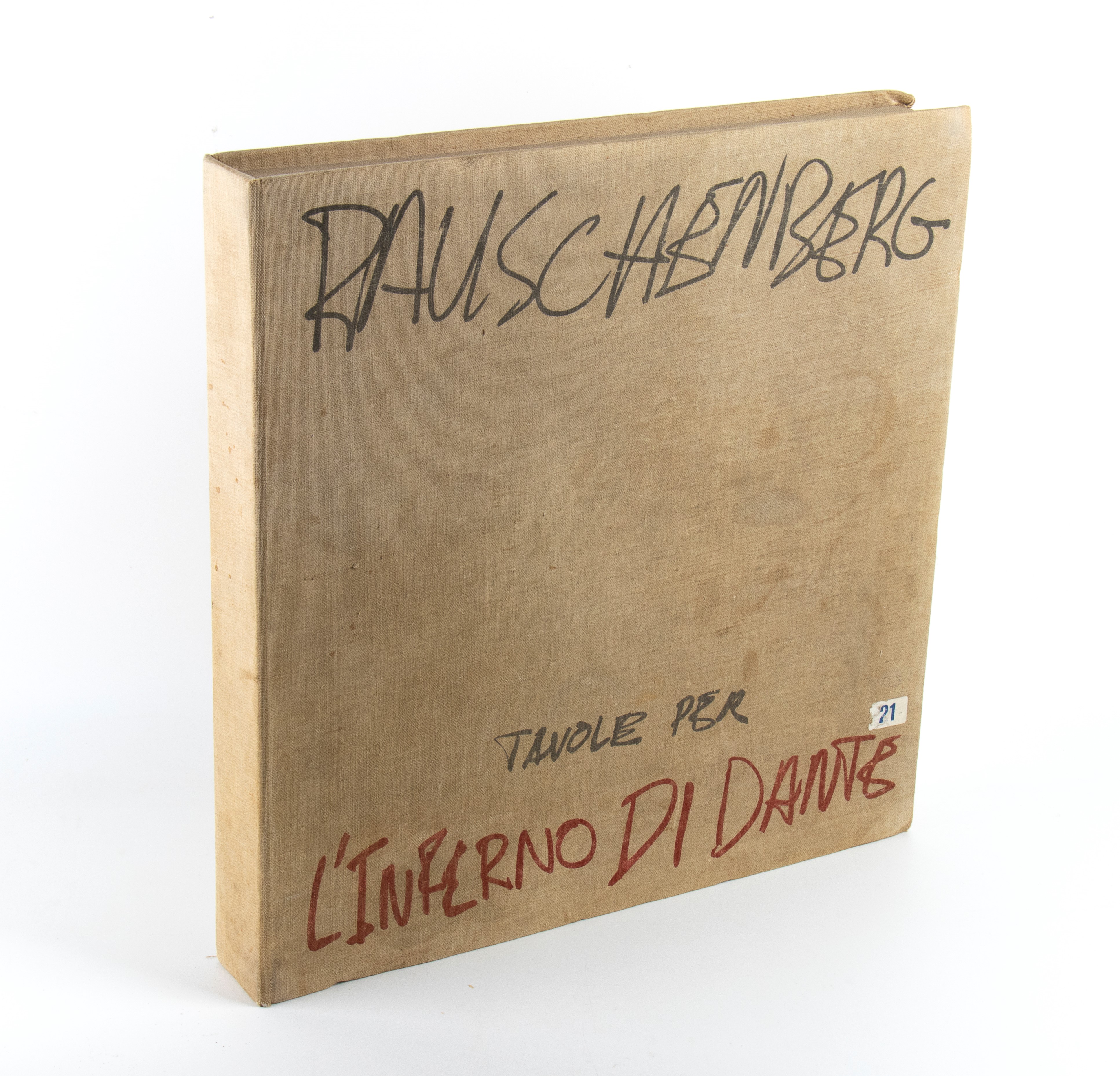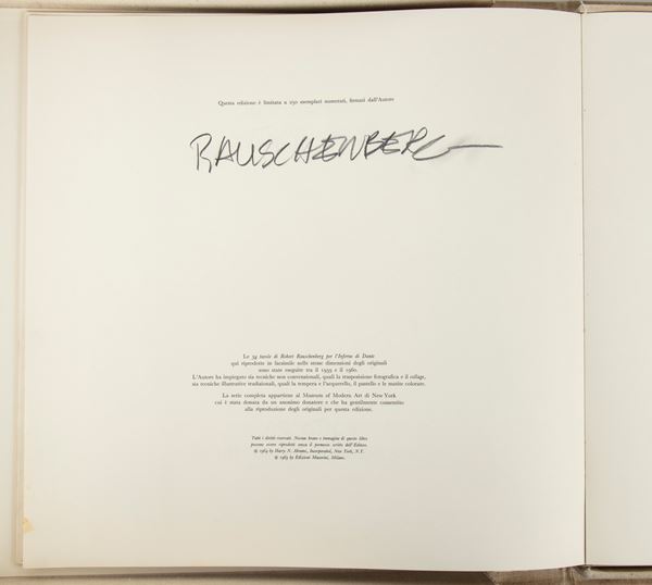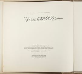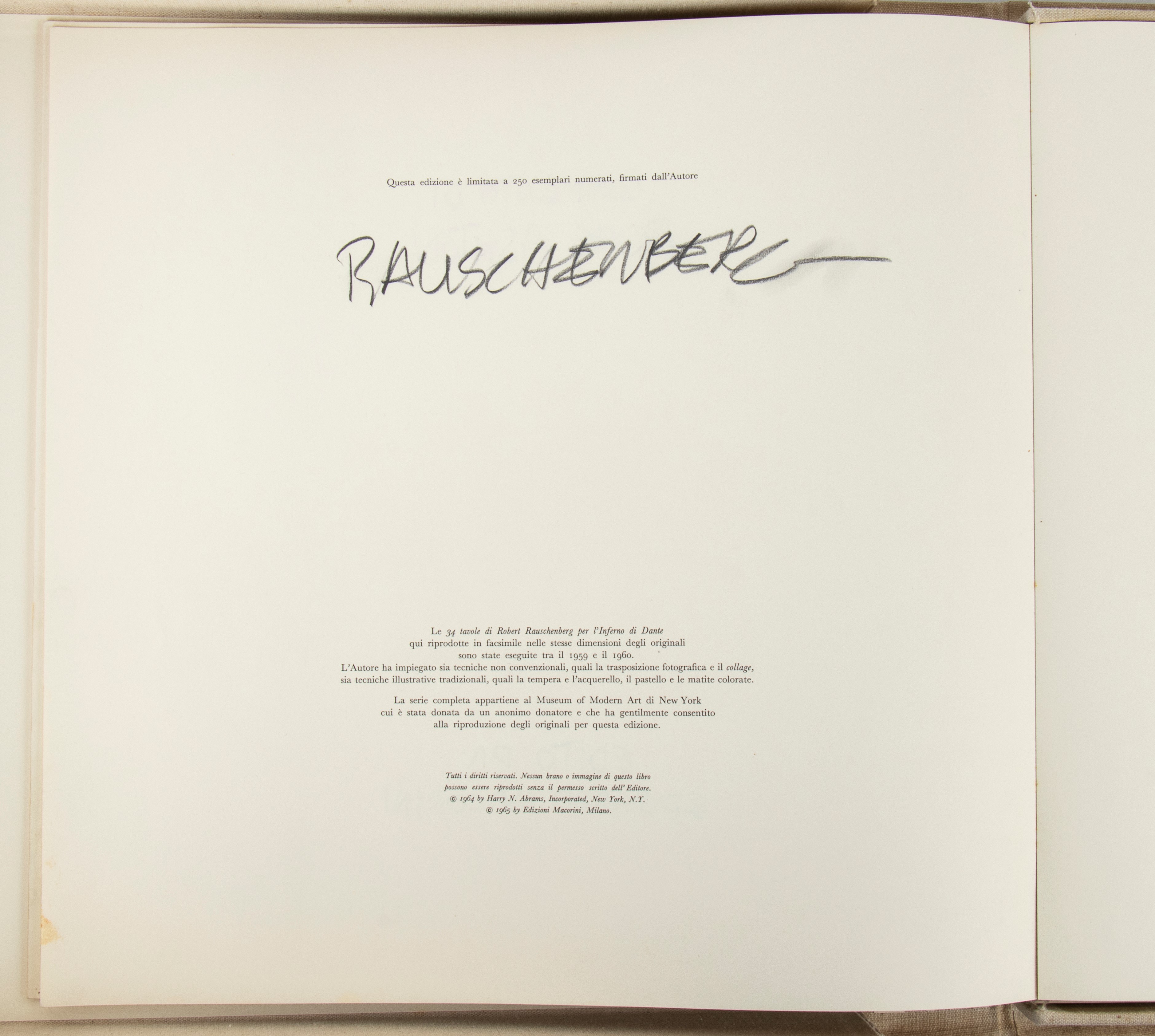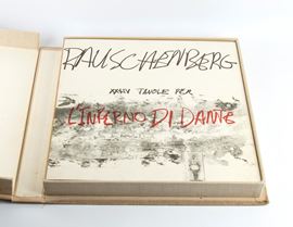 In-folio (430 x 440 mm). Portfolio completo di 34 stampe offset dalle litografie di Rauschenberg oggi a MOMA New York. Tiratura limitata, firmata da artista.