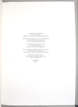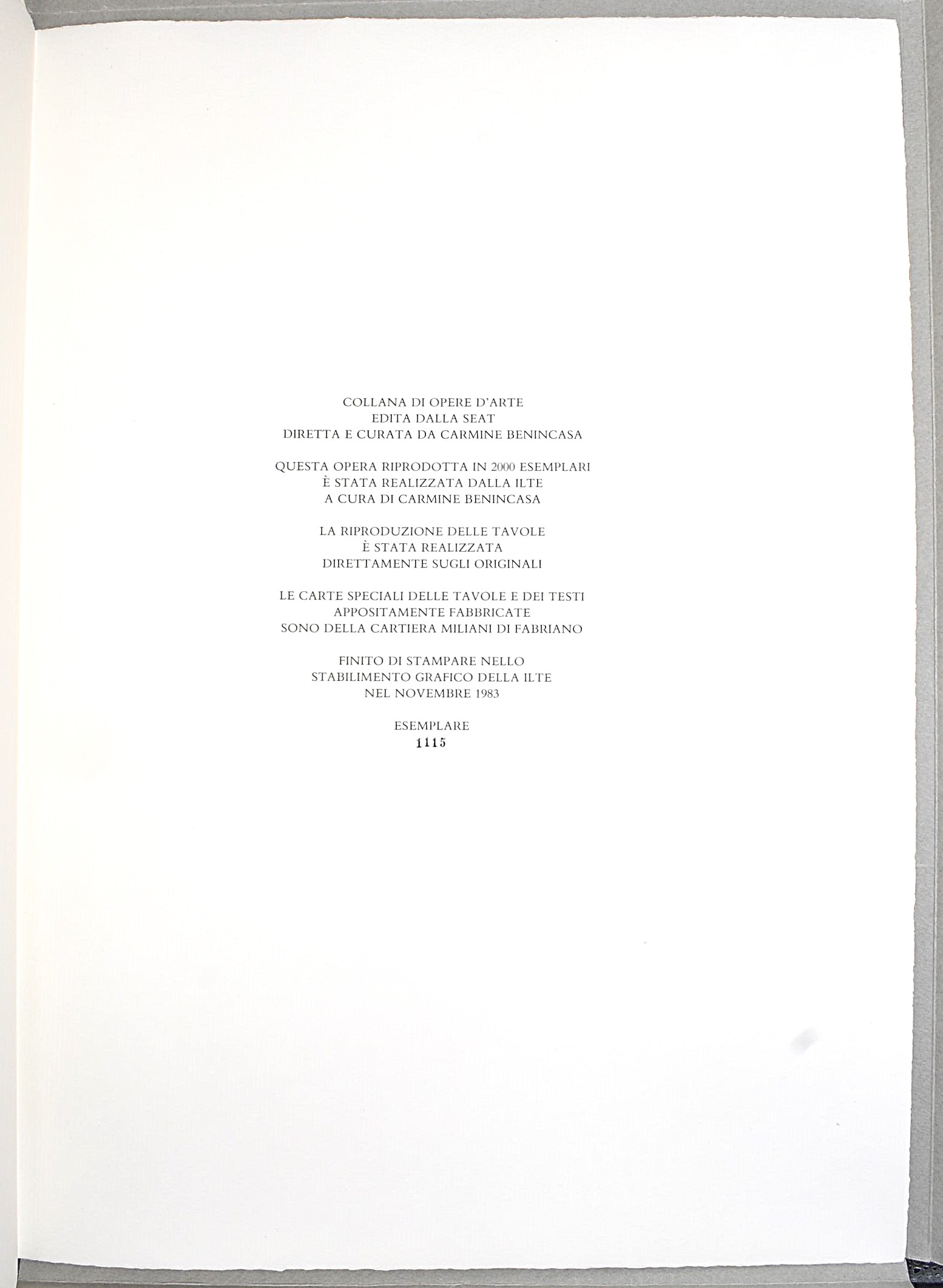 Edizione di lusso con riproduzione di 42 tavole, condotta direttamente sugli originali, le carte speciali delle tavole e dei testi sono state appositamente fabbricate dalla cartiera Miliani di Fabriano. Le tavole sono protette con velina feltro. Nostro esemplare n. 1115. In-folio. Cartella in cartoncino contenente i fogli di testo, scatola in piena tela grezza con titolo impresso al piatto contenente sia le tavole sia i fogli di testo.