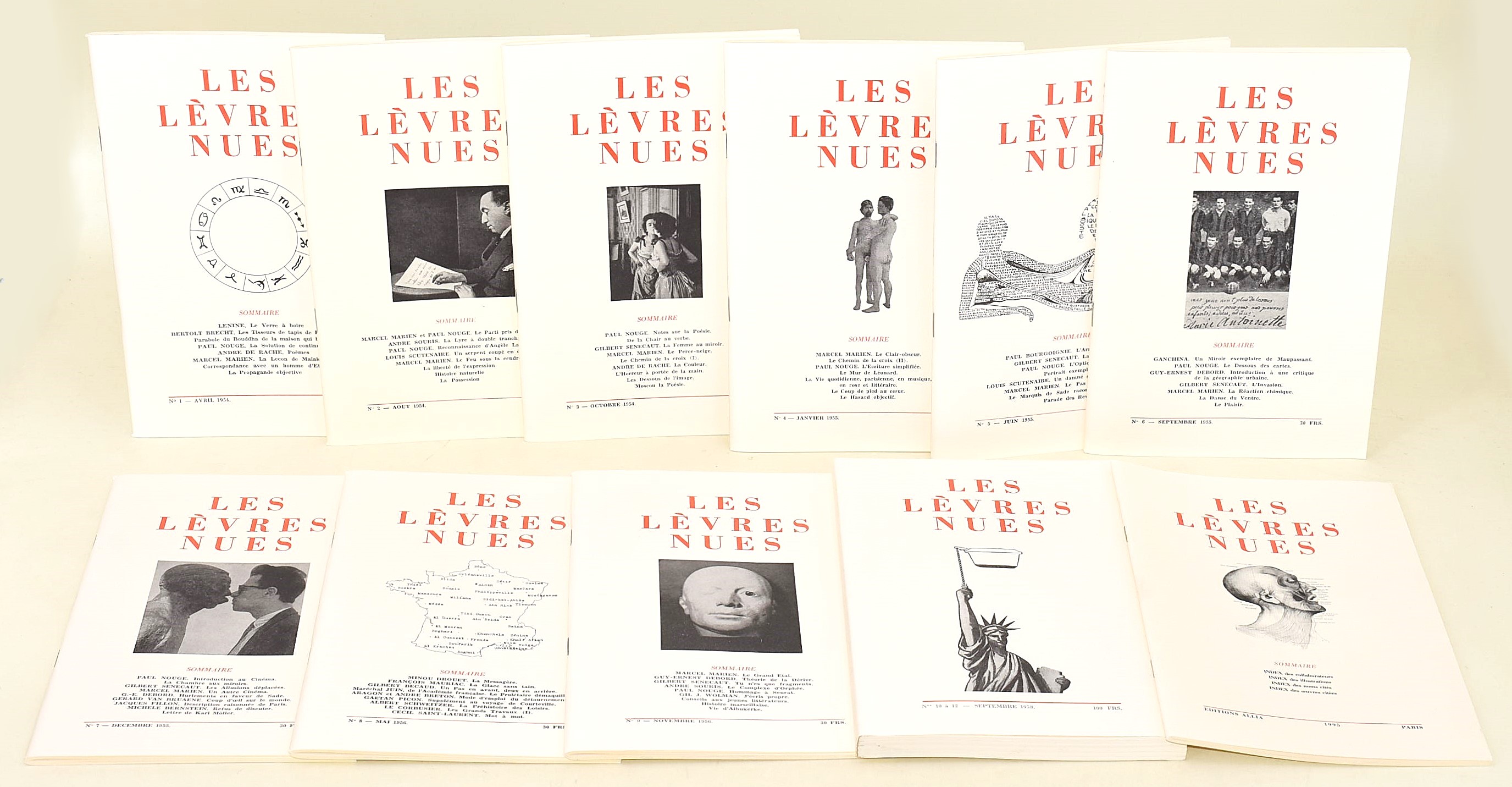 Les Lèvres Nues, Editions Allia, numeri: 1 (avril 1954), 2 (aout 1954), 3 (octobre 1954), 4 (janvier 1955), 5 (juin 1955), 6 (septembre 1955), 7 (decembre 1955), 8 (mai 1955), 9 (novembre 1956), 10-12 (septembre 1958), index (1955). Opuscoli editoriali, in francese, conservati cofanetto.