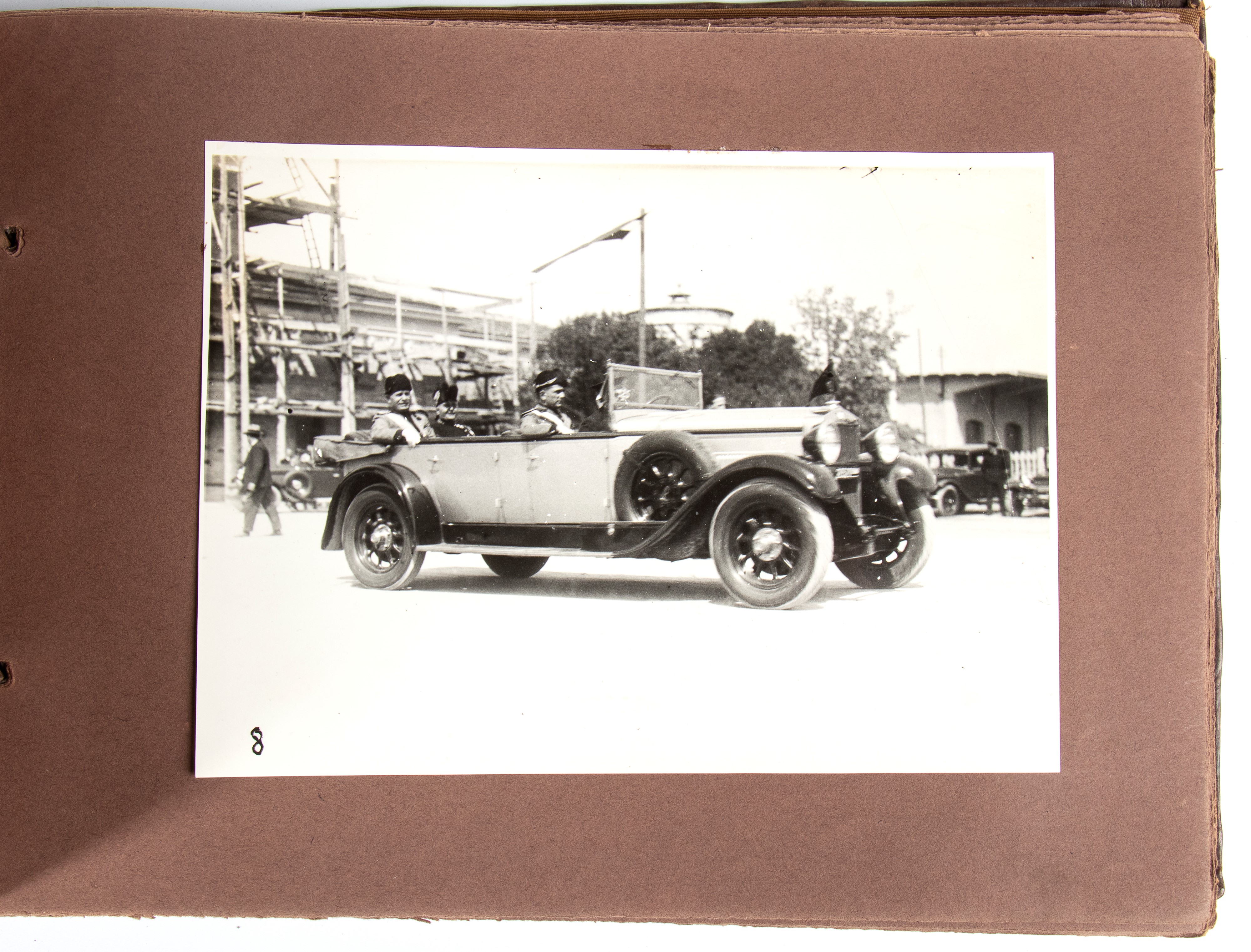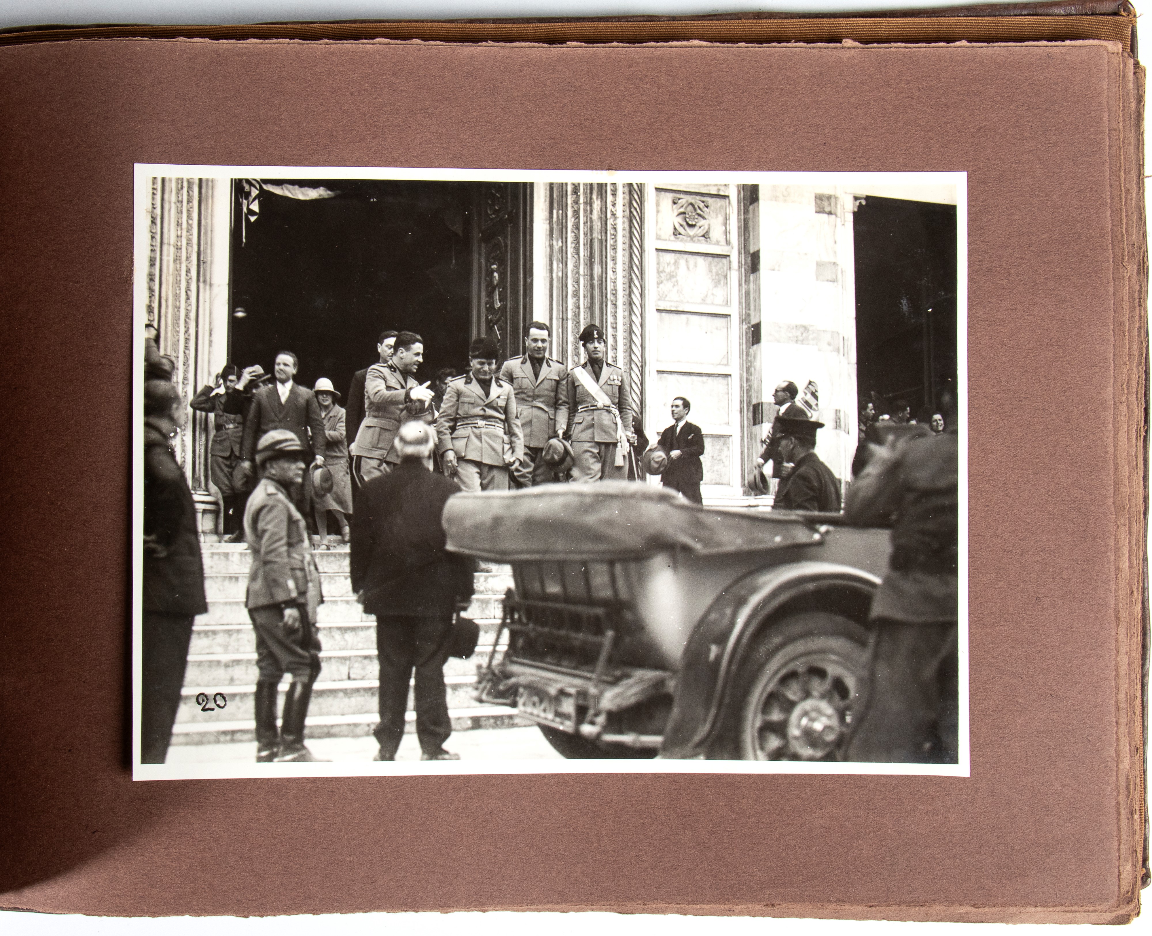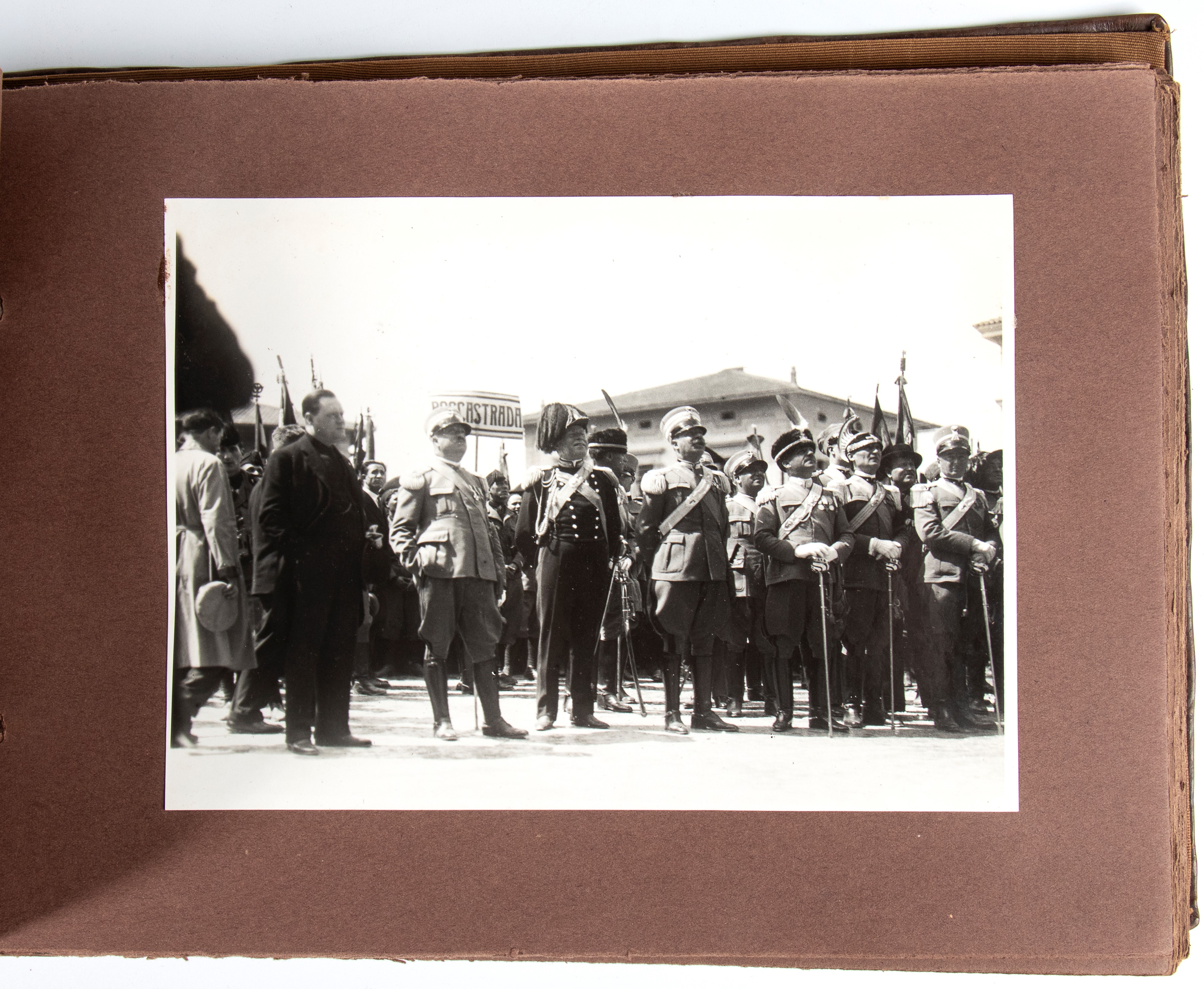 Album in pelle sigillata con impresso "La visita del Duce a Grosseto 10 maggio1930 VIII" sul frontespizio, contenente 40 fotografie 18cmX24cm raffiguranti il duce, autorità locali e personaggi vari della città. In ottimo stato.