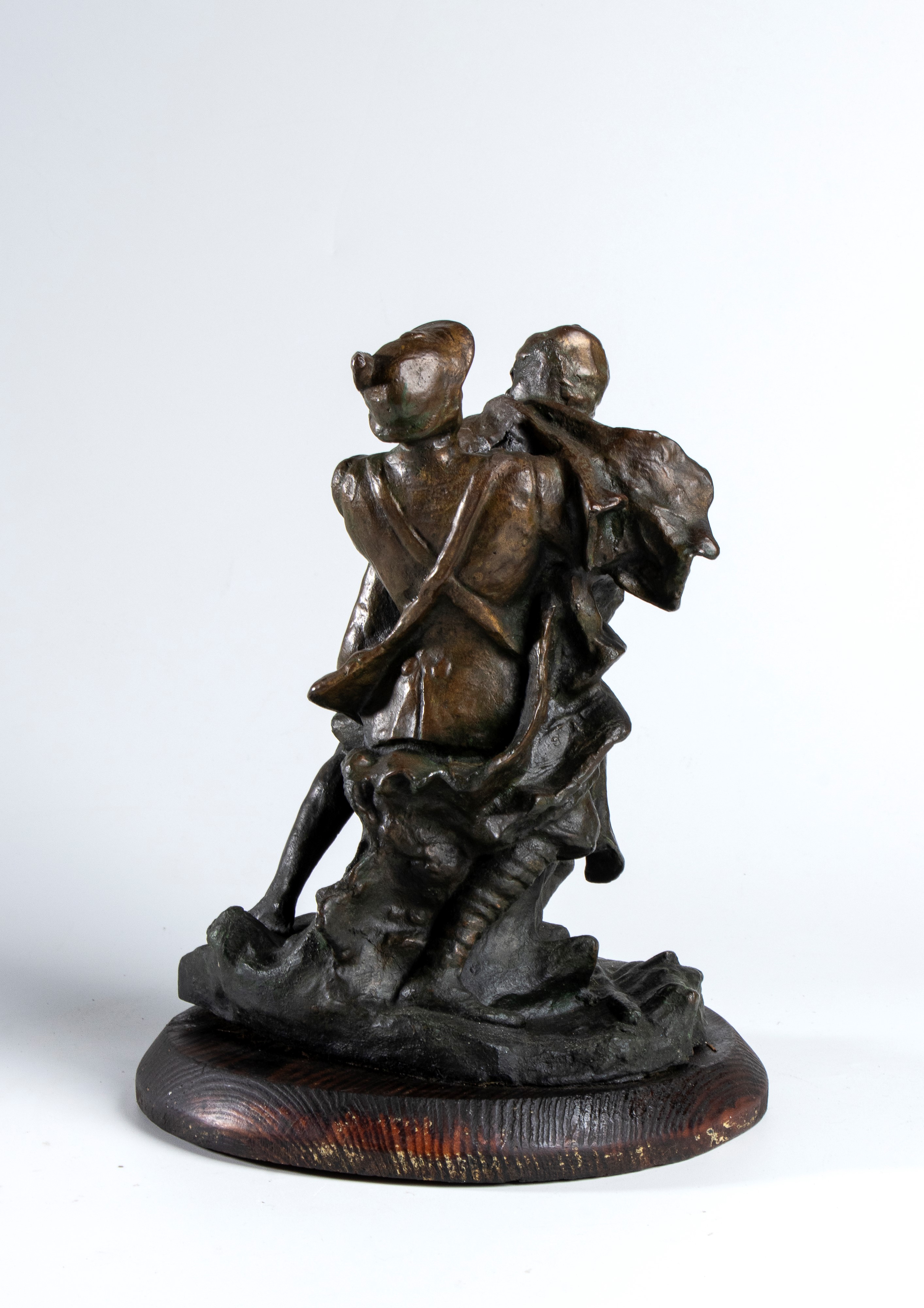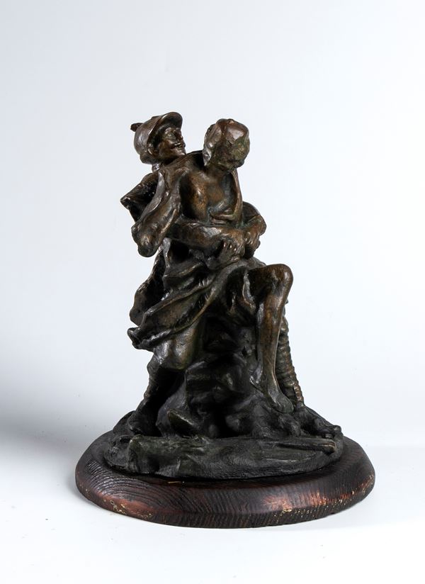 Scultura in fusione di bronzo rappresentante alpino in lotta con indigeno armato. Su base lignea. In ottimo stato.