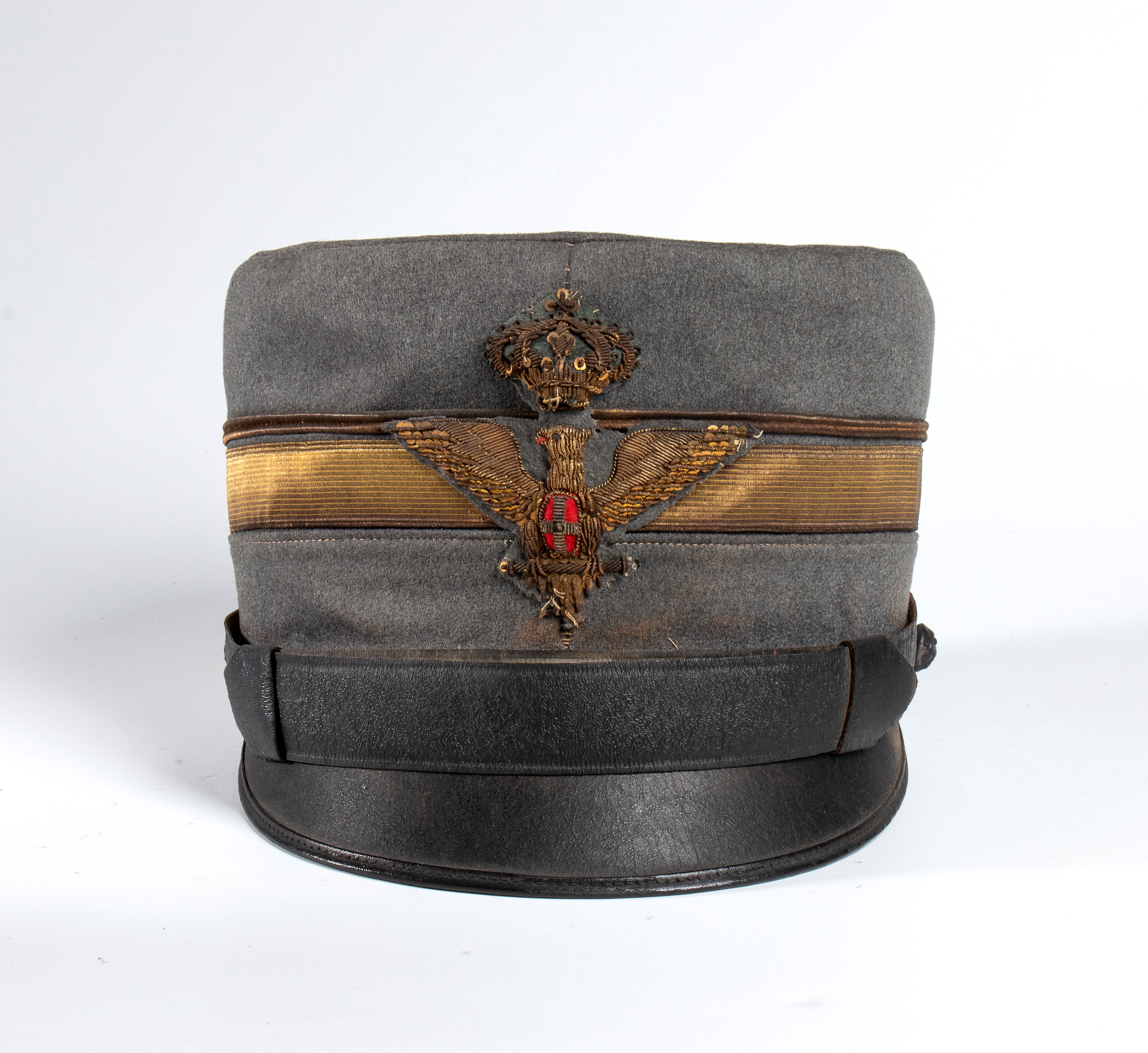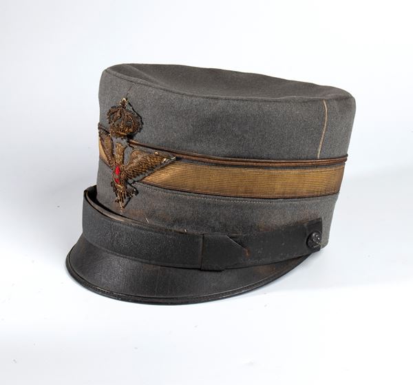 Rarissimo berretto da Ufficiale di Stato Maggiore dalla tipica forma rigida, corpo in cartone ricoperto di panno di lana profilato del colore del servizio. Distintivi di grado e bel fregio frontale. Raro e in buono stato.