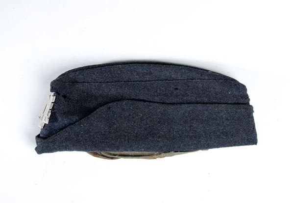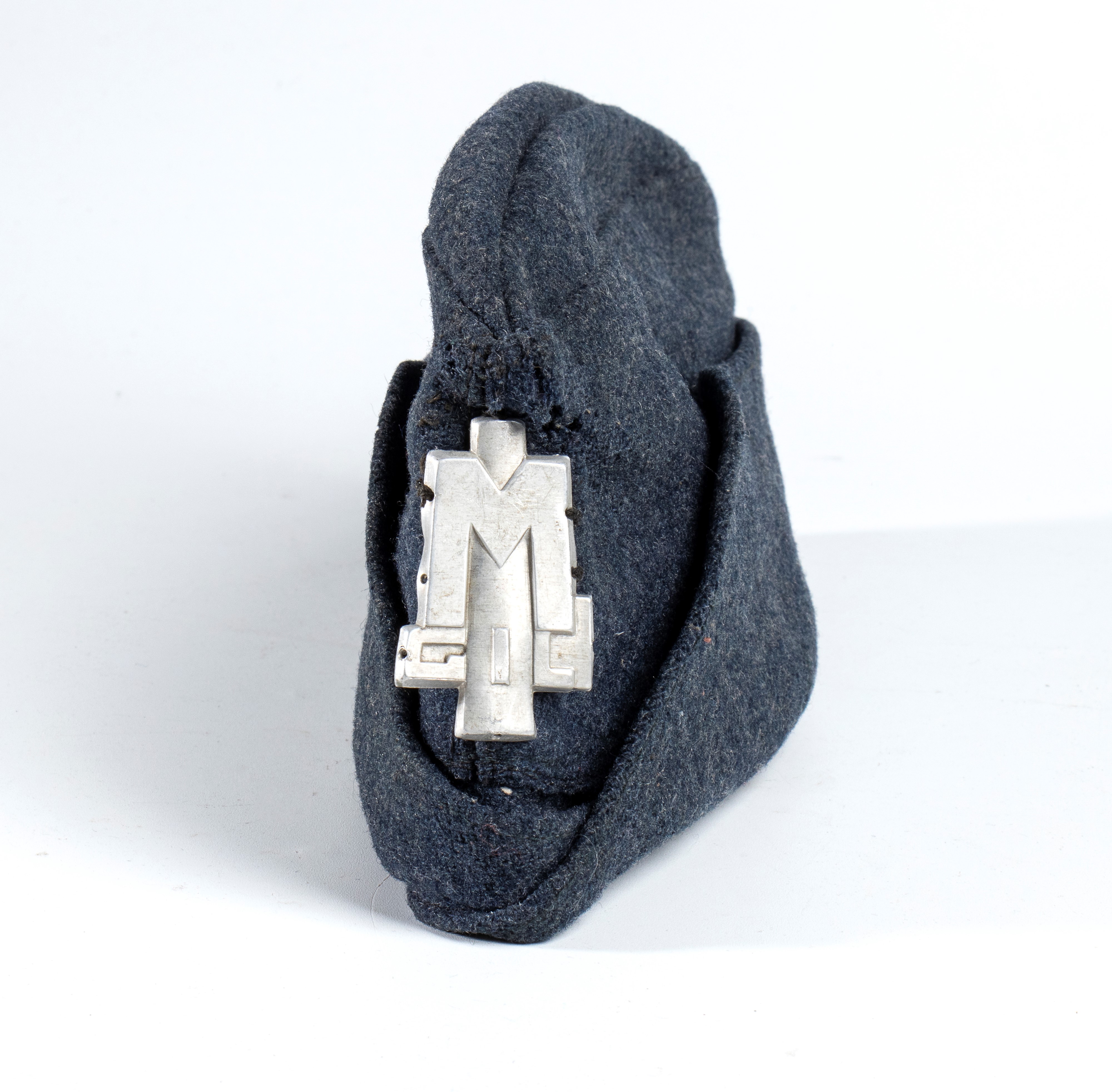 In lana grigio azzurra con fregio frontale di alluminio, fodera di tela grigia a lisca di pesce, alluda di pelle marrone, alcuni buchi di tarma. Interessante.