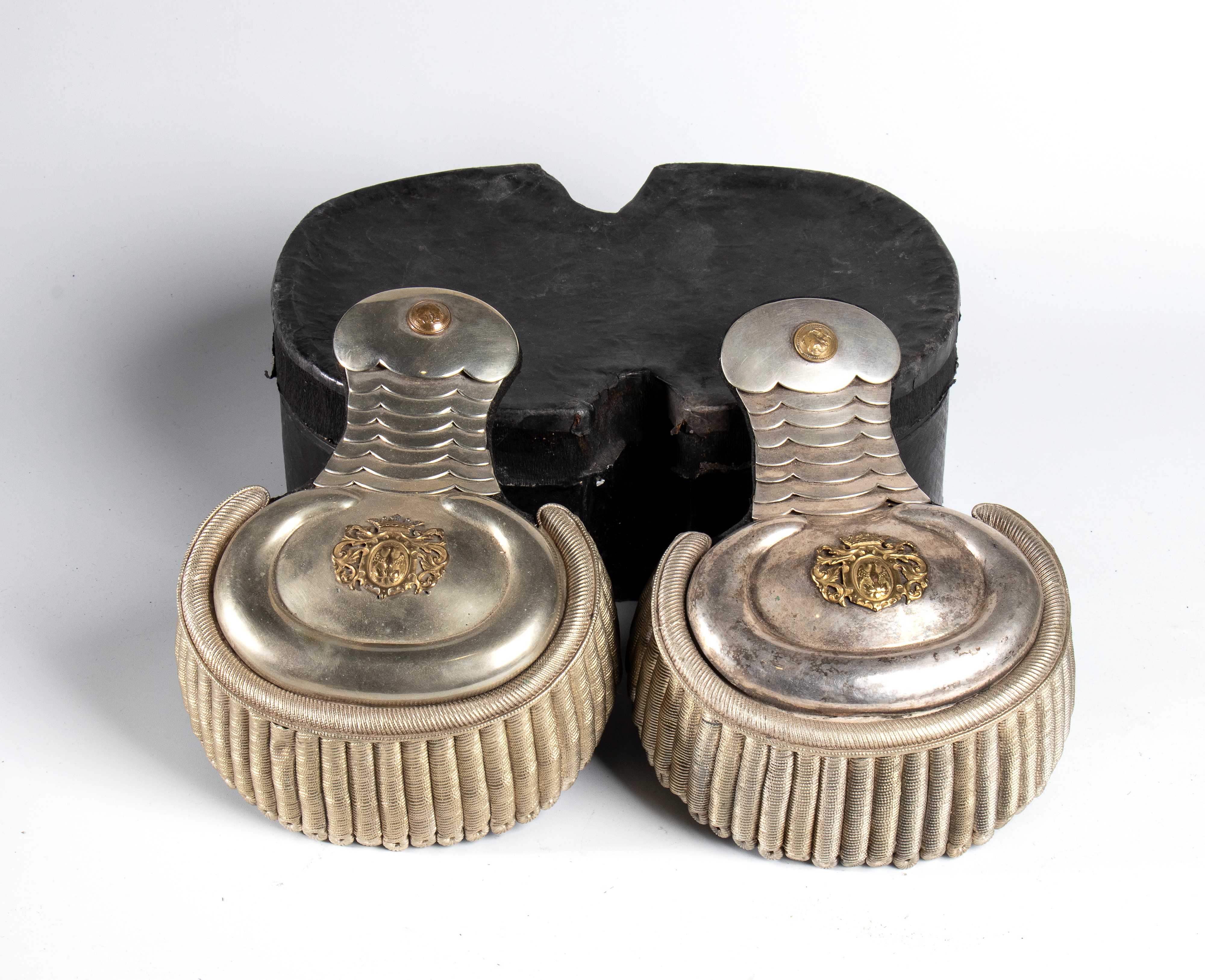 Bellissima coppia di spalline a frangia con stemma di casata nobile. In ottimo stato, con scatola.