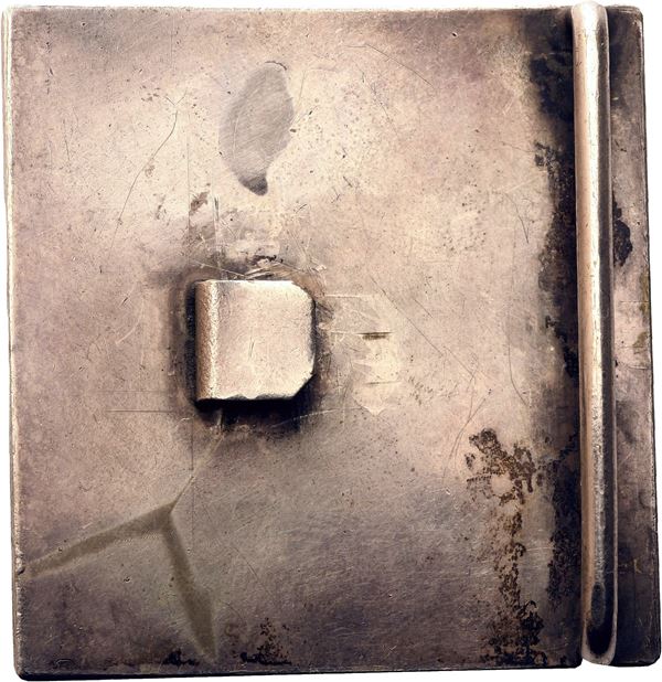 Bellissima fibbia in argento non punzonato di ottima fattura per un membro dei Moschettieri del Duce. Aquila e teschio di fusione applicati su fondo liscio bordato di cornice, tutto leggermente bombato. La fibbia è in ottimo stato di conservazione e di ottima fattura artigianale; differisce dalle canoniche fibbie di moschettieri solo per il fondo che è liscio invece che righettato. Molto bella e rara.