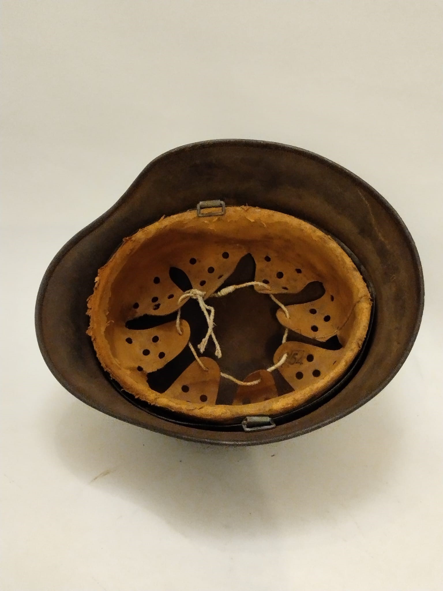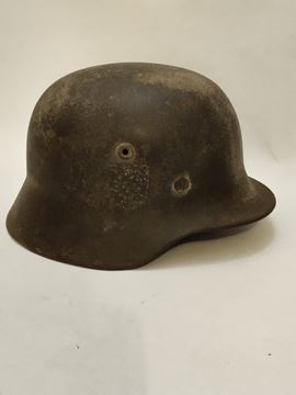Elmetto m.40 con vernice feldgrau e spruzzate di vernice bianca. All'elmetto è stato asportato lo scudetto con aquila. In buono stato, senza soggolo.