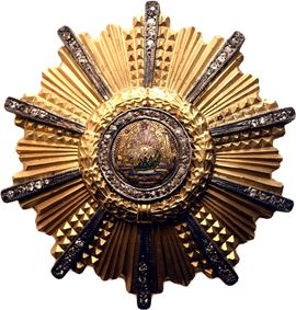 In metallo dorato e pietre nel perimetro dello stemma nazionale. In ottimo stato.