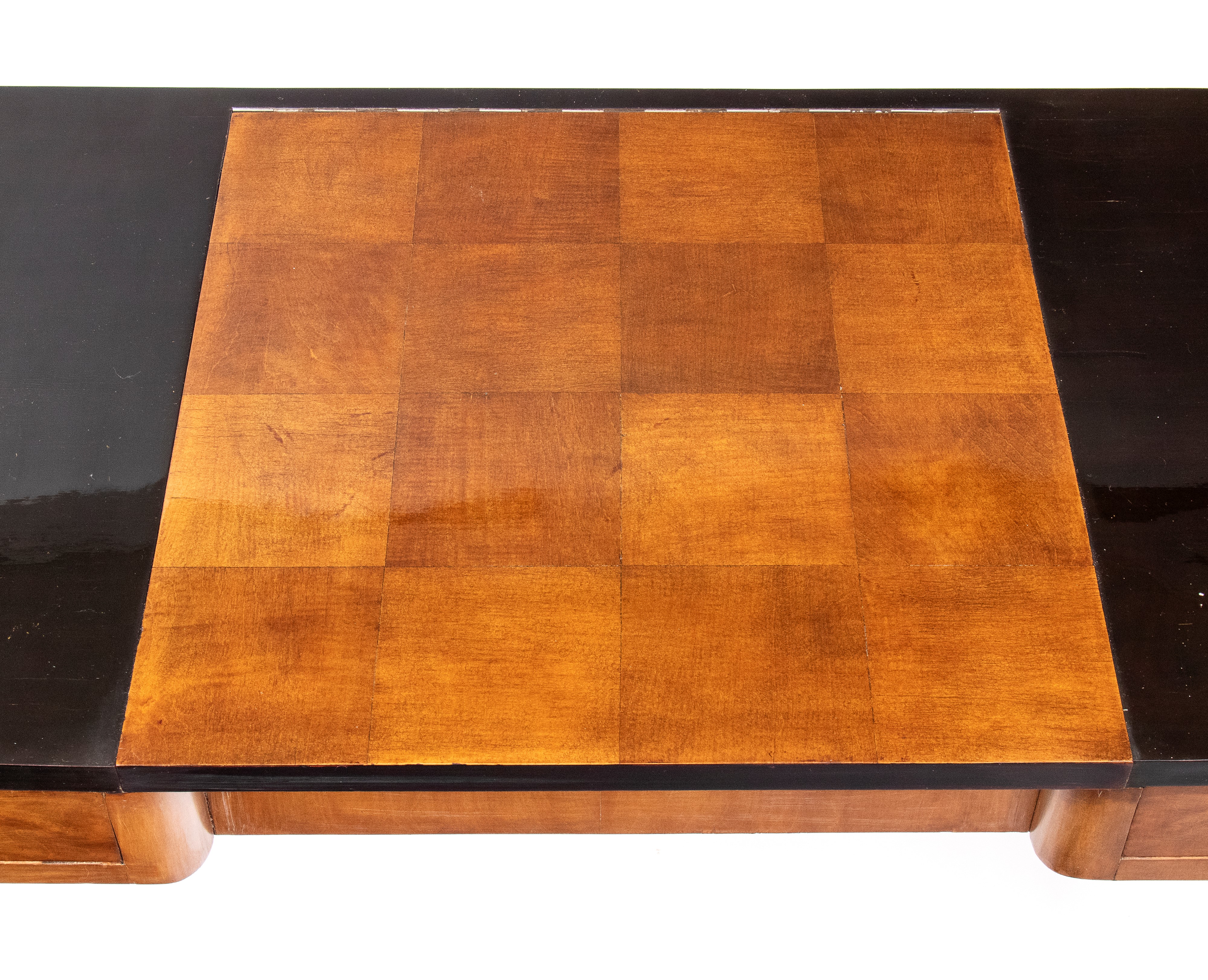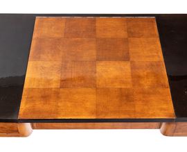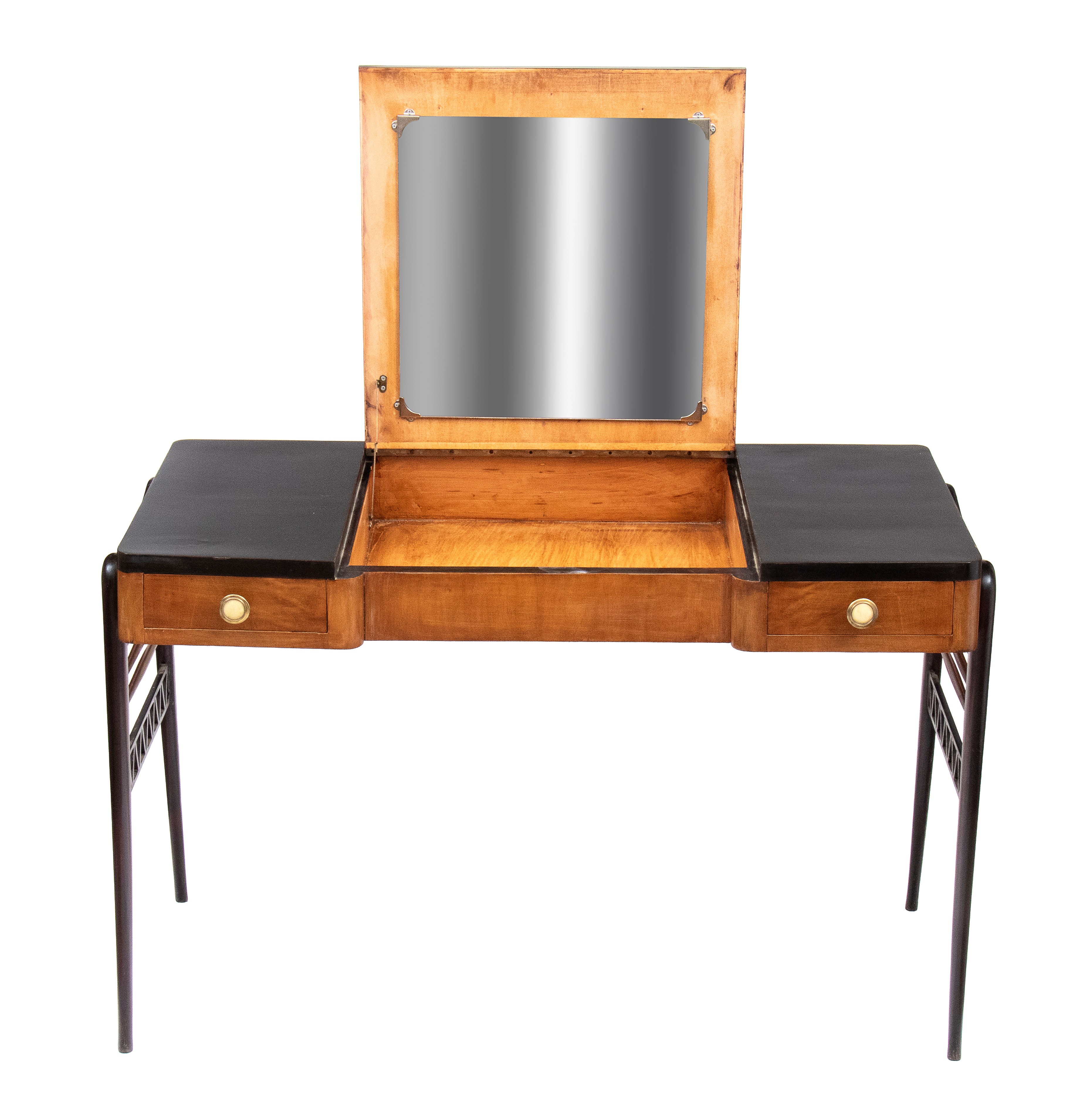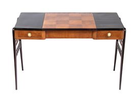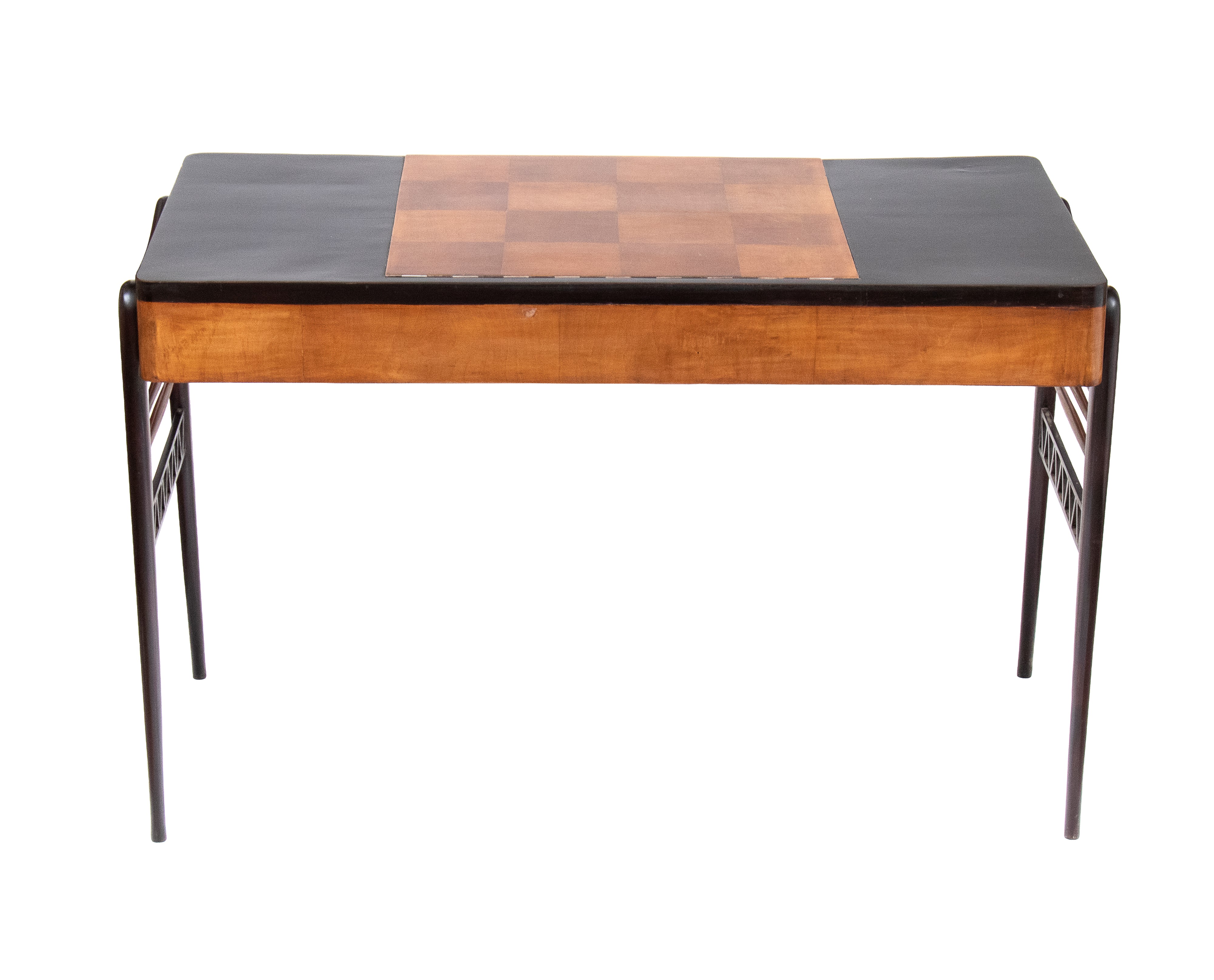 con piano tripartito. La sezione centrale, sollevabile a ribalta, rivela uno specchio rettangolare applicato sul pannello interno e una vano portaoggetti. Nella configurazione chiusa, la sezione centrale presenta una scacchiera due toni. Ai lati presenta due cassetti simmetrici con pomi circolari. La struttura è sorretta da quattro gambe in legno ebanizzato, raccordate lateralmente da doppie traverse orizzontali in noce e da una traversa inferiore a traforo con motivo geometrico triangolare ripetuto.