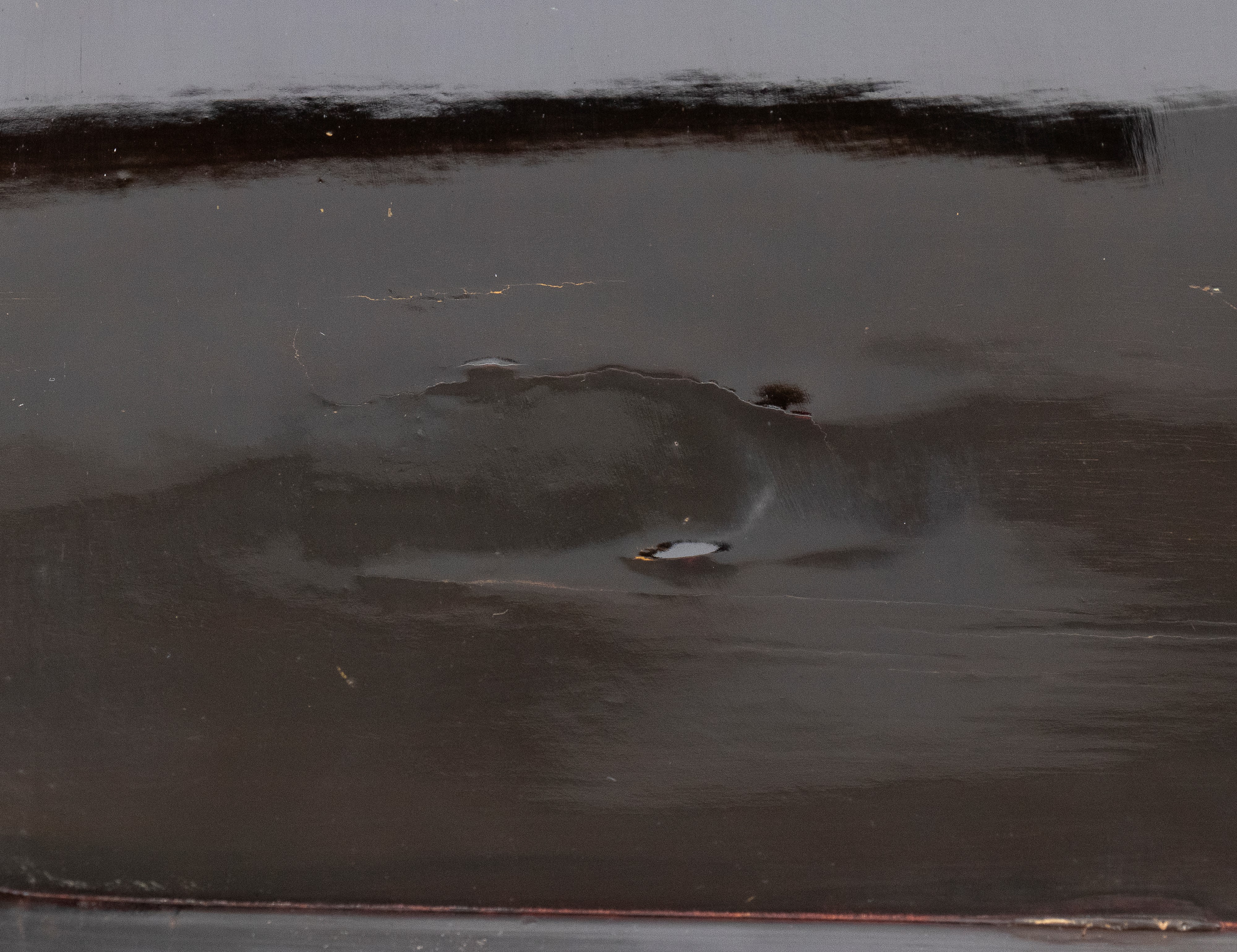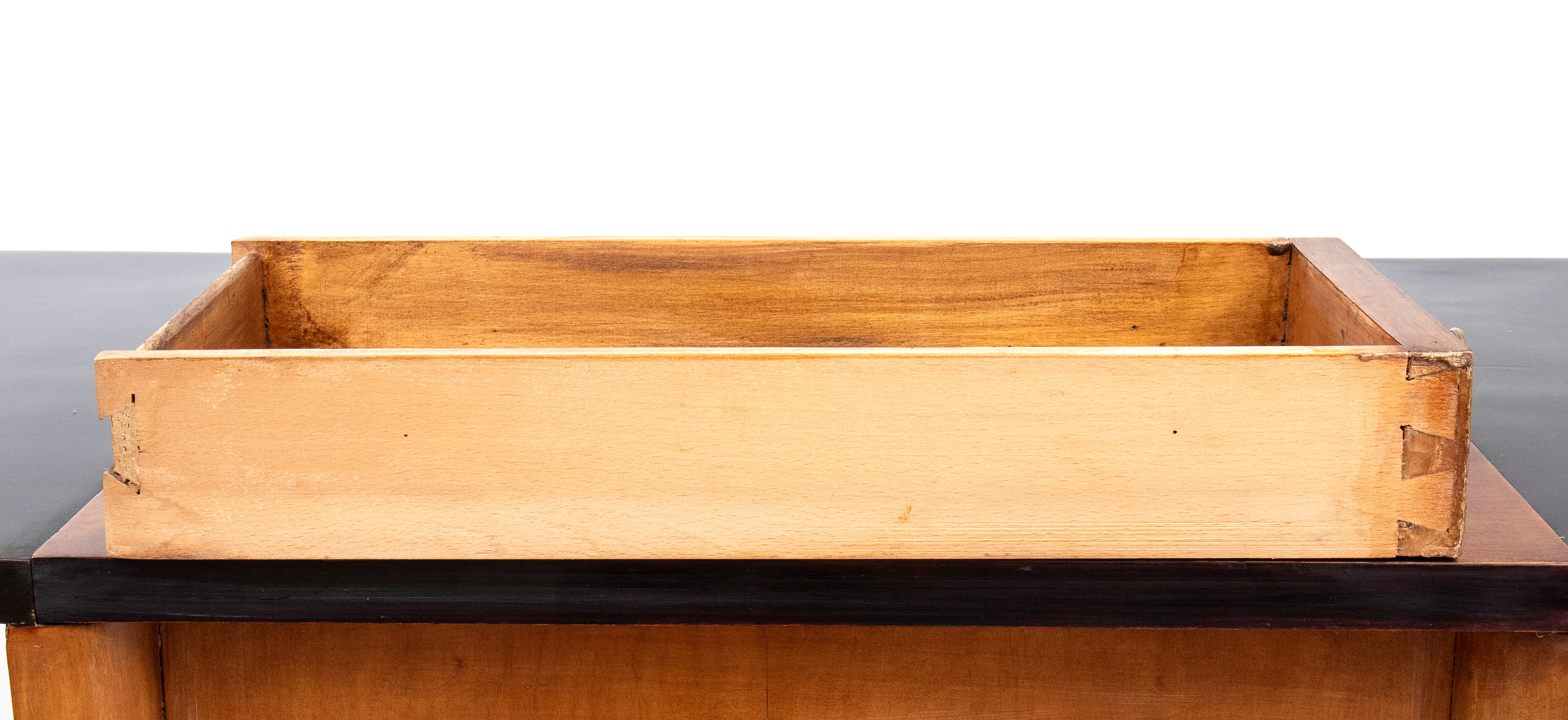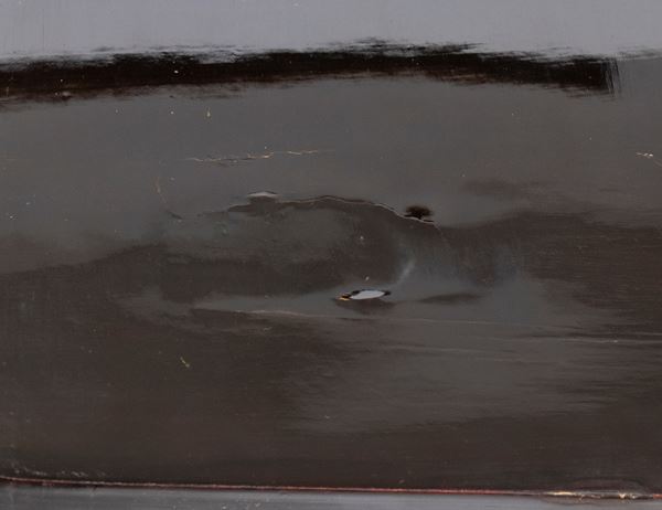 con piano tripartito. La sezione centrale, sollevabile a ribalta, rivela uno specchio rettangolare applicato sul pannello interno e una vano portaoggetti. Nella configurazione chiusa, la sezione centrale presenta una scacchiera due toni. Ai lati presenta due cassetti simmetrici con pomi circolari. La struttura è sorretta da quattro gambe in legno ebanizzato, raccordate lateralmente da doppie traverse orizzontali in noce e da una traversa inferiore a traforo con motivo geometrico triangolare ripetuto.