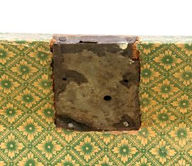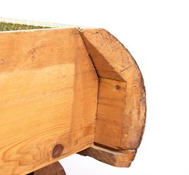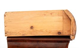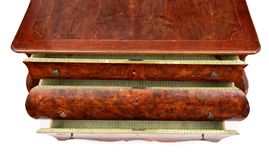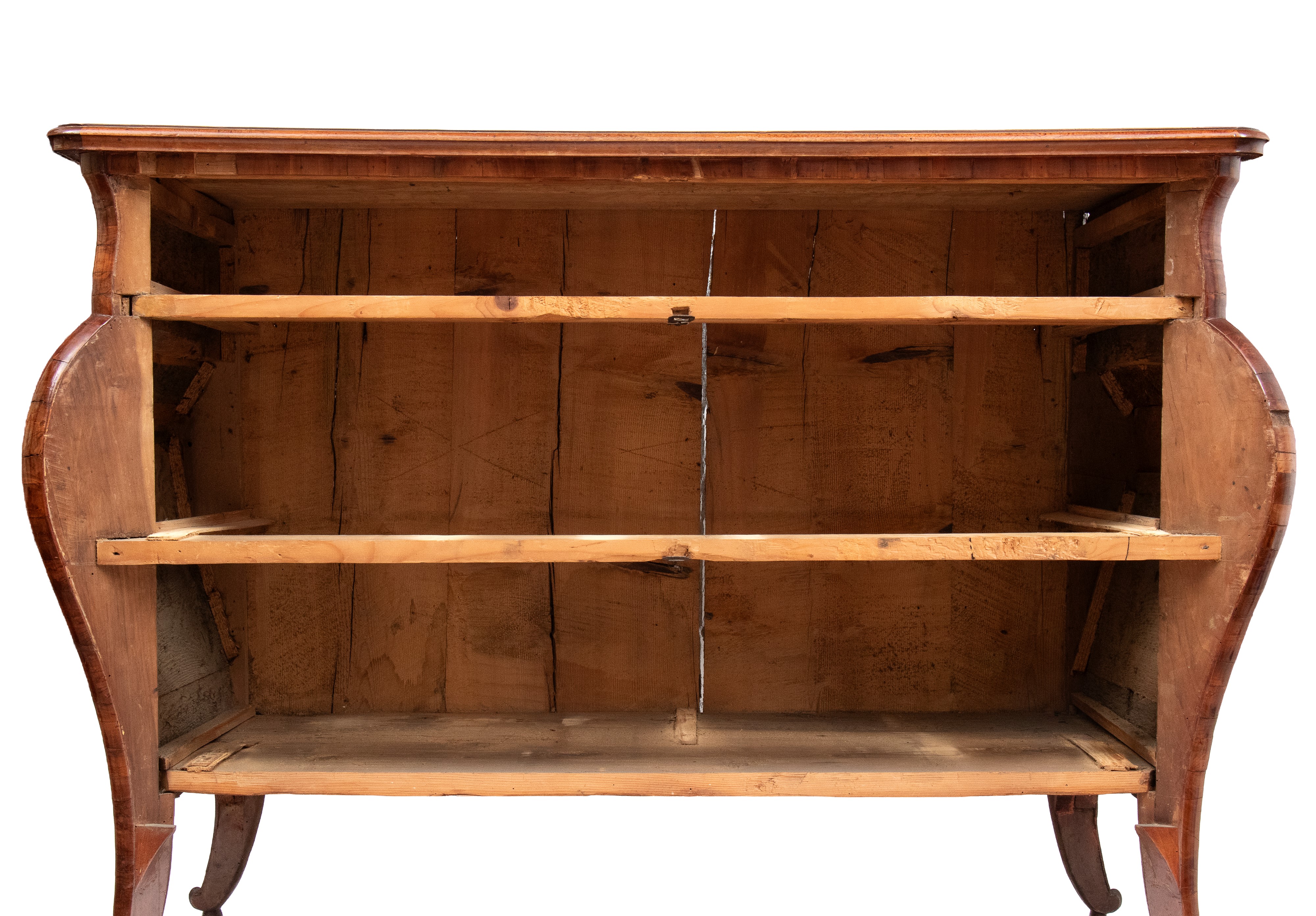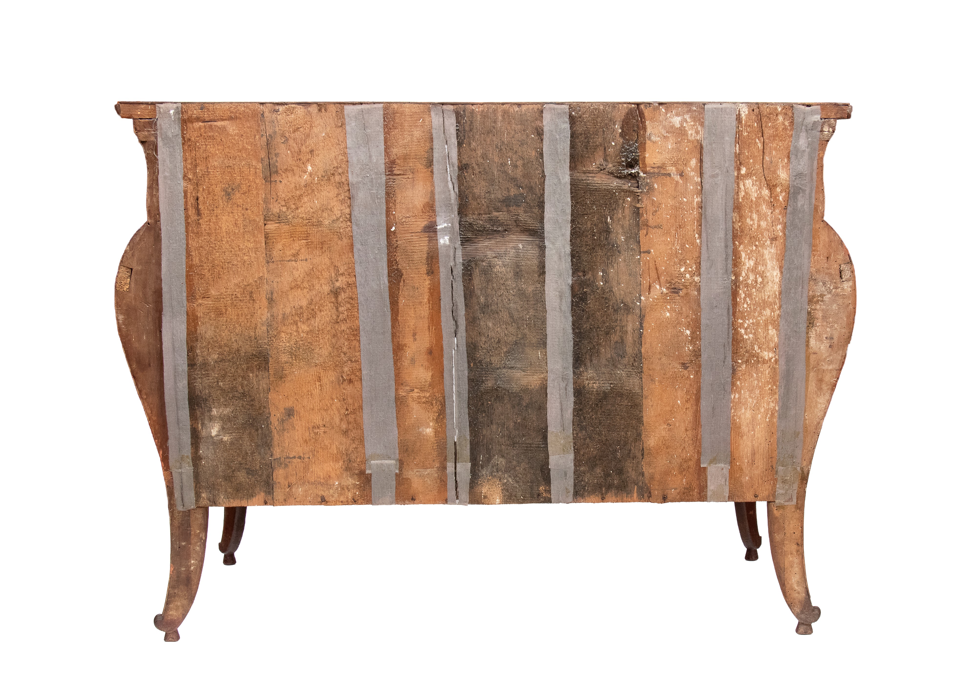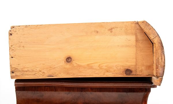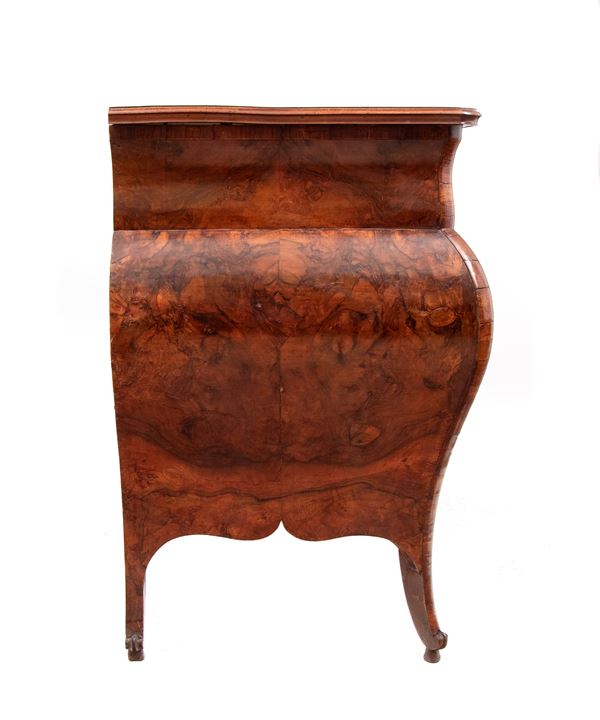 a fronte mosso di linea barocchetta, lastronato in radica di noce posta a motivi speculari. Piano sagomato, fascia sotto piano con cassetto, corpo bombato e grembiule mistilineo, poggiante su gambe mosse.