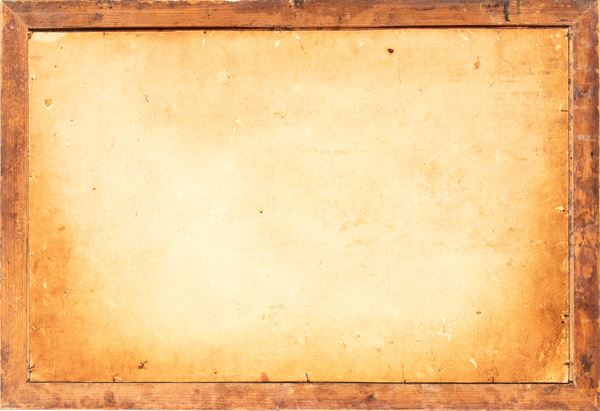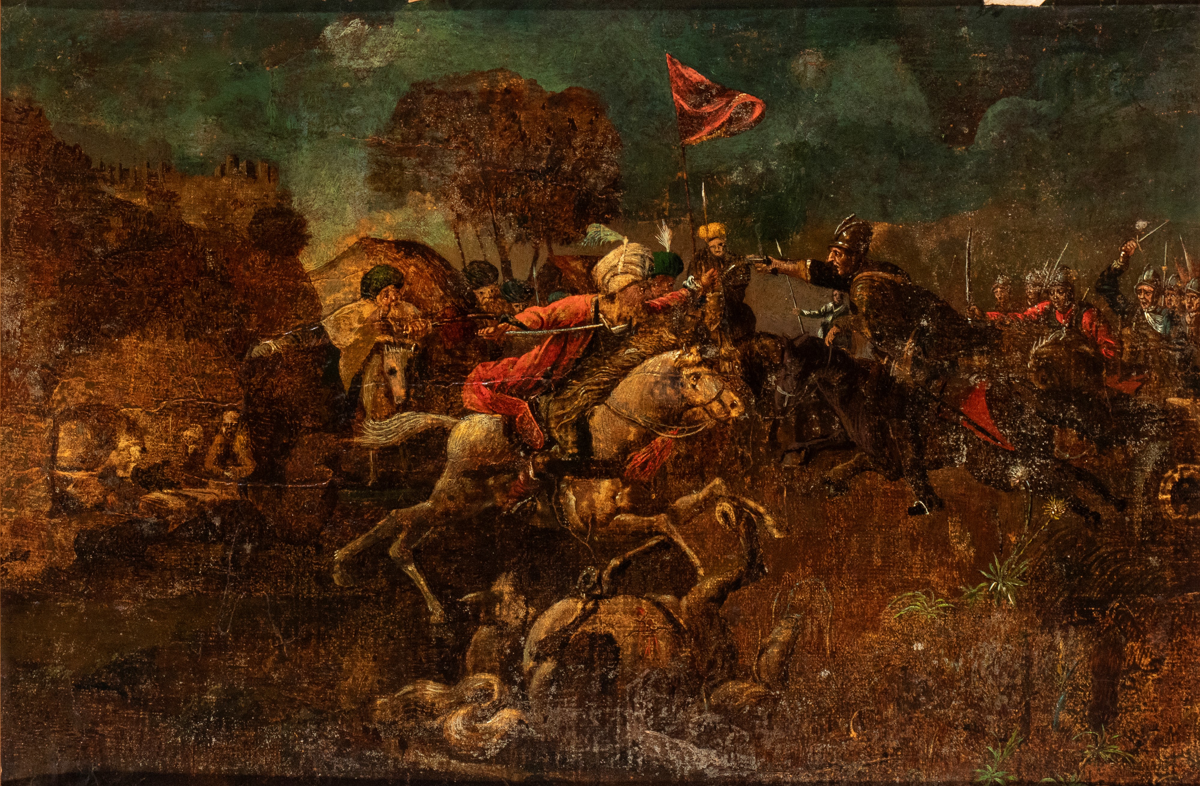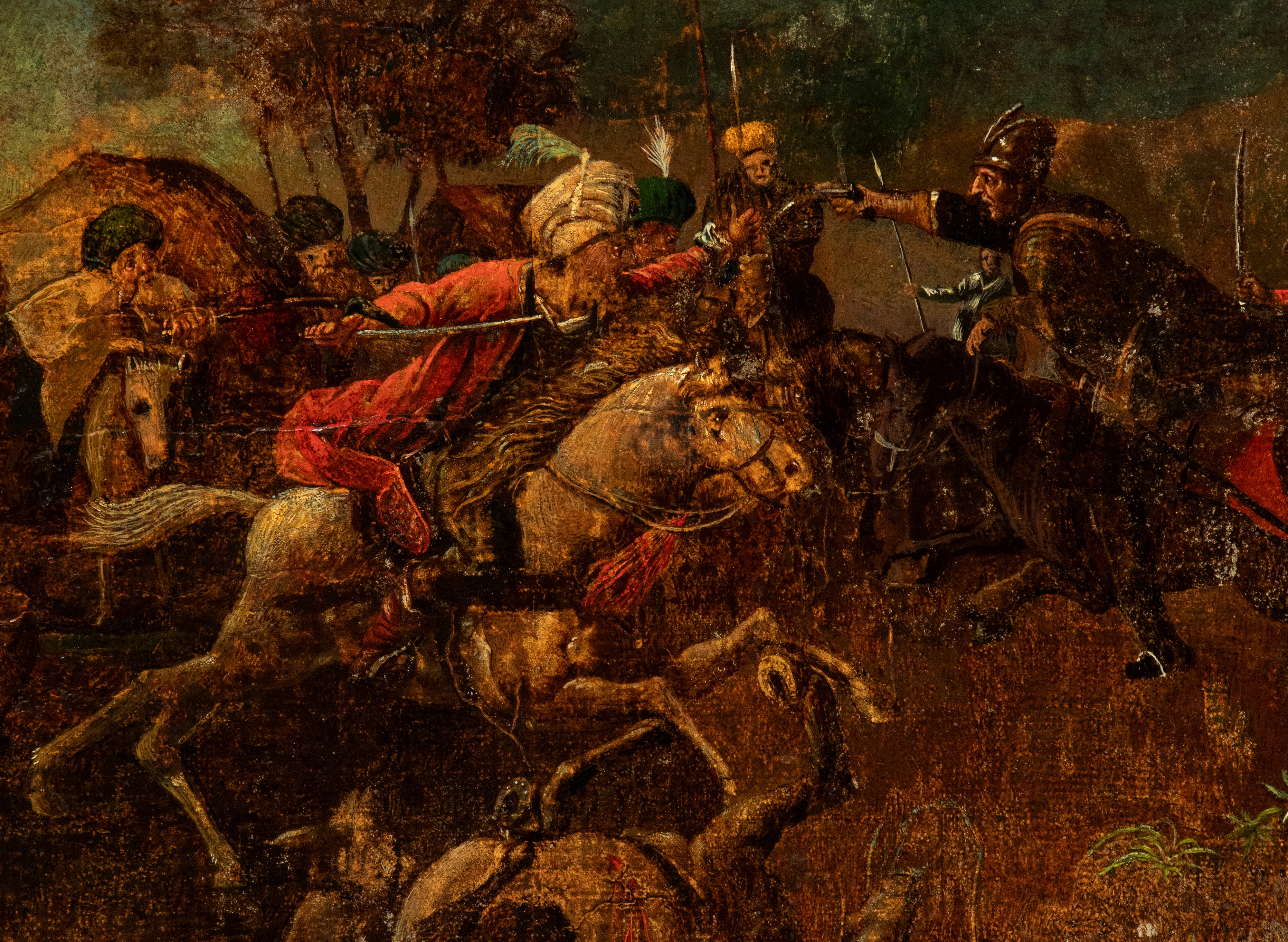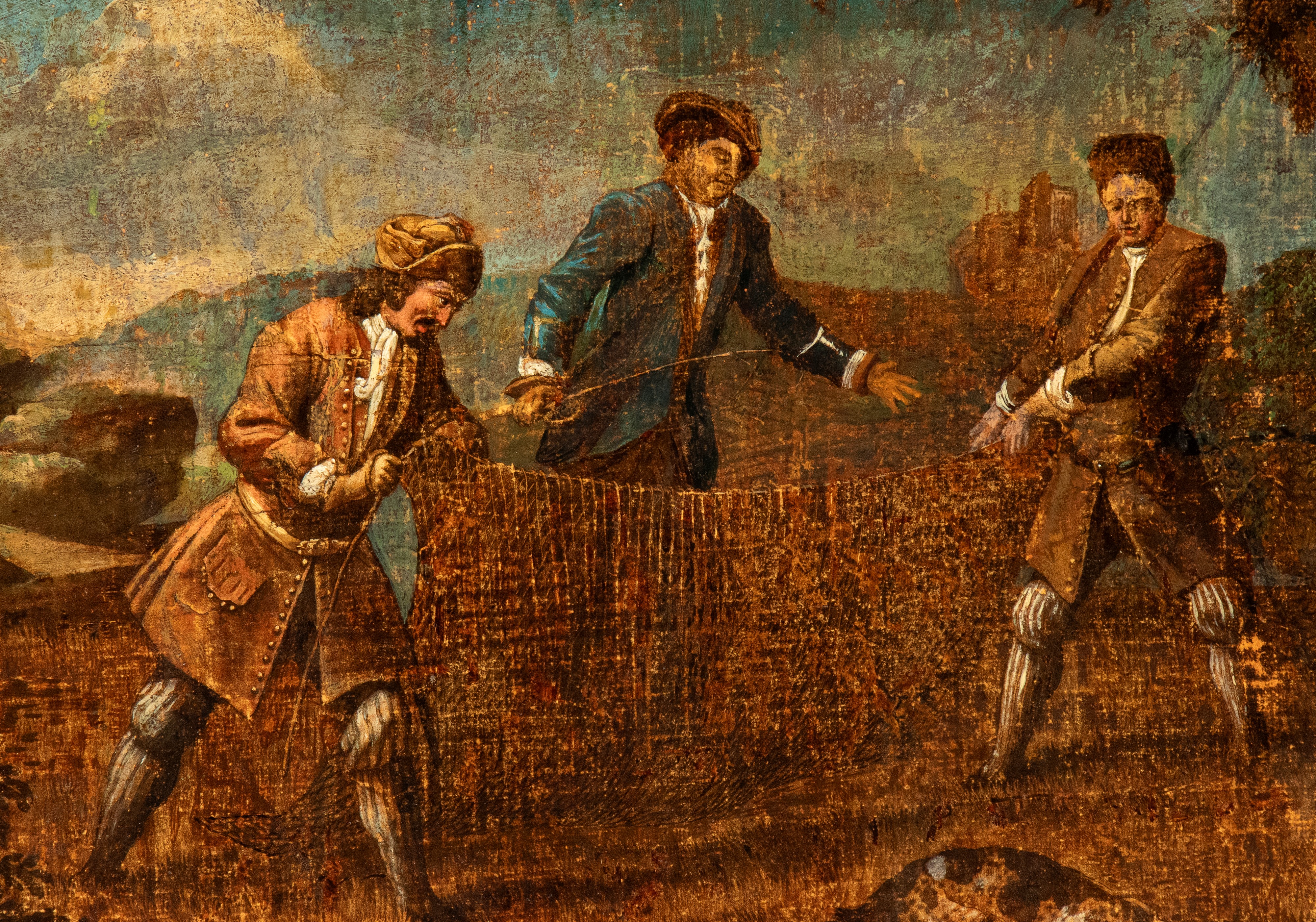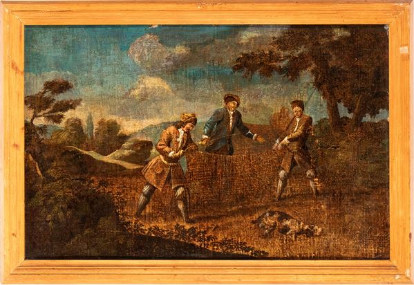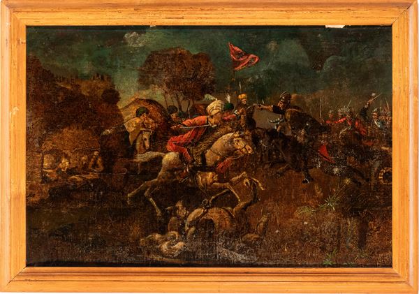 Il primo dipinto raffigura una concitata scena di battaglia: in primo piano, un cavaliere con un vistoso turbante bianco, identificabile come un soldato ottomano, cavalca un destriero grigio in un momento di scontro frontale. Il secondo dipinto, in netto contrasto tematico, presenta una scena bucolica di genere: tre figure maschili in abiti settecenteschi sono ritratte mentre manovrano una rete da uccellagione in un paesaggio campestre. Presentare dipinti di soggetti diversi, una battaglia e una scena bucolica, o di caccia, come pendant era una pratica comune, creando un contrasto tra il combattimento e la tranquillità della vita rurale. Cornice lignea non coeva.