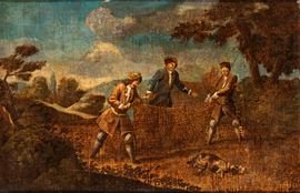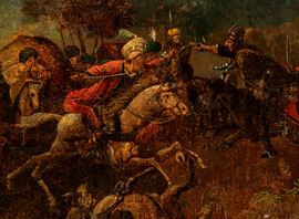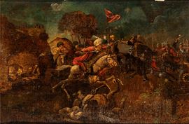 Coppia di dipinti con scene di battaglia e di caccia, XVIII secolo