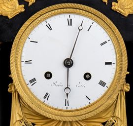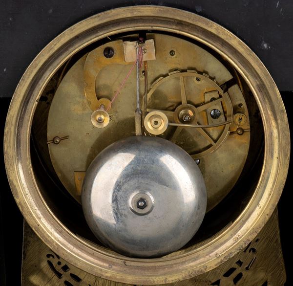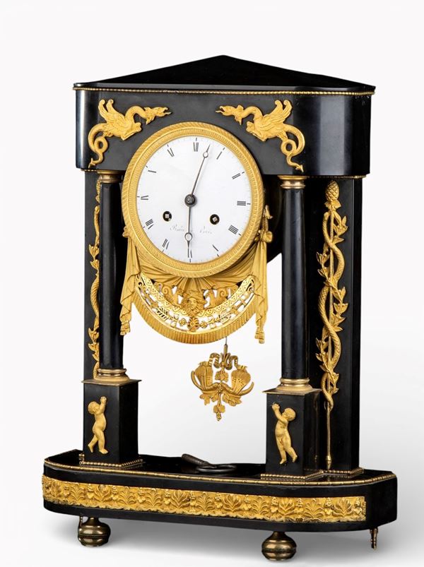cassa a tempio in marmo nero del Belgio con putti, animali mitologici e decori in bronzo dorato, quadrante circolare in smalto bianco con numeri romani firmato "Robin a Paris"; l'assenza dei numeri Arabi alle ore 3, 6, 9 e 12 evidenzia che l’orologio è stato realizzato dopo il 1814, mentre il tipo di firma è caratteristica dello smaltatore François-Marie Dubuisson molto prolifico dal periodo Luigi XVI fino alla sua morte avvenuta a Belleville vicino a Parigi il 6 aprile 1832. Movimento con sospensione a filo, regolatore a pendolo e suoneria delle ore e delle mezze su campana.