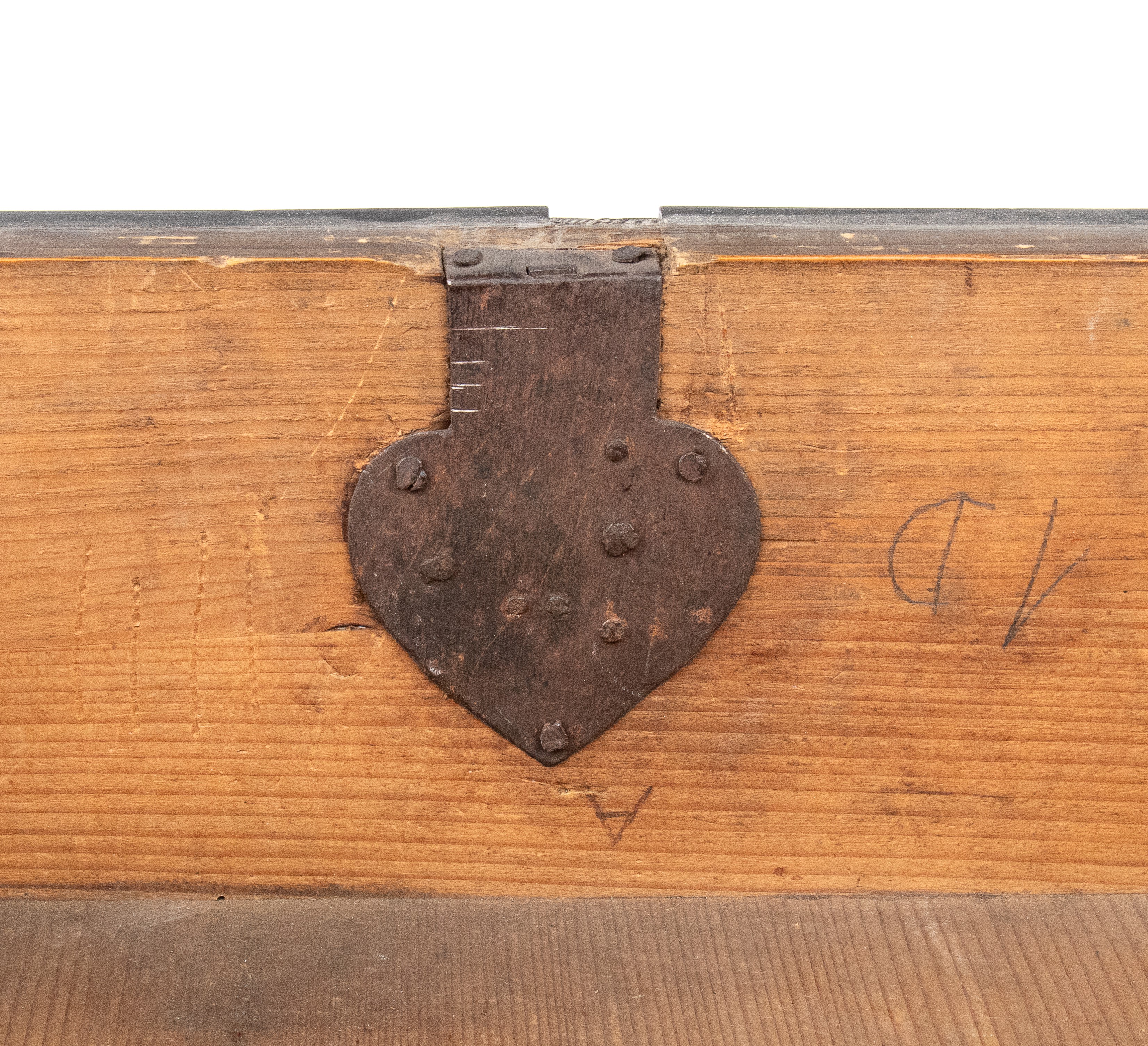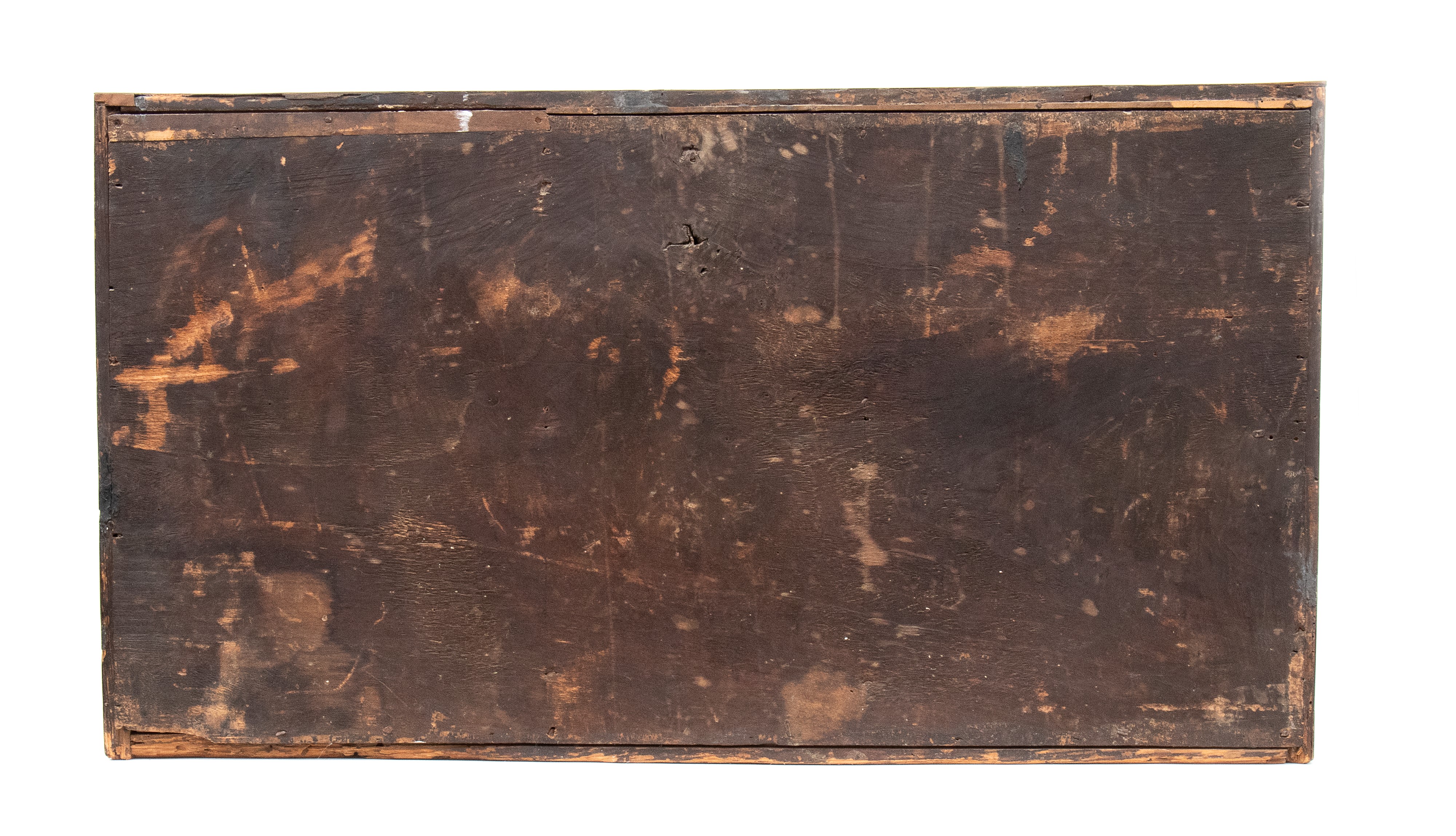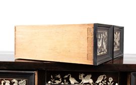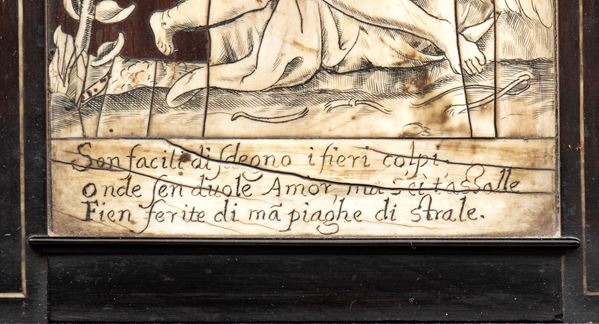 di forma rettangolare con fronte architettonico centrato da sportello celante cassettini interni. Interamente decorato con placche in osso incise raffiguranti uccelli, animali fantastici e motivi vegetali, oltre a scena centrale con figura allegorica accompagnata da iscrizione in lingua italiana di gusto barocco.