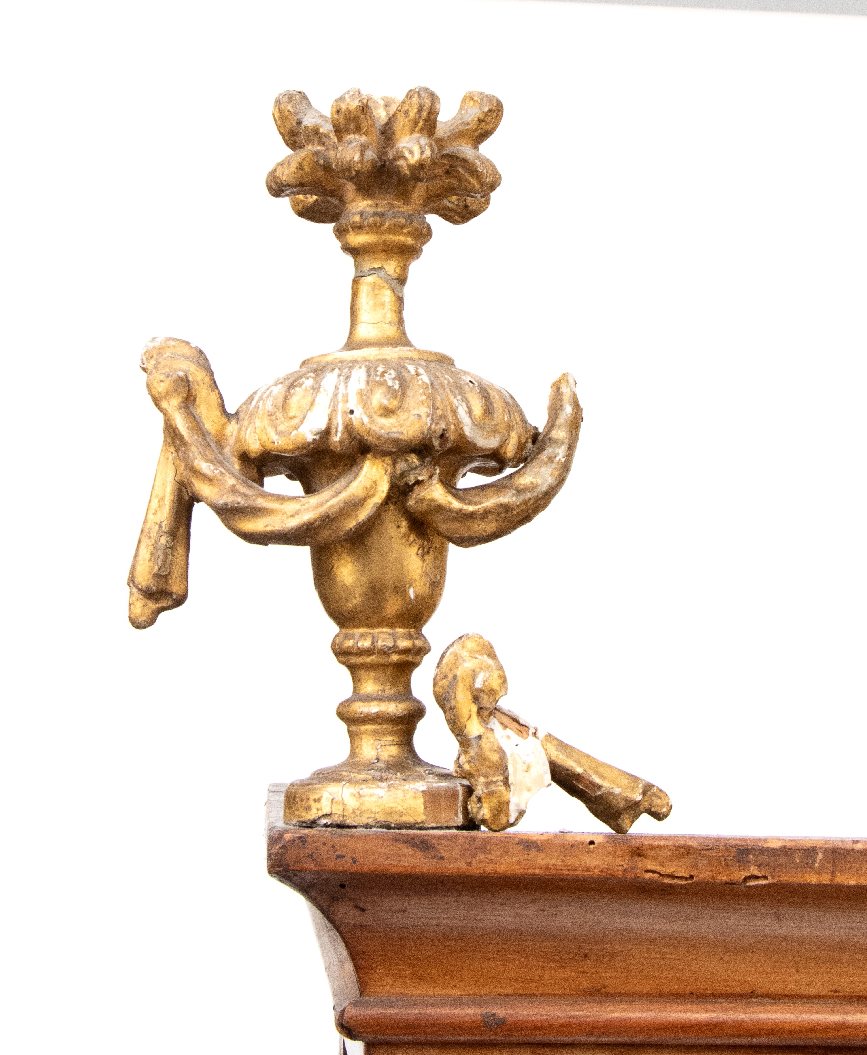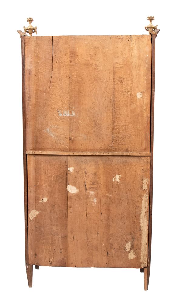 elegante vetrina a quattro ante vetrate, la cui sommità è impreziosita da una coppia di cimase laterali dorate a forma di vaso.