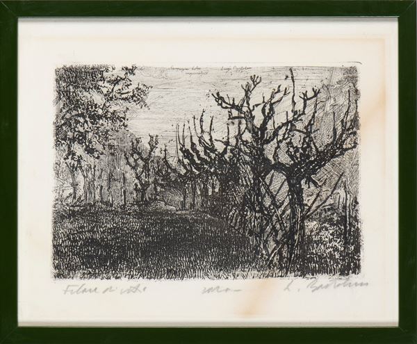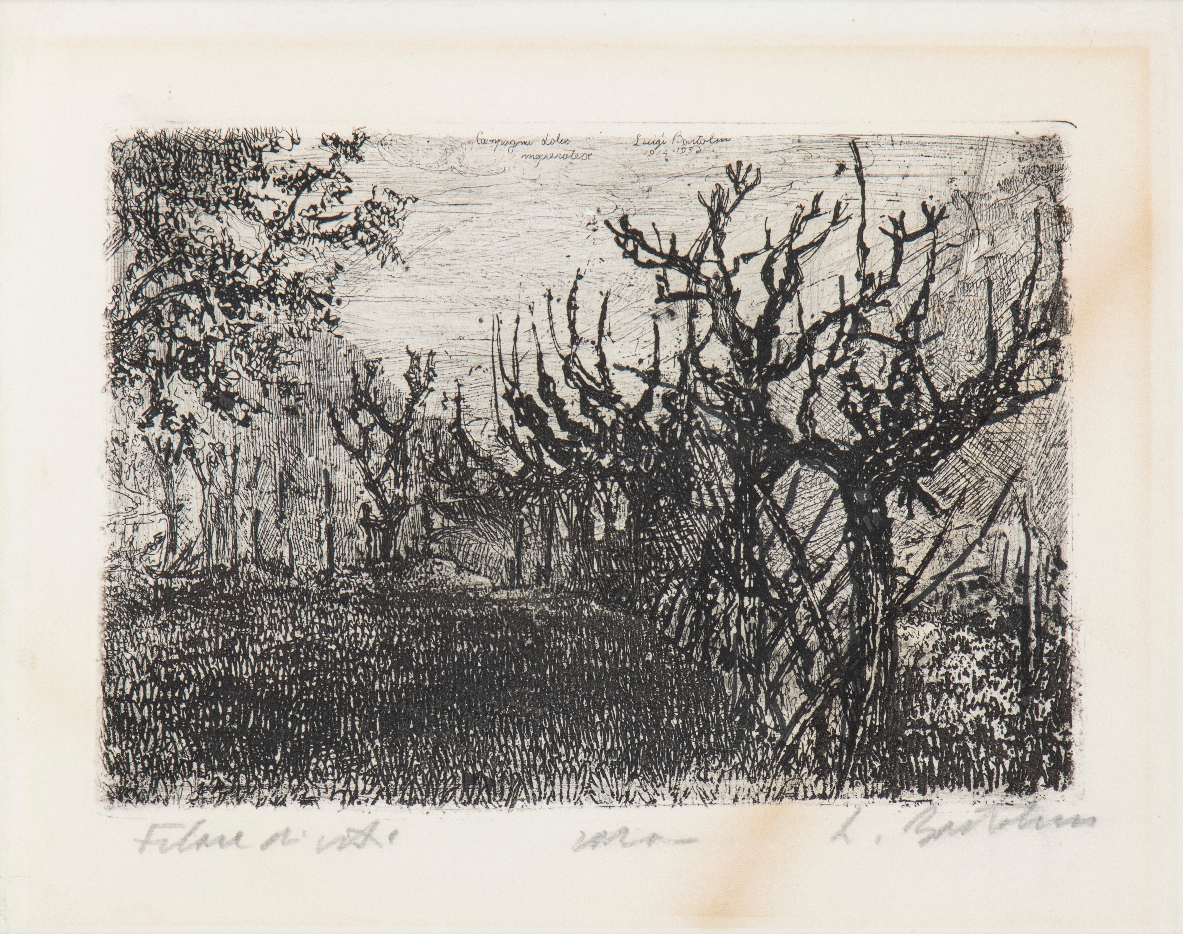 Acquaforte, 170 x 240 mm (lastra), 240 x 295 mm (foglio). II stato, con titolo "Campagna dolce maceratese", firma e data (1914-1936) incisi in lastra. Titolo, nota manoscritta "rara" e firma a matita in basso. Petrucci 281 (1930, tre esemplari), Barsanti 319 (1930, tre esemplari).