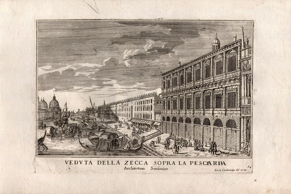 Belle impressioni stampate su carta vergata (una con filigrana non identificata, un'altra con filigrana Tre lune, terza su una porzione di carta senza filigrana). Esemplari con grandi margini, in ottimo stato di conservazione generale salvo leggerissime bruniture lungo i bordi e integrazioni triangolari sui margini superiori di due fogli (Ponte di Rialto e Veduta della Zecca)