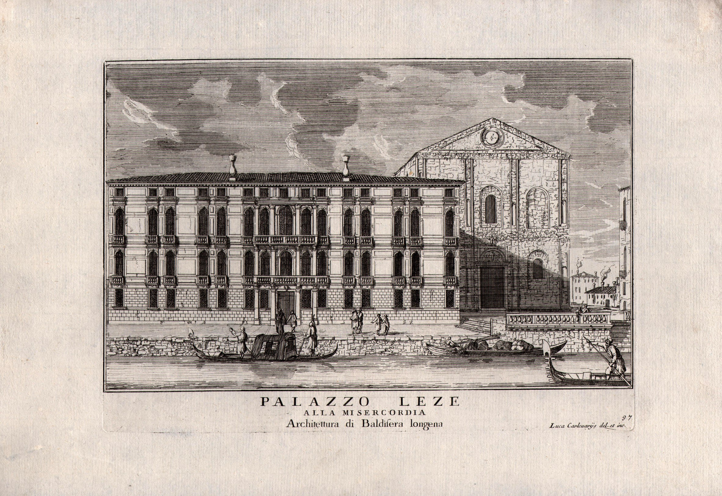 Lotto di tre incisioni tratte da "Le Fabriche e Vedute di Venezia disegnate, poste in prospettiva ed intagliate da Luca Carlevarjis con privilegi”. Acquaforte, 270 x 400 mm ca. (cad. foglio).