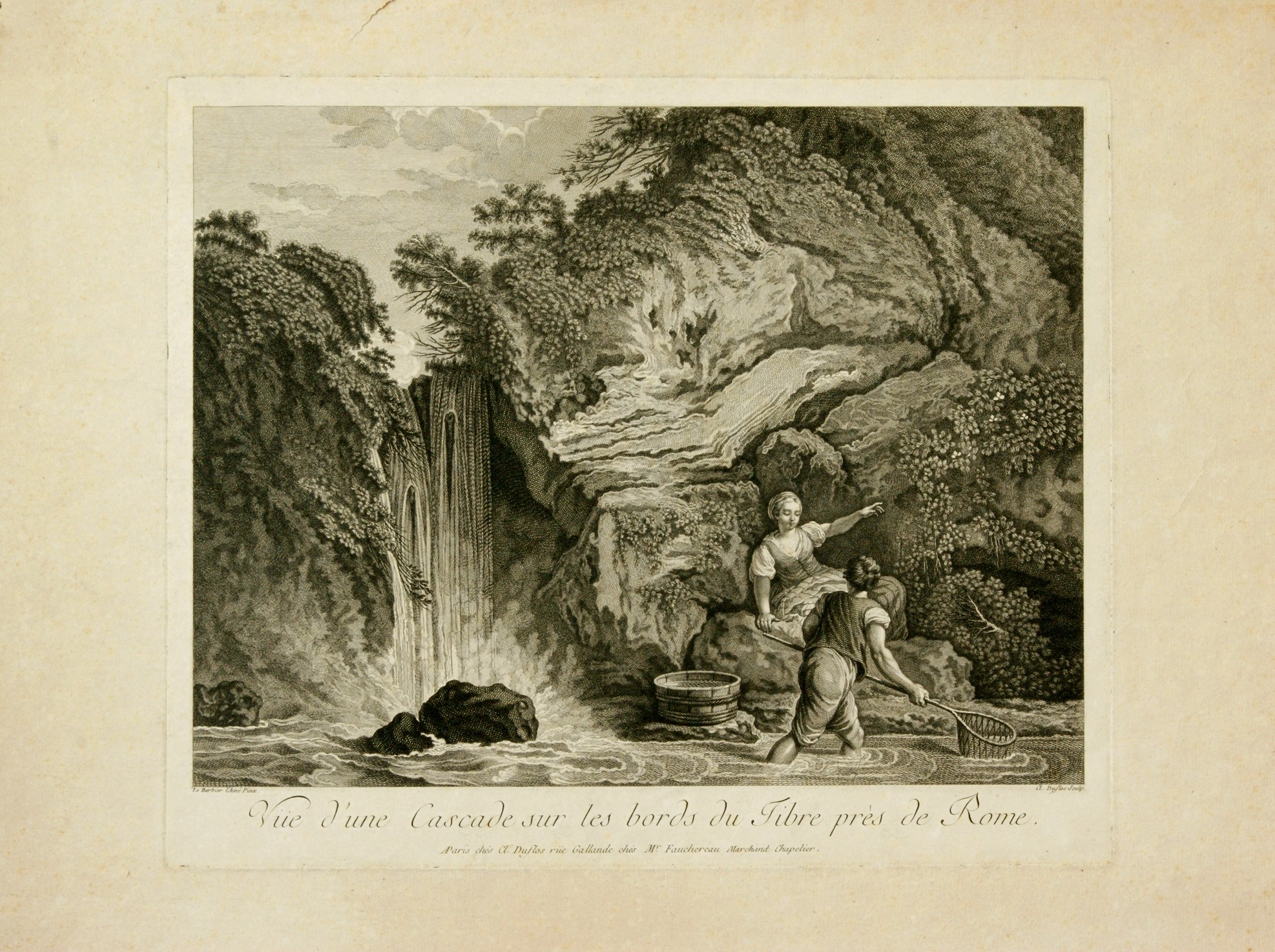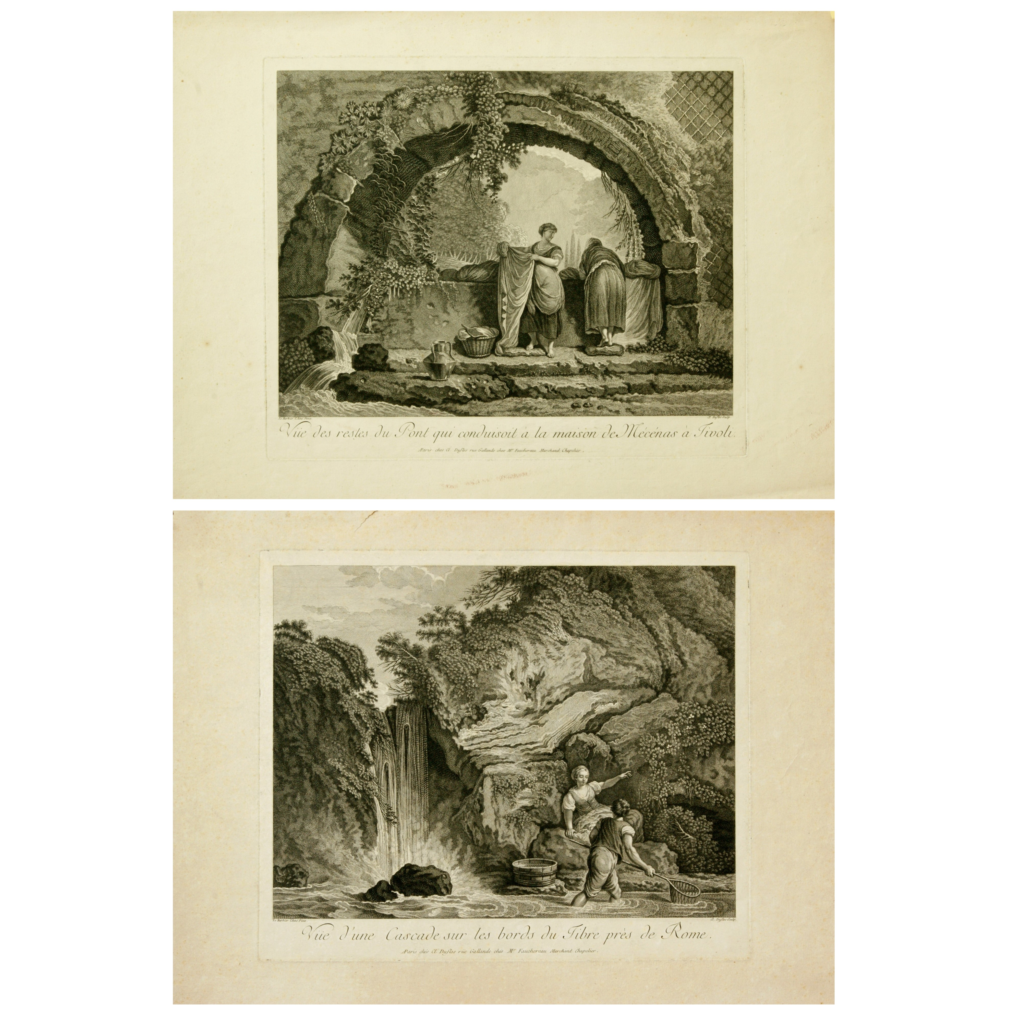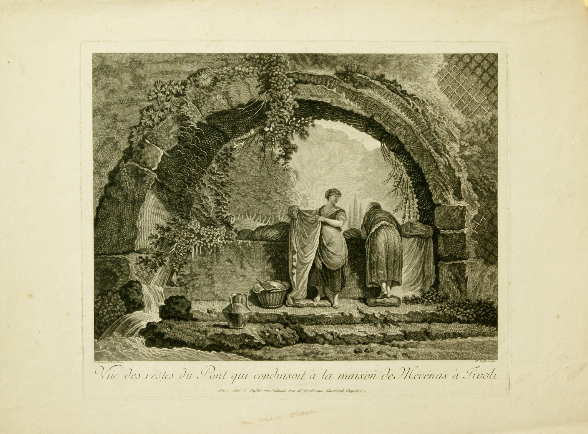 Veduta di una cascata sulle rive del Tevere vicino a Roma | Veduta dei resti del ponte che conduceva alla casa di Mecenate a Tivoli
