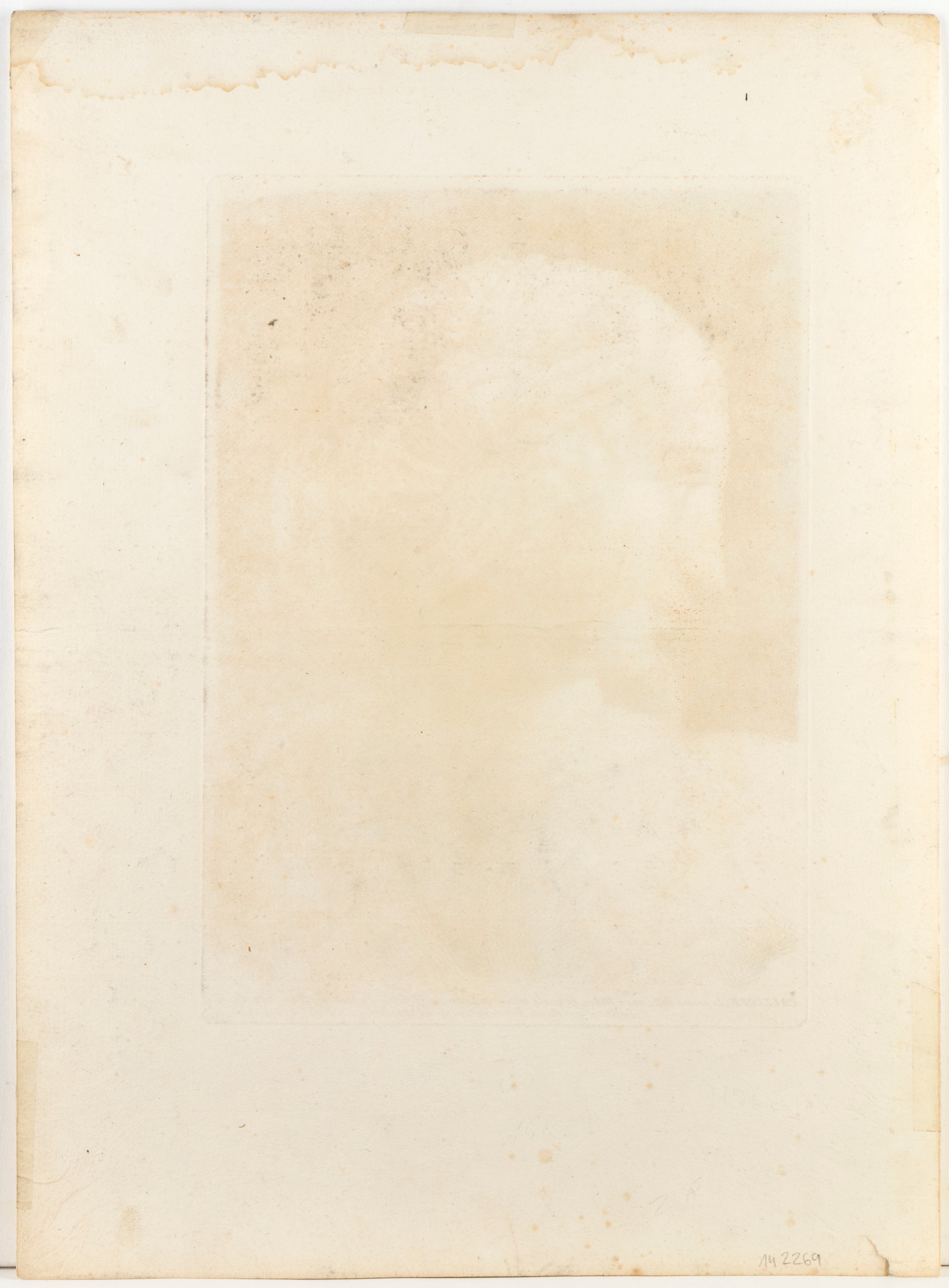 Bella impressione ad inchiostro marrone su carta vergata recante filigrana “Mezzo busto di uomo inserito in un doppio cerchio, con sotto la scritta S.PETRUS”. Foglio con grandi margini oltre l’impronta della lastra, una leggera gora di umidità al bordo alto che non interessa la parte incisa, nel complesso in buono stato generale di conservazione.