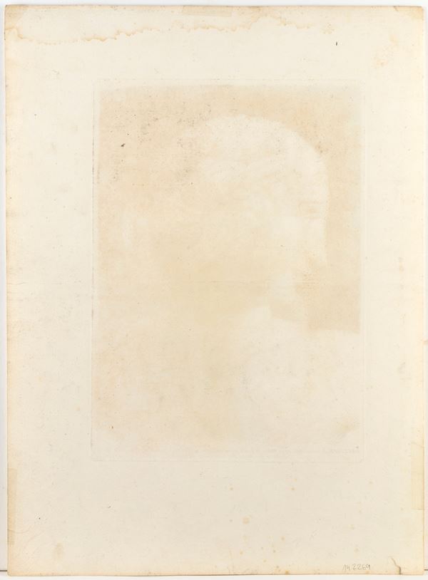 Bulino, 377 x 268 mm (lastra), 560 x 410 mm (foglio). Tratta da “Recueil de Tetes Choisies de Personnages illustres dans les lettres et dans les armes éxactement dessinées et gravées de la grandeur des originaux par Paul Fidanza peintre romain” pubblicata dagli editori Bouchard e Gravier a Roma nel 1785. LeBlanc II.226.6
