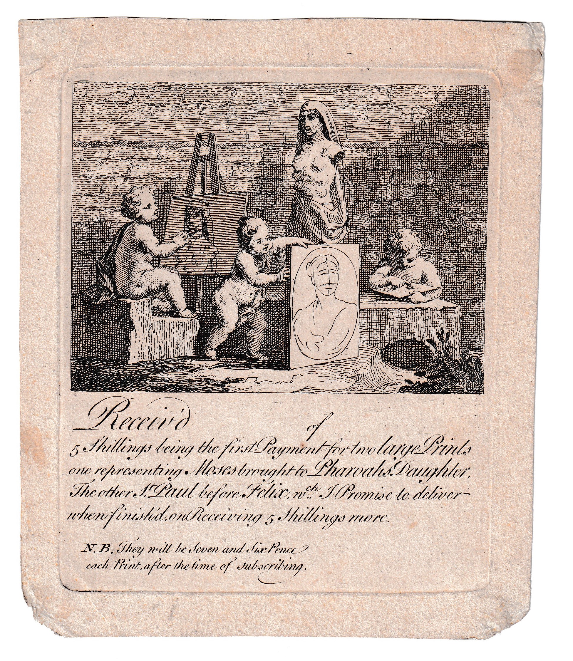 Biglietto di abbonamento per "Mosè portato alla figlia del faraone" e "San Paolo davanti a Felice". Il biglietto è stato utilizzato originariamente per "A Harlot's Progress", poi per "The Four Times of the Day" e "Strolling Actresses".