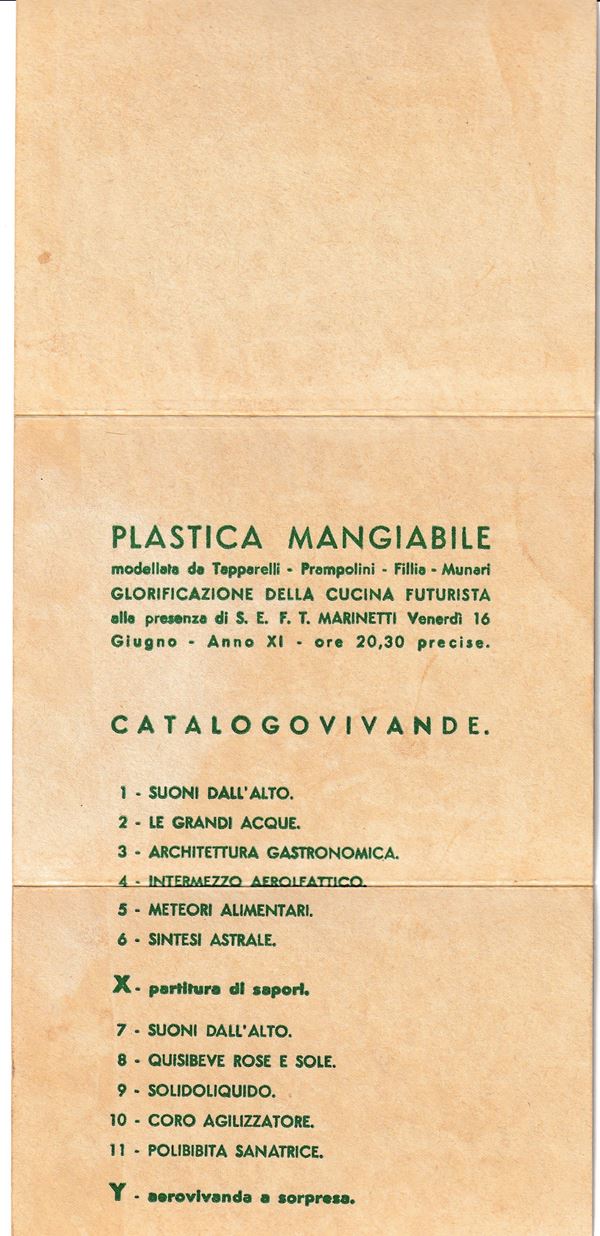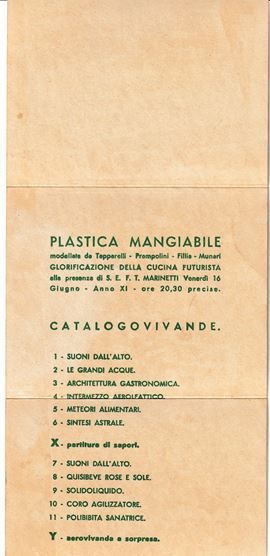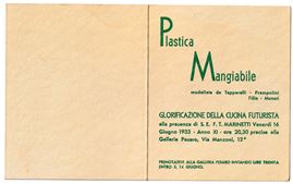 Plastica Mangiabile modellata da Tapparelli - Prampolini - Fillia - Munari. Glorificazione della cucina futurista alla presenza di S. E. F. T. Marinetti venerdì 16 giugno 1933 – anno XI – ore 20.30 precise alla Galleria Pesaro, Via Manzoni 12.